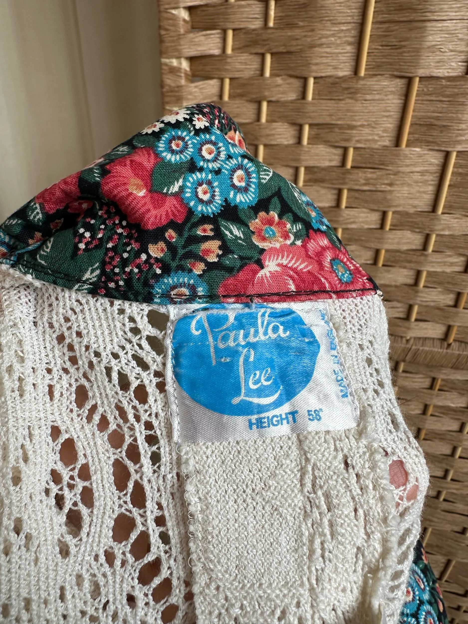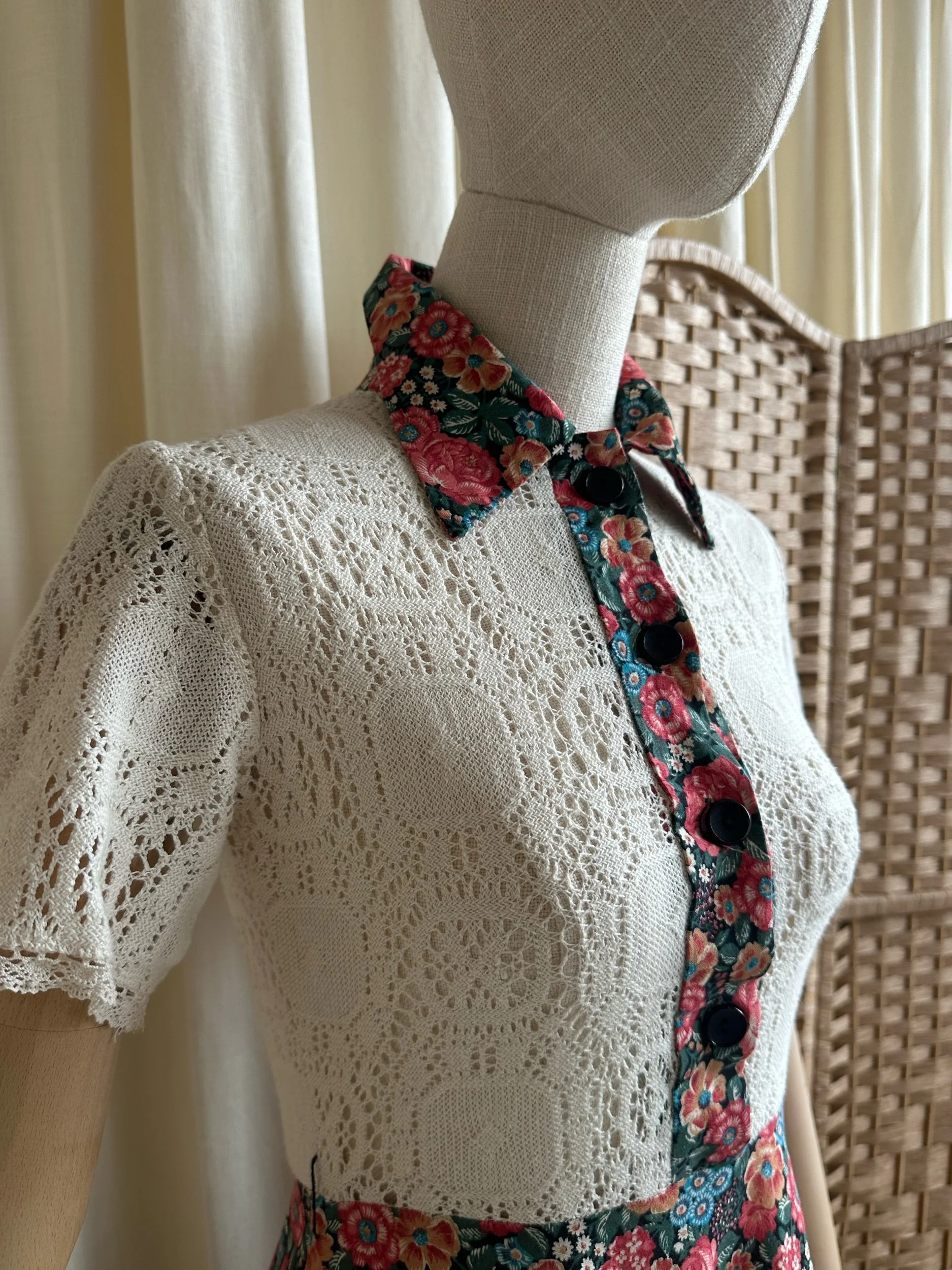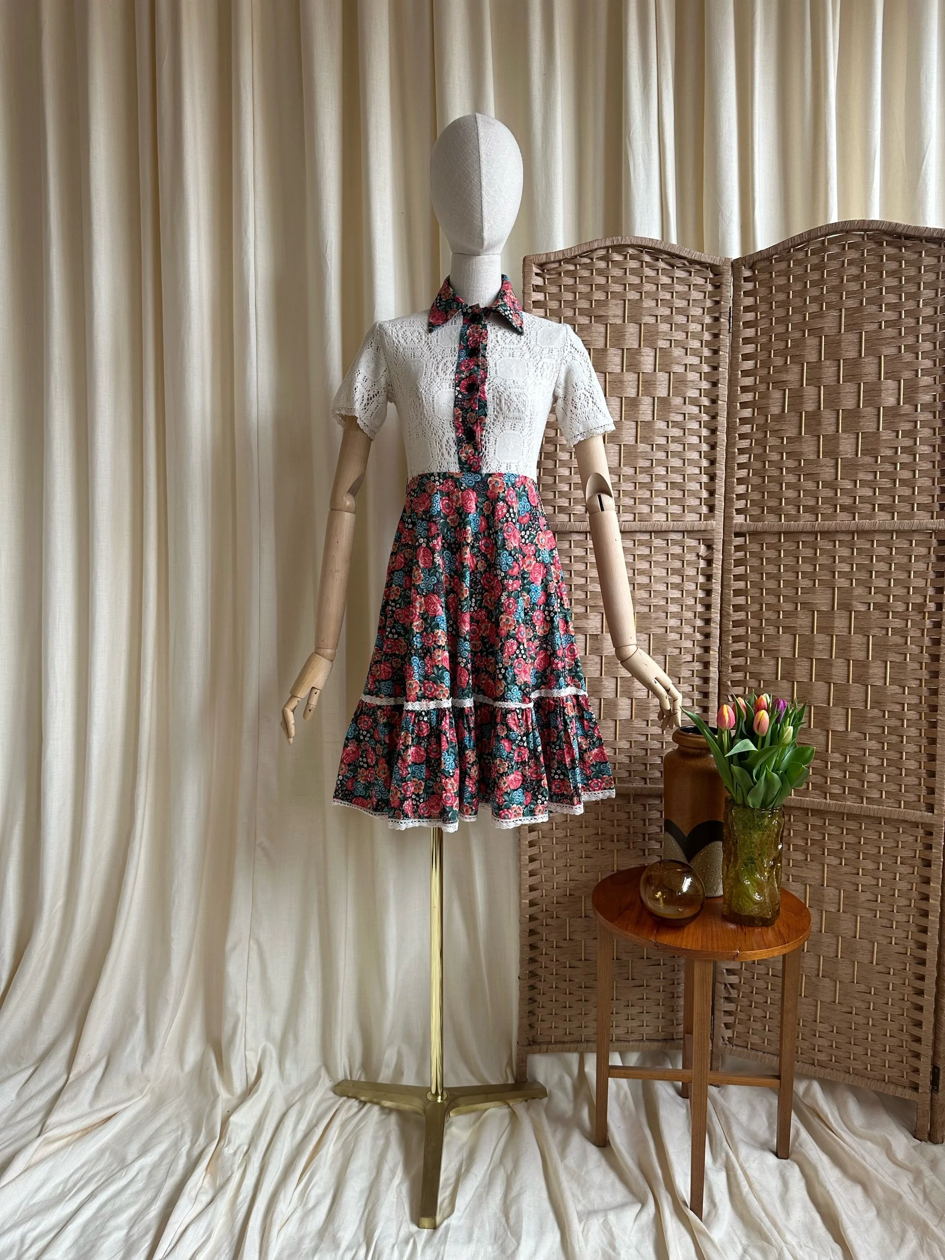 Meet Camellia! The sweetest 1970s tea dress by “Paula Lee”. Made from cotton with a cream crochet lace top and stunning floral, full skirt. With a dagger style collar, button down front and crochet trim on the skirt. The top is fitted and the skirt is full, falling around/below the knee. In great condition with no noticeable signs of wear. The perfect summer dress for every day or even a special occasion.