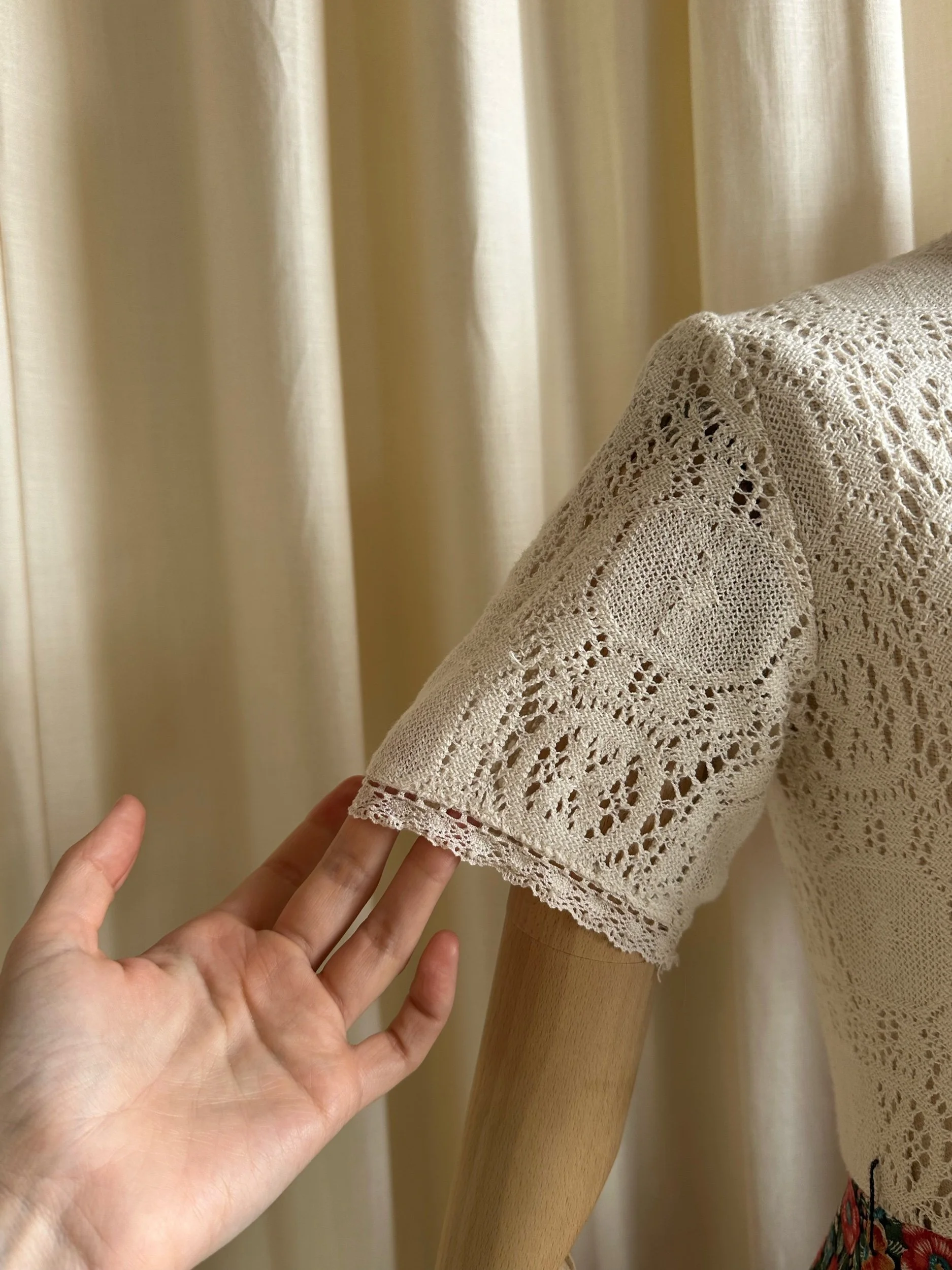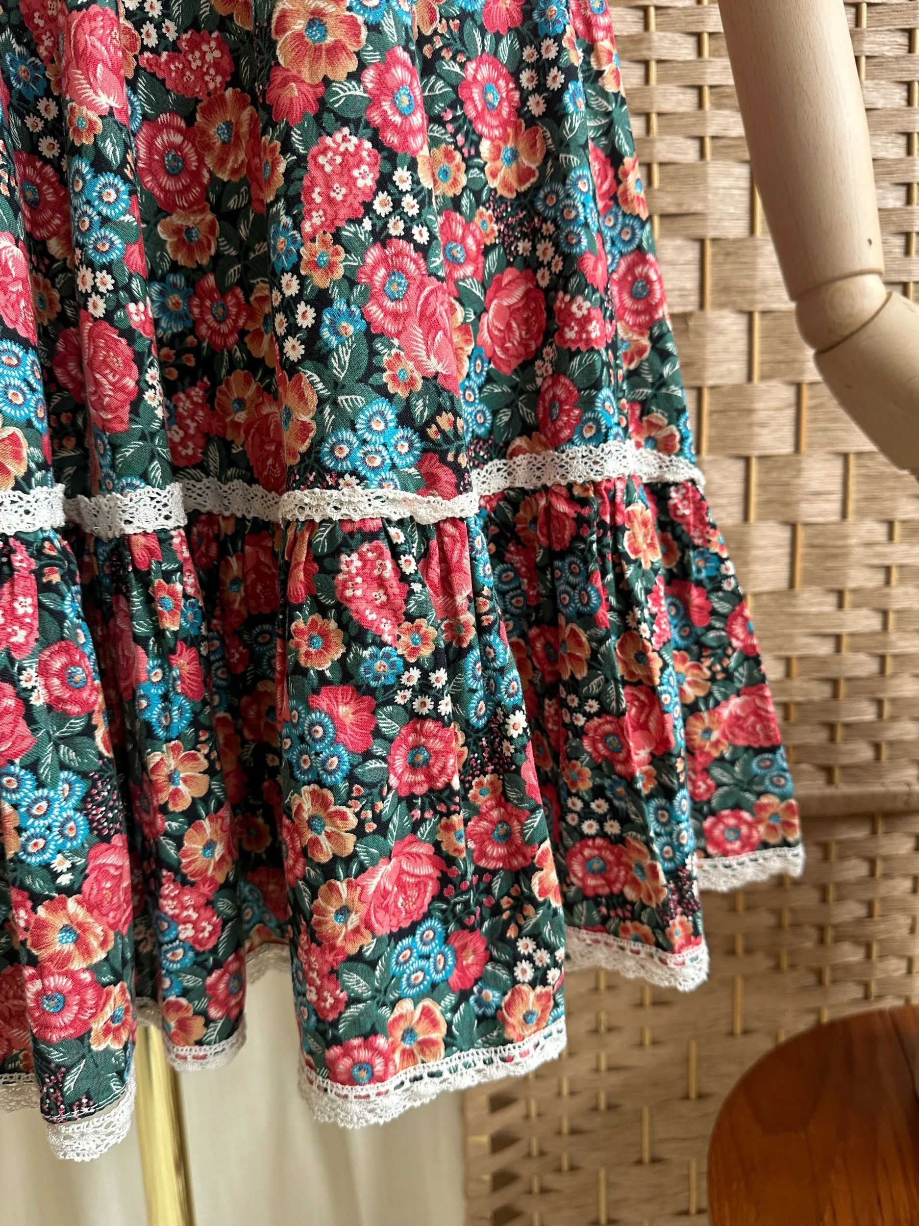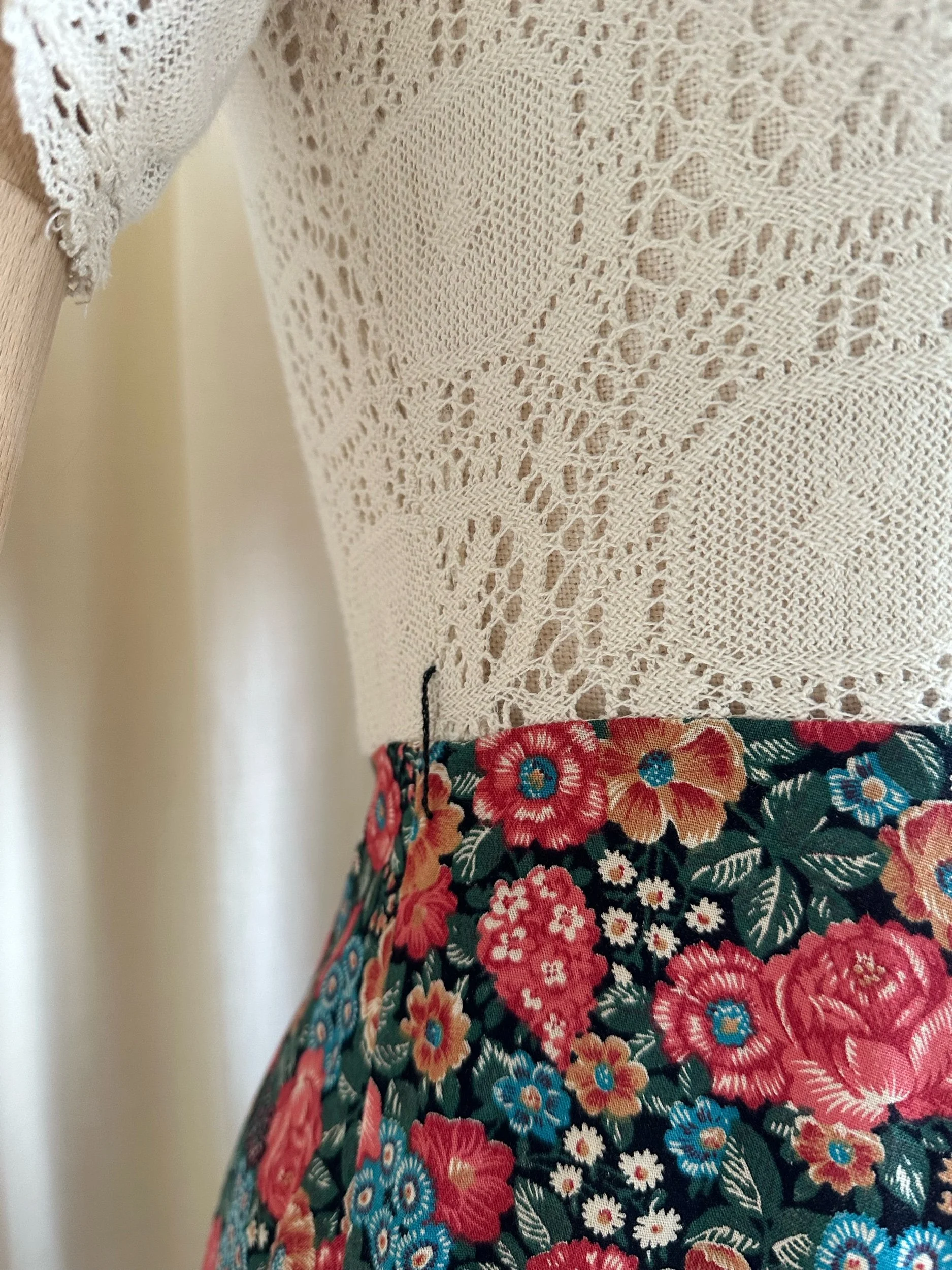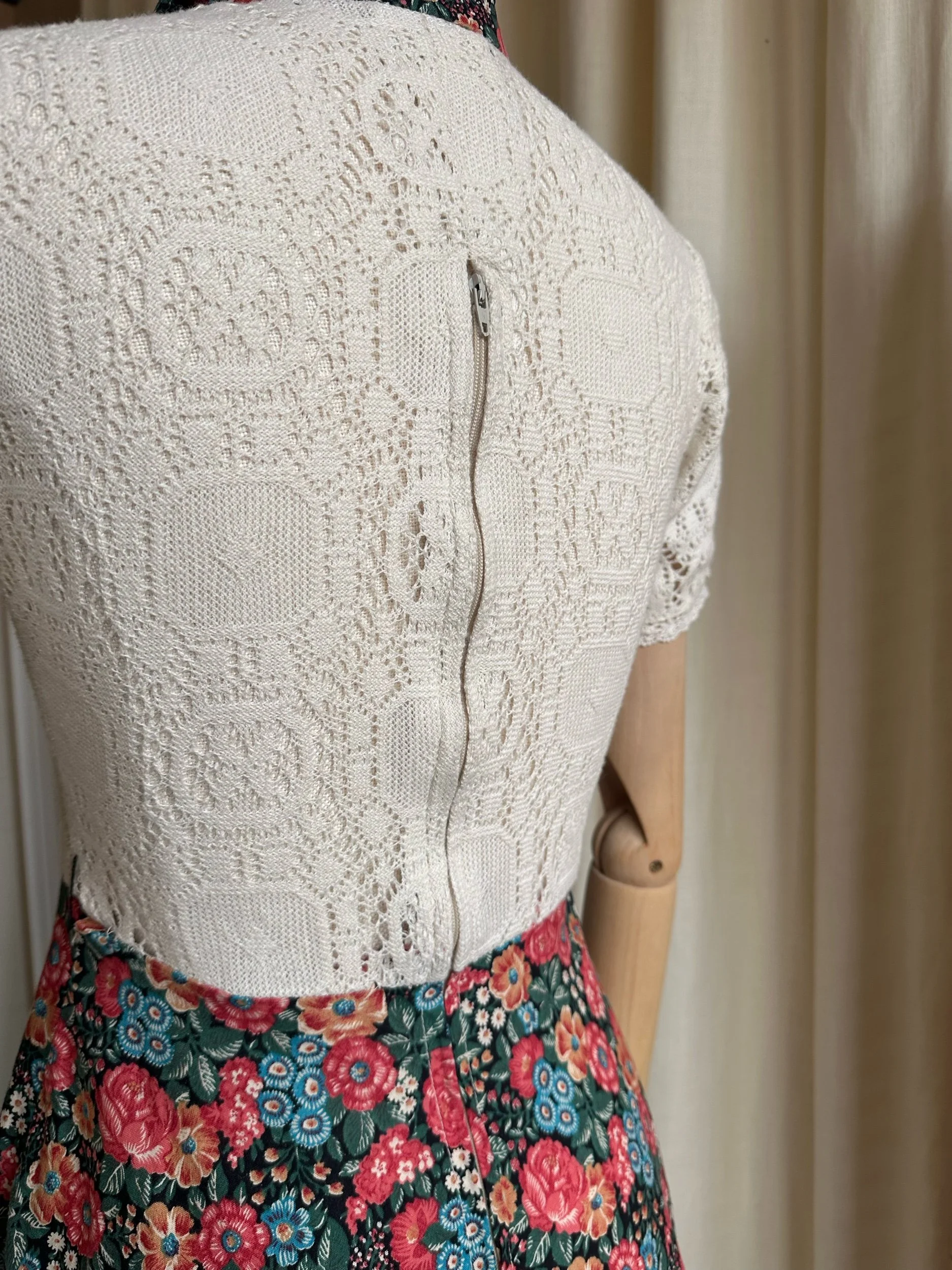 Meet Camellia! The sweetest 1970s tea dress by “Paula Lee”. Made from cotton with a cream crochet lace top and stunning floral, full skirt. With a dagger style collar, button down front and crochet trim on the skirt. The top is fitted and the skirt is full, falling around/below the knee. In great condition with no noticeable signs of wear. The perfect summer dress for every day or even a special occasion.