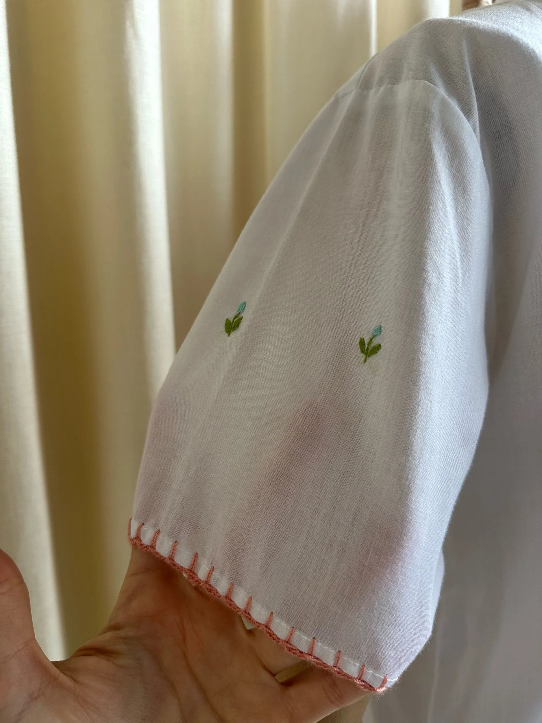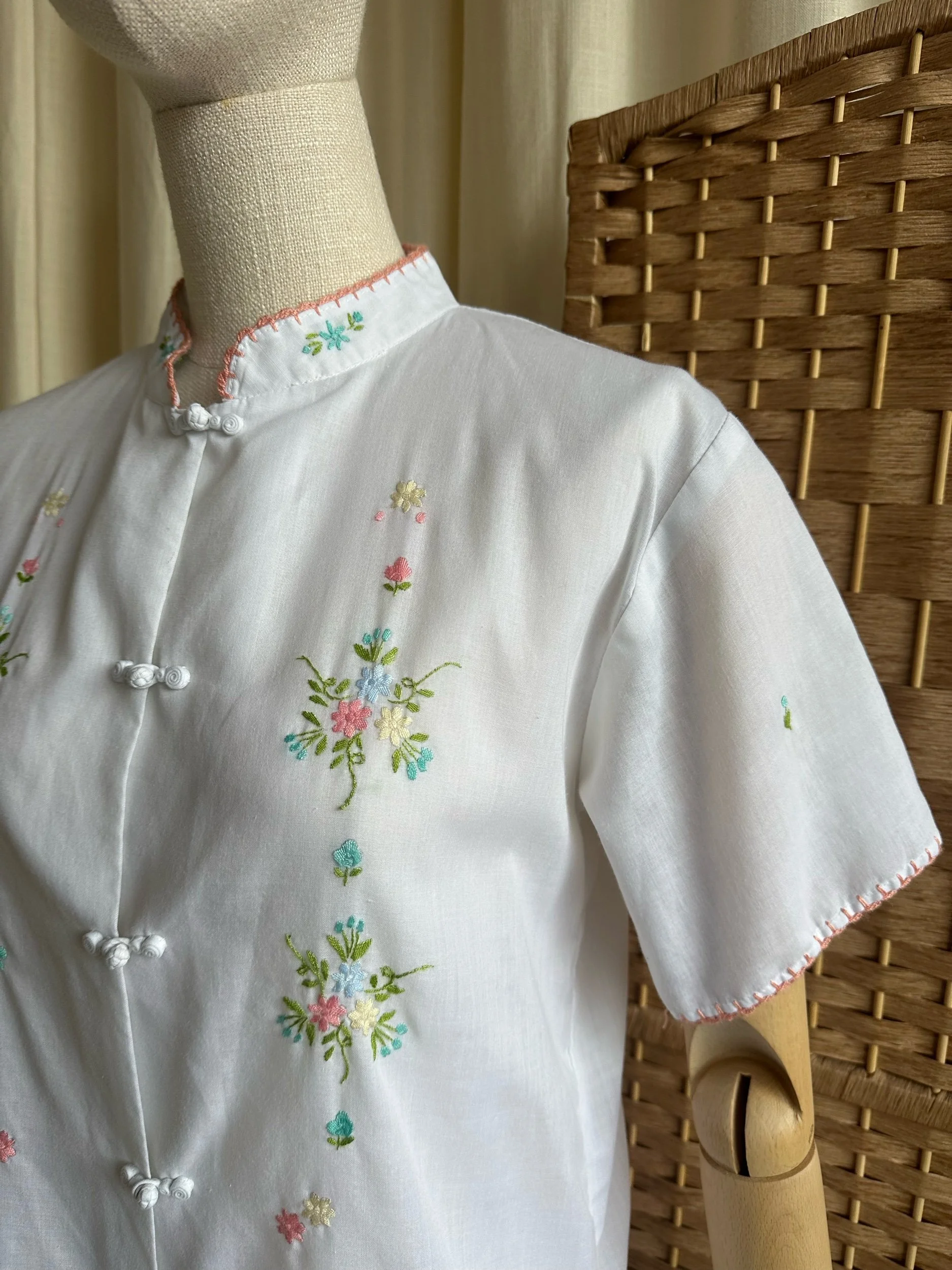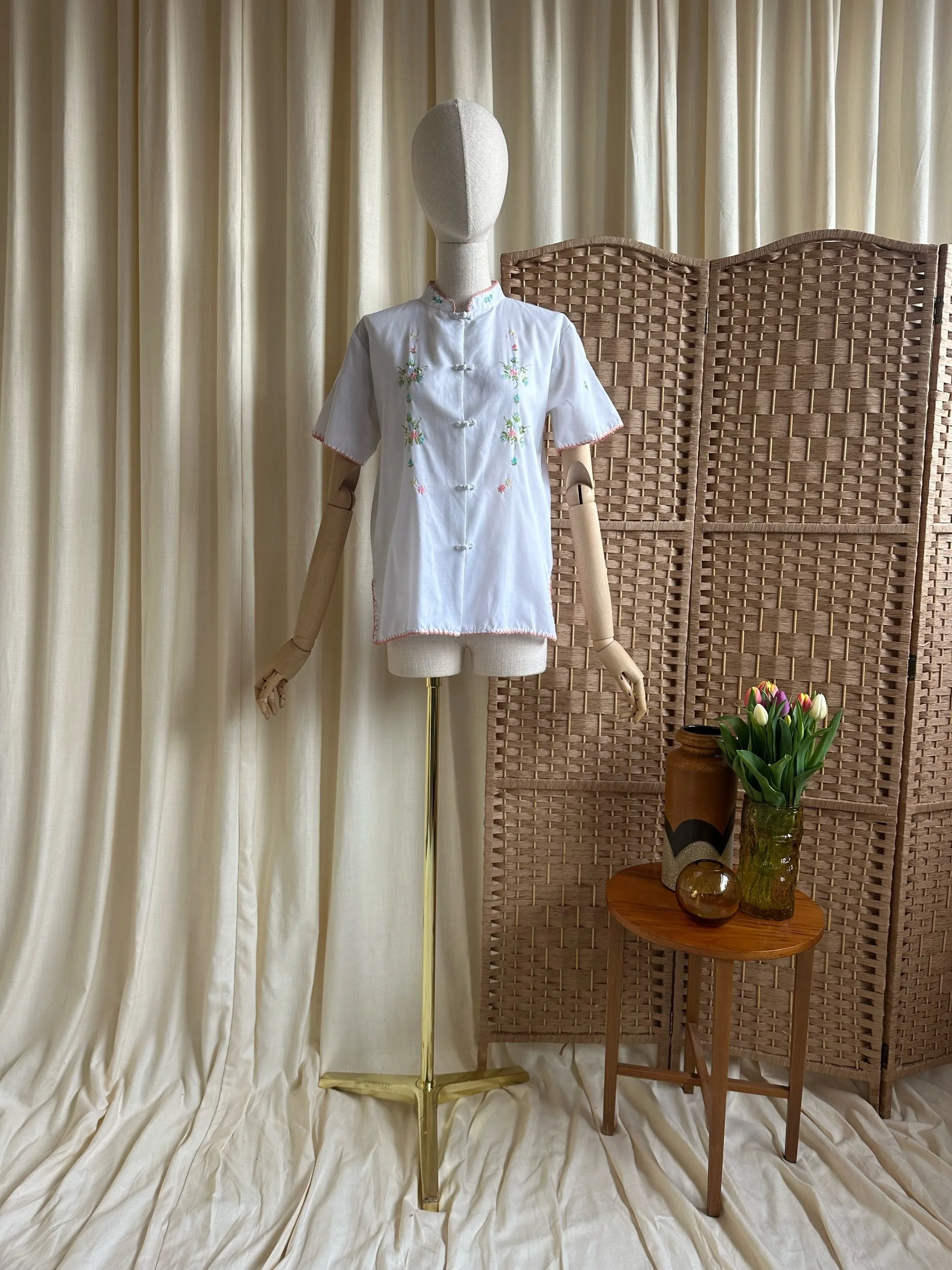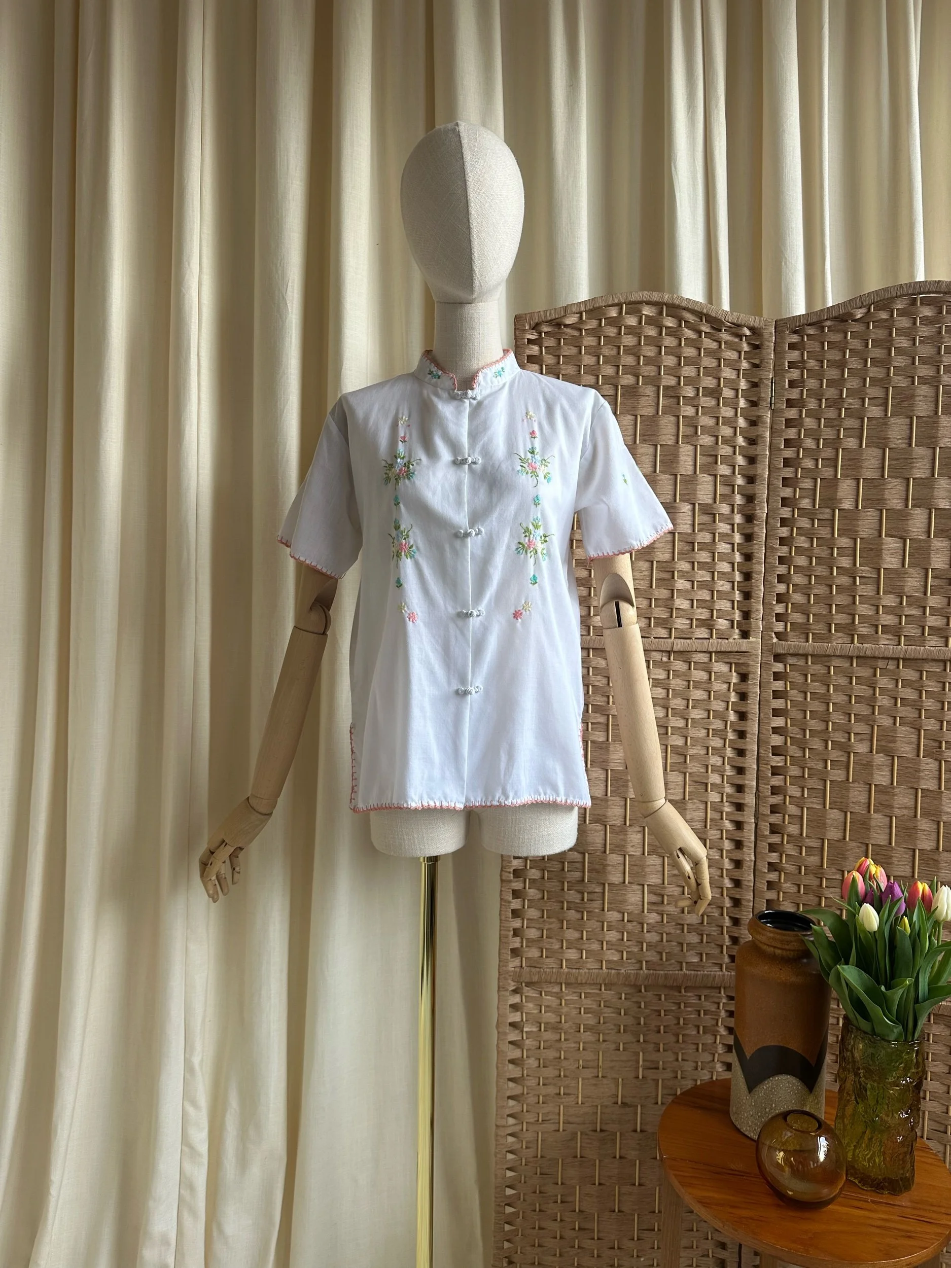 Introducing the truly lovely Posie blouse in an off white poly/cotton mix. This vintage piece was made in Thailand featuring the most beautiful floral embroidery detailing on the front, collar and sleeves. With blanket stitching trimming on the Mandarin style collar, short sleeves and bottom hem. With no hugely noticeable signs of wear, just some very slight pilling to the fabric. A great piece for spring/summer, style with your favourite jeans and you’re good to go!