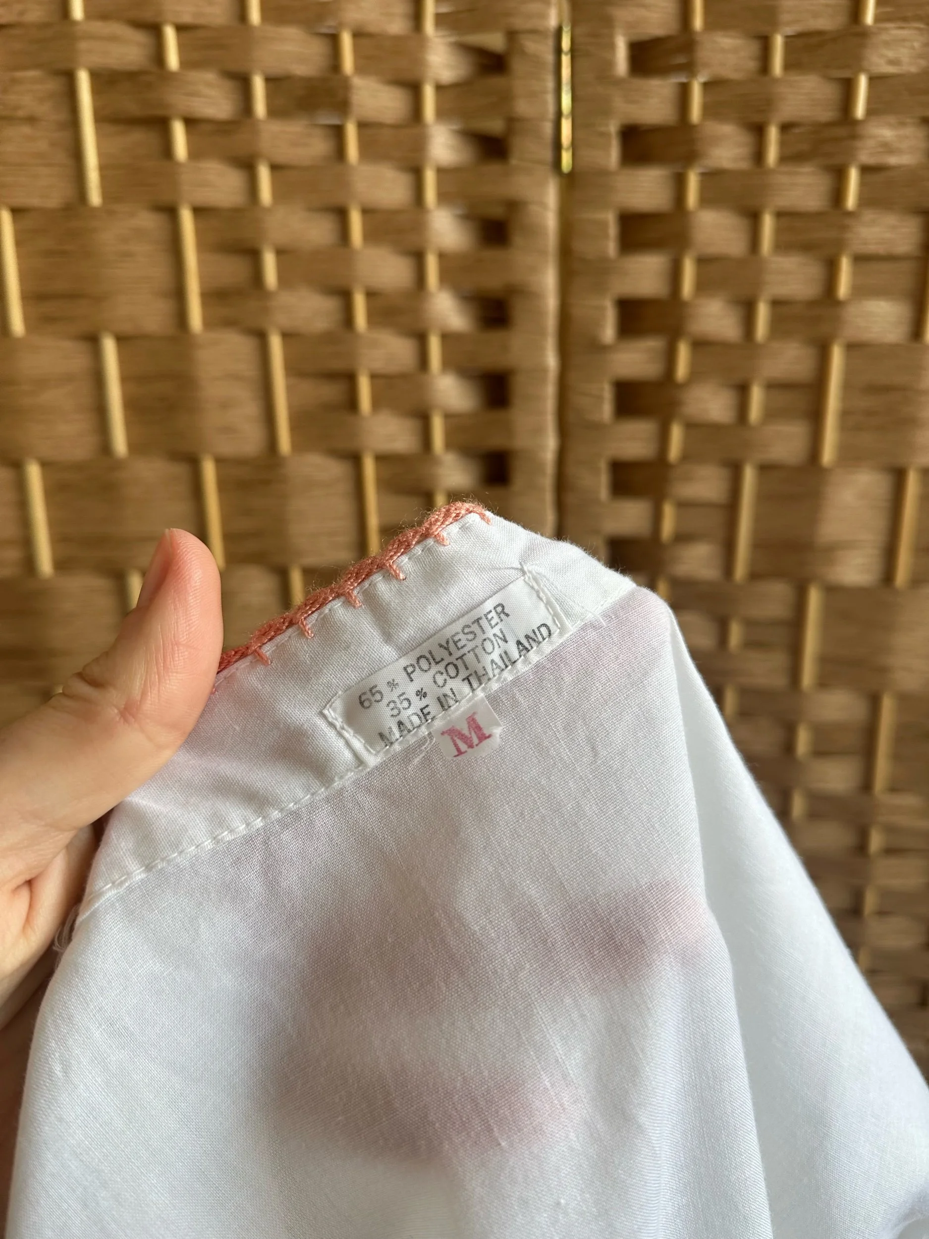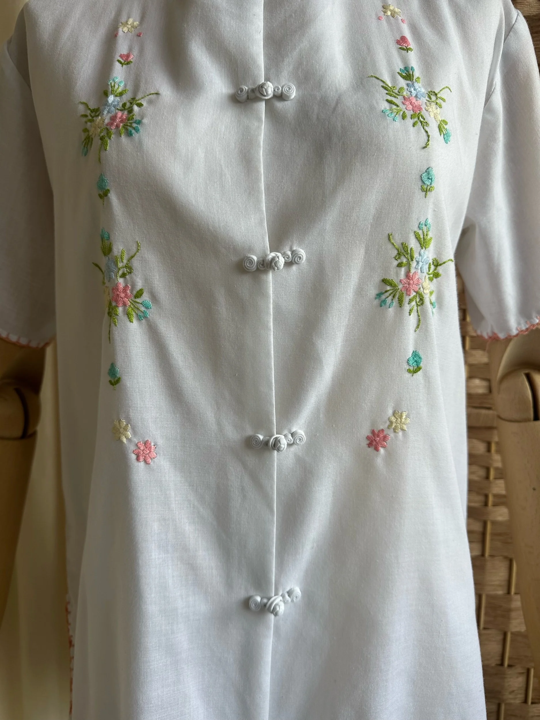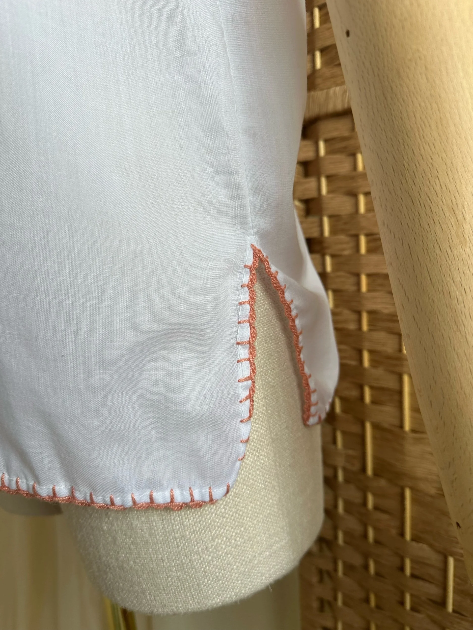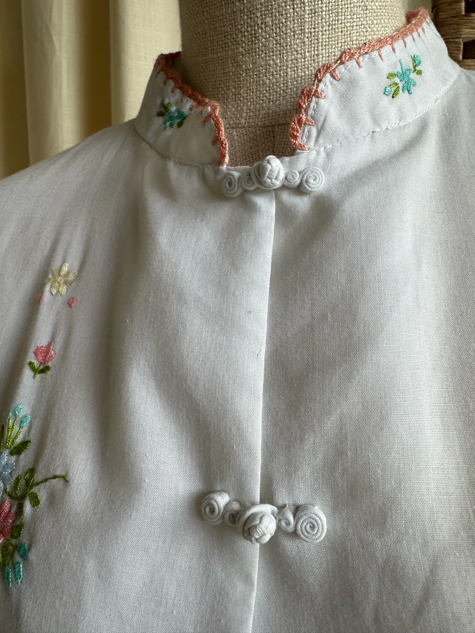 Introducing the truly lovely Posie blouse in an off white poly/cotton mix. This vintage piece was made in Thailand featuring the most beautiful floral embroidery detailing on the front, collar and sleeves. With blanket stitching trimming on the Mandarin style collar, short sleeves and bottom hem. With no hugely noticeable signs of wear, just some very slight pilling to the fabric. A great piece for spring/summer, style with your favourite jeans and you’re good to go!