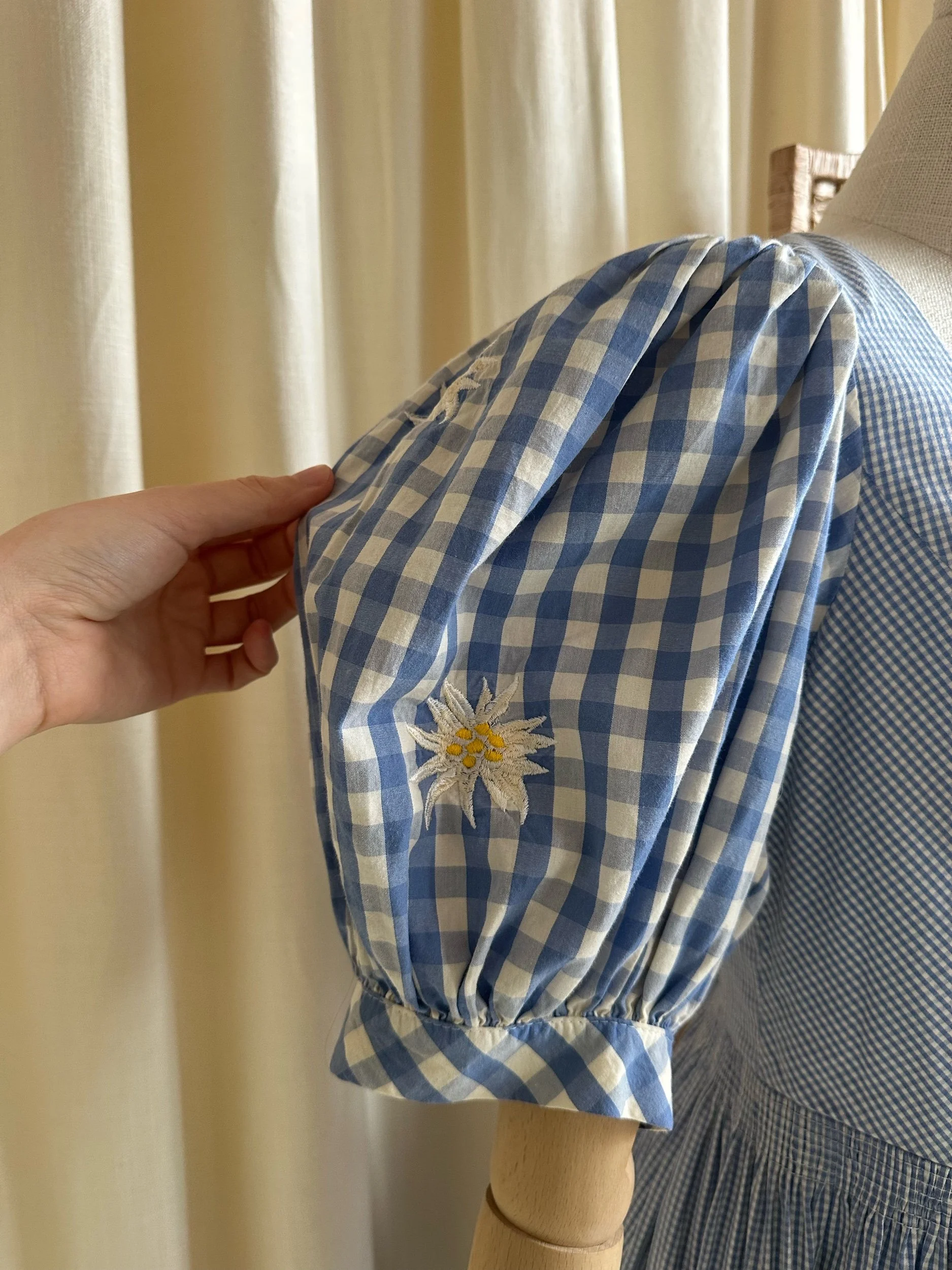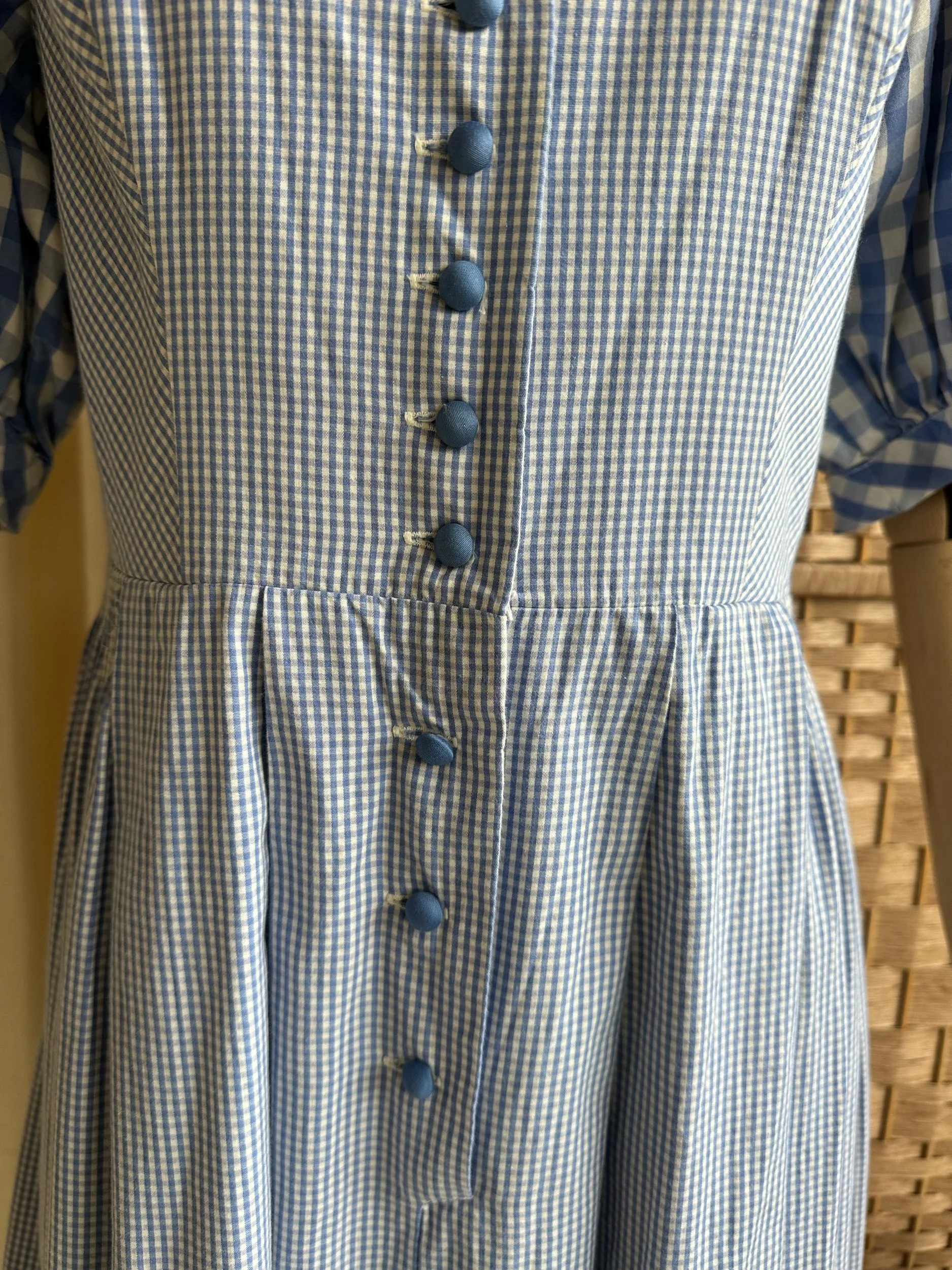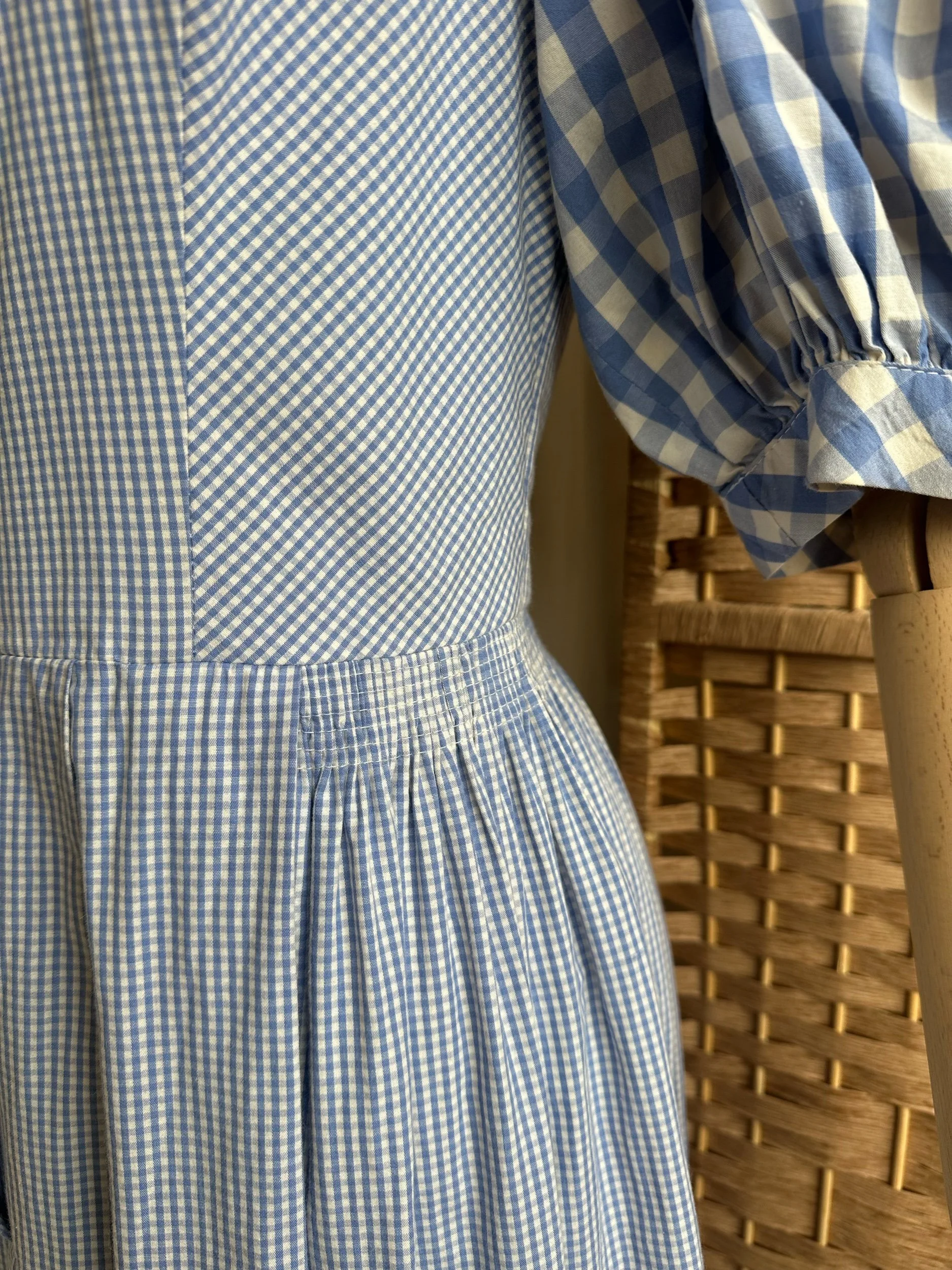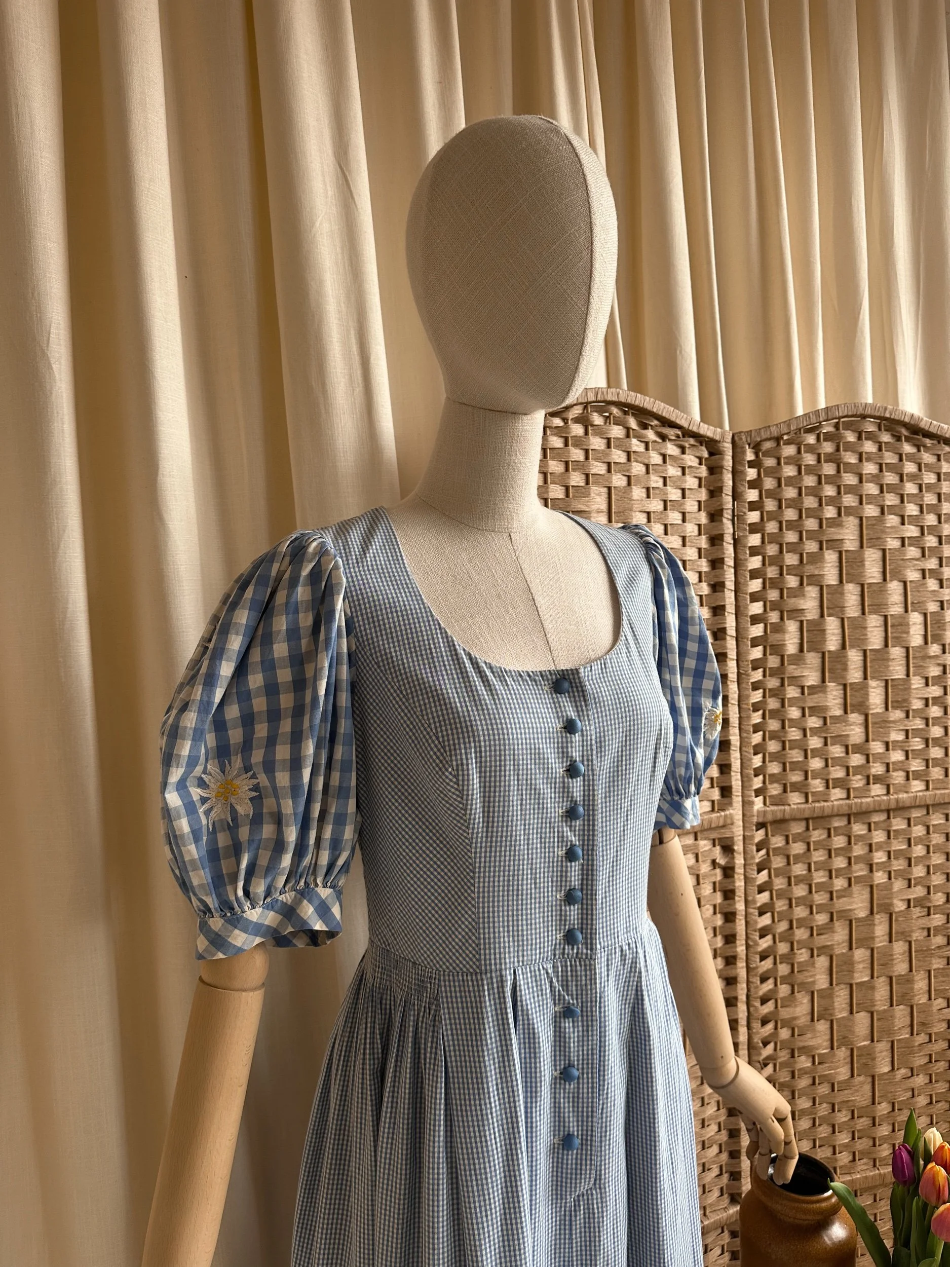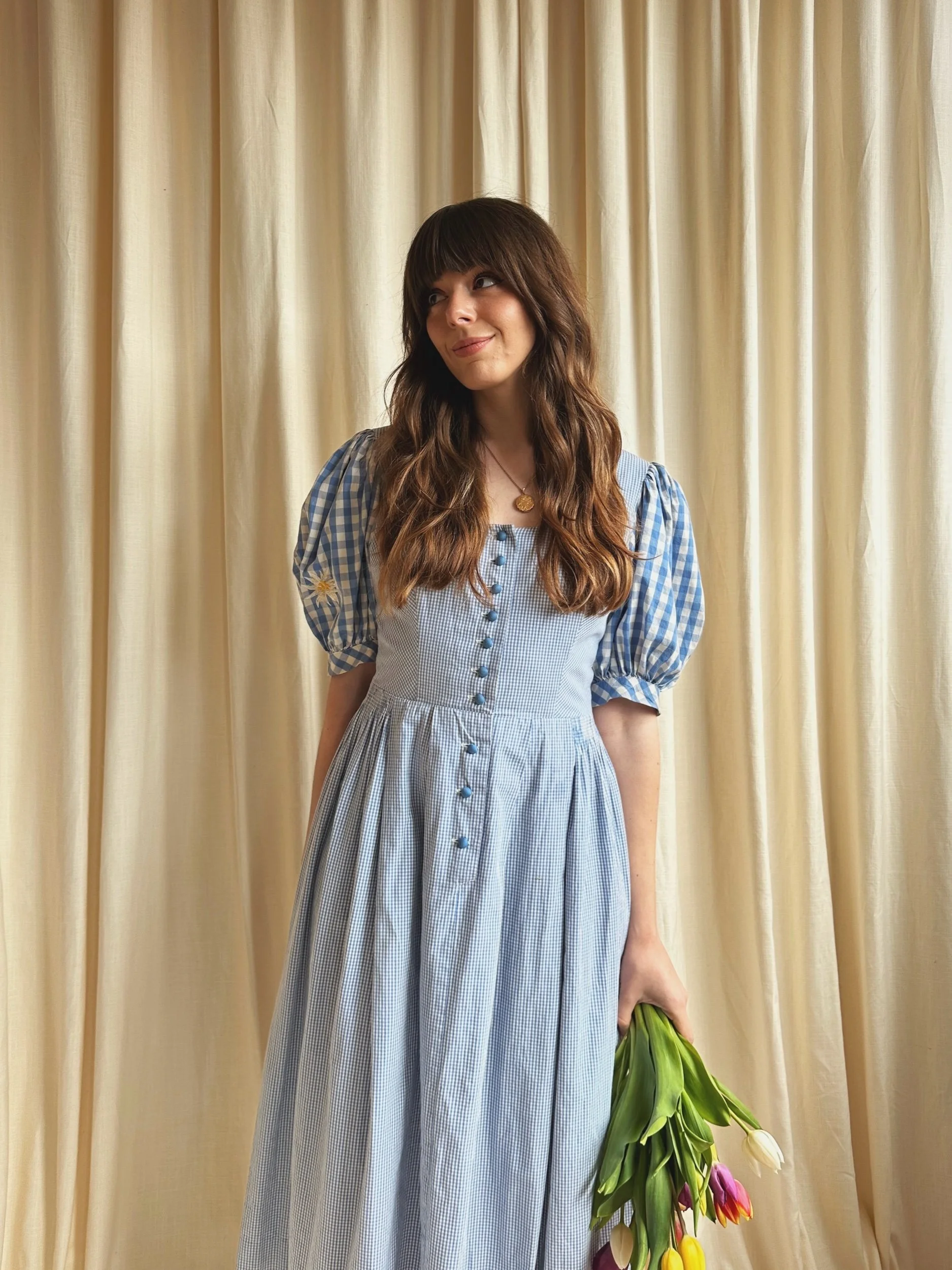 Meet Josephine, an incredible 1970s midi summer dress in a blue gingham check fabric. Made from 100% cotton and fully lined with a scoop neckline, button down front and puff sleeves. The top is fitted and the skirt is midi in length and full. There is a beautiful pleated smock detailing the waist and floral embroidery on the sleeves. In great condition with no noticeable signs of wear.