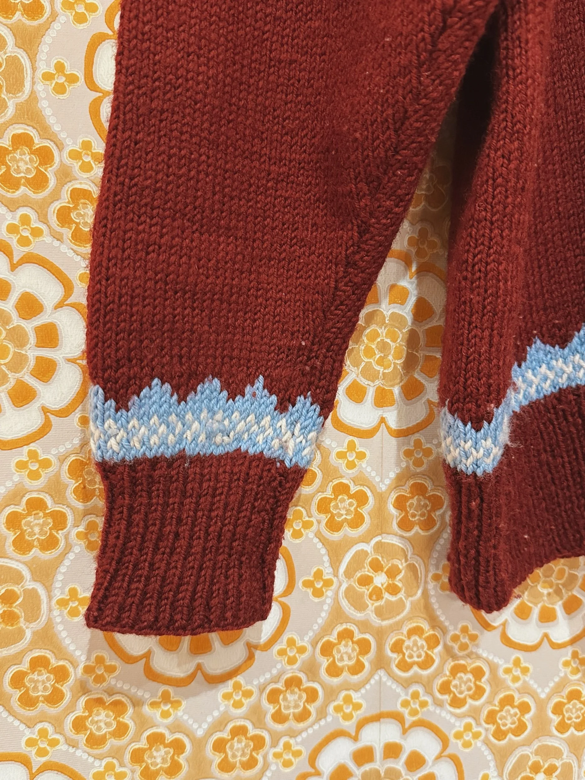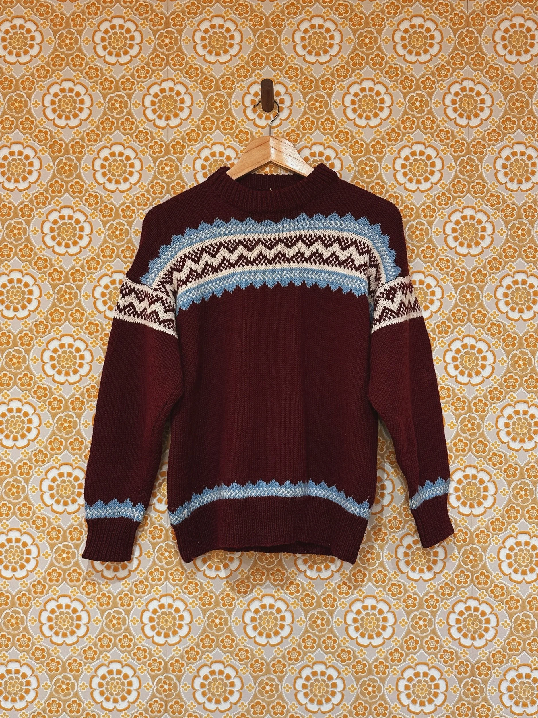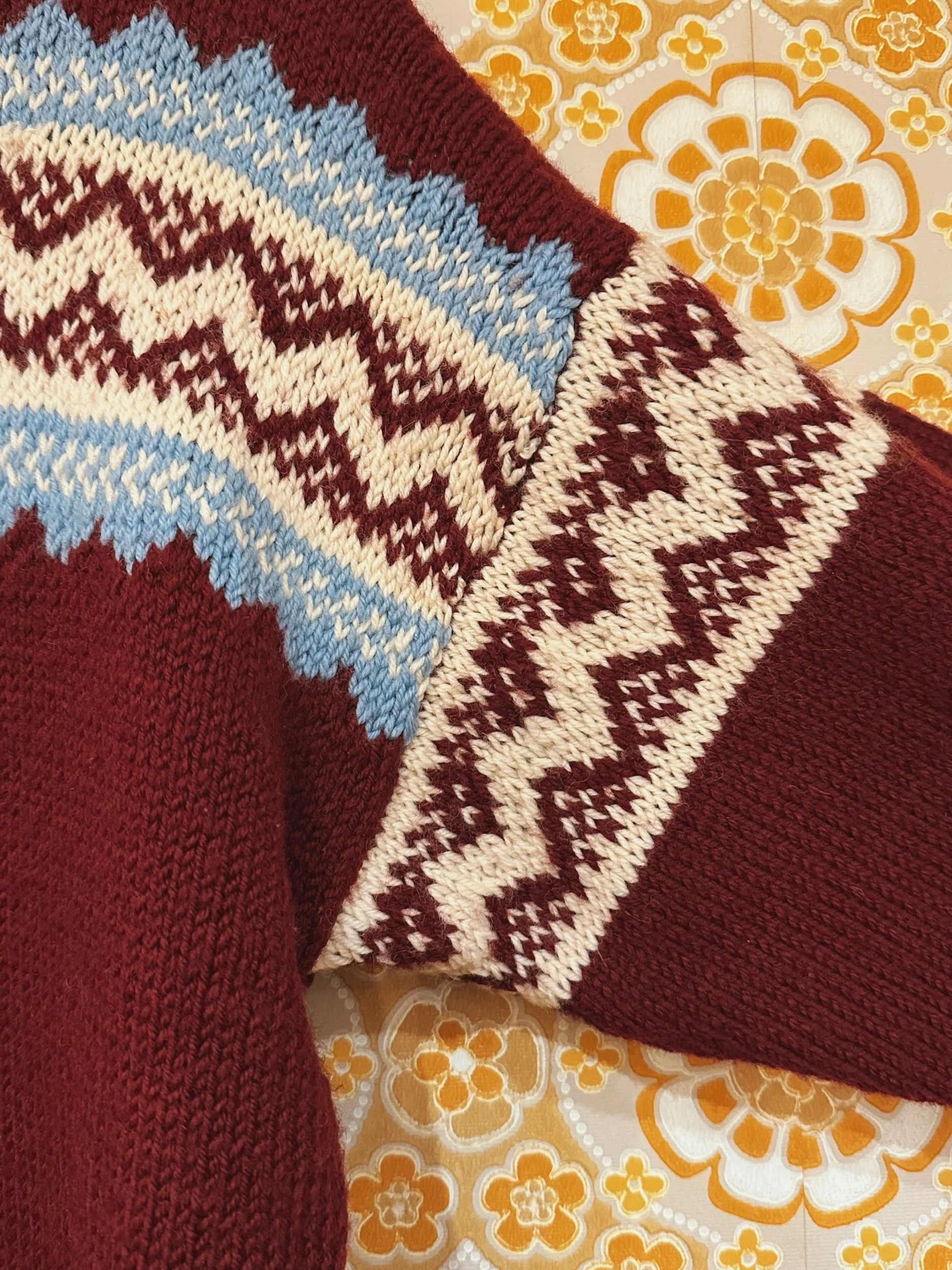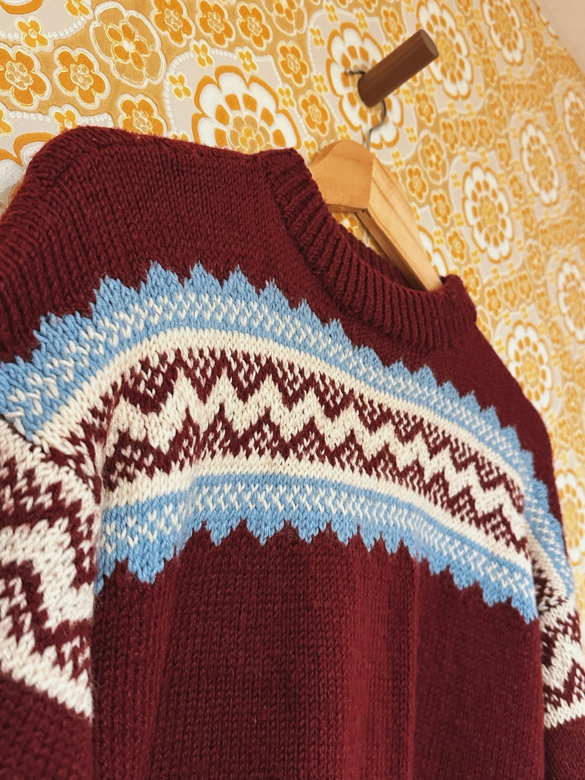Meet Alpine, the snuggly hand knitted 70s Fair Isle patterned jumper. In colours of burgundy, baby blue and cream. Because it’s homemade, there are no fabric composition labels but it feels like a wool mix yarn. The shape would fit an array of sizes, wear loose on a UK 8 or more fitted on a UK 14. There are no noticeable signs of wear aside from a little pilling to the fabric but this is to be expected with wool fabrics considering it’s age.