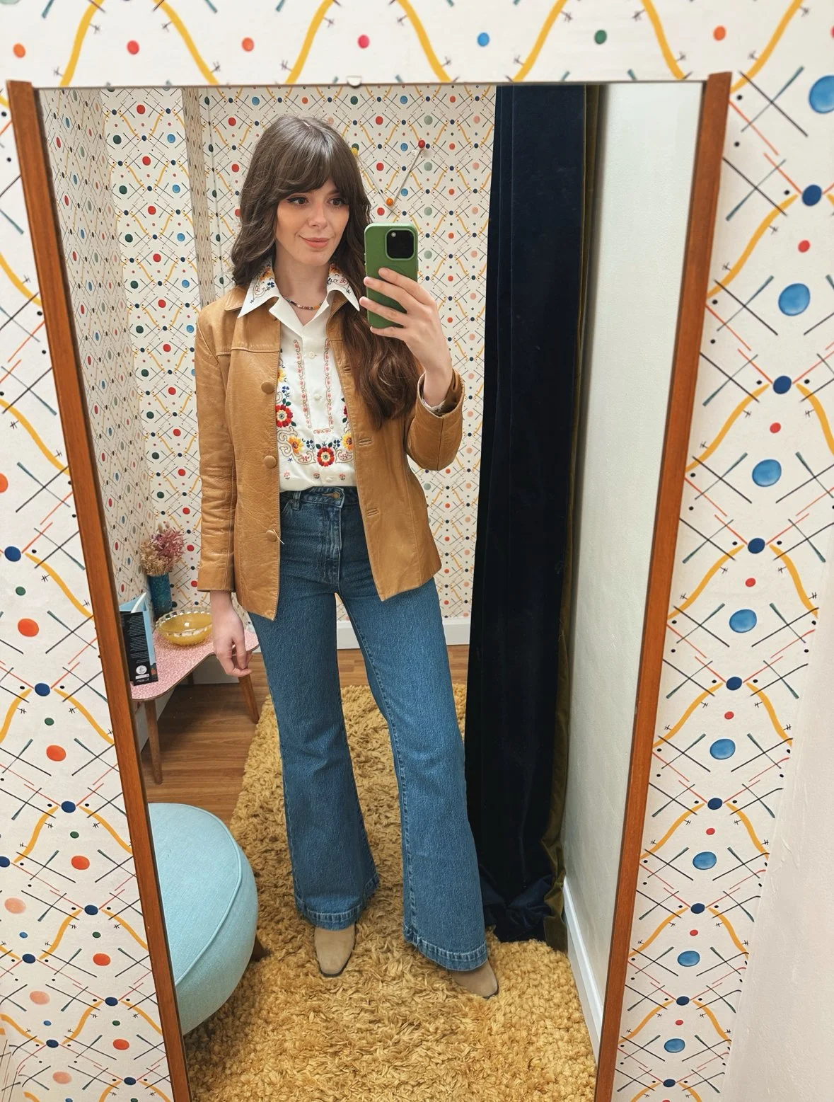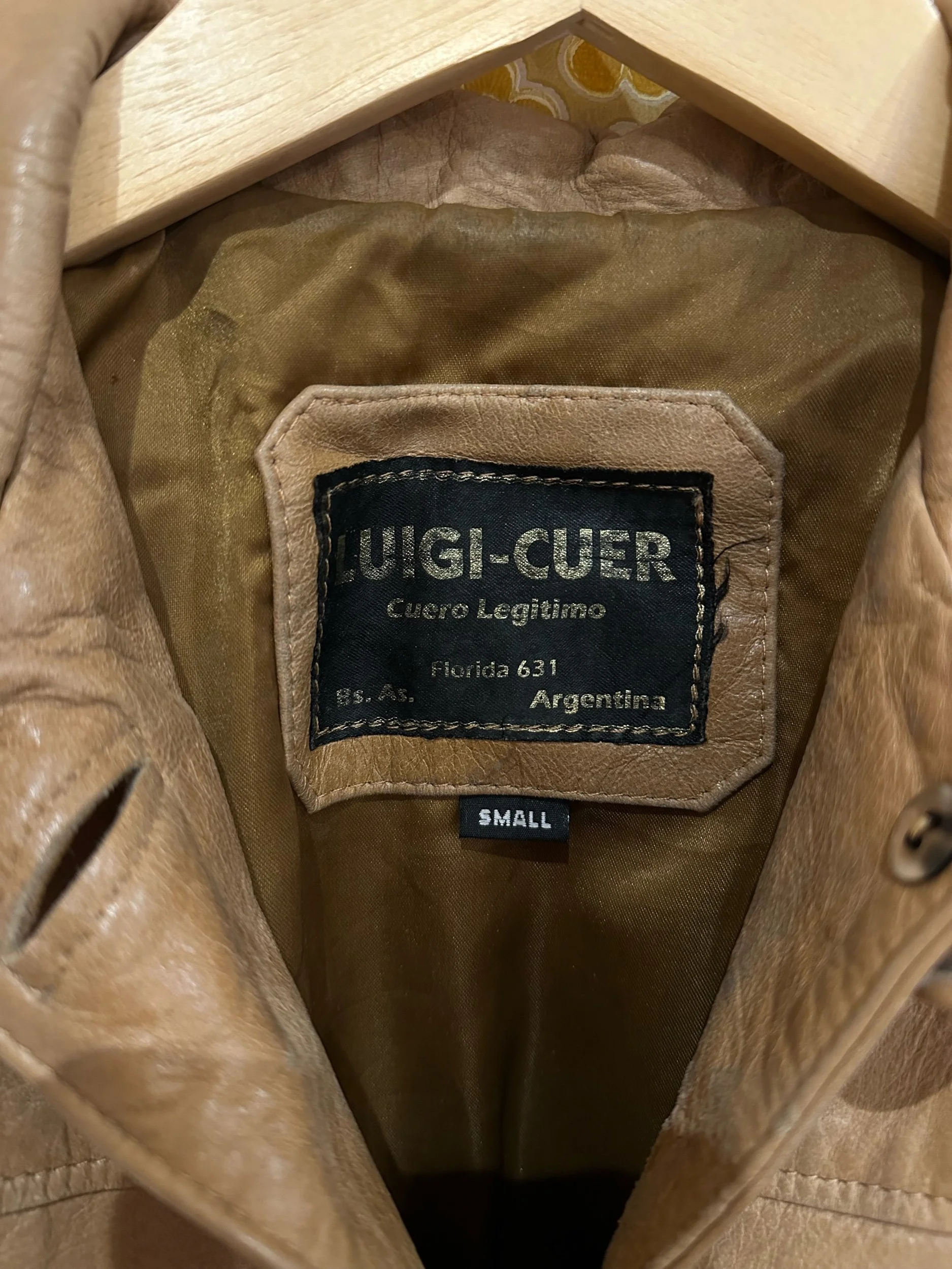 Say hello to Andy, a 1970s leather jack in a camel colour. In a slim fit with a wide classic collar, button down front and two front pockets on the hips. Fully lined and in great codition however there are signs of age/wear. There is fading to the colour in some area and water marks on the front lapel and back (please check photos thoroughly). The jacket is still very much wearable and I personally think the worn details give this jacket a really cool feel.
