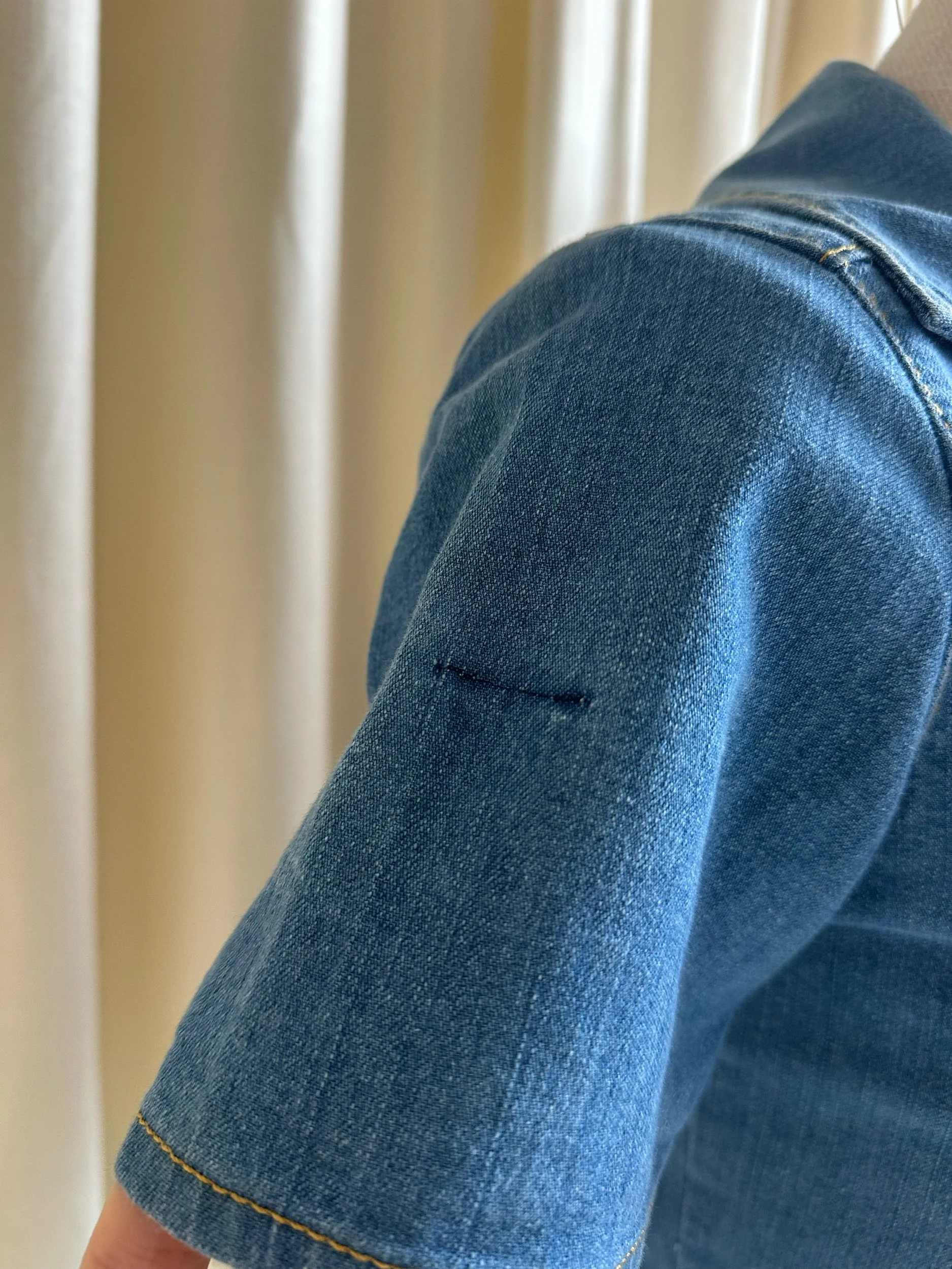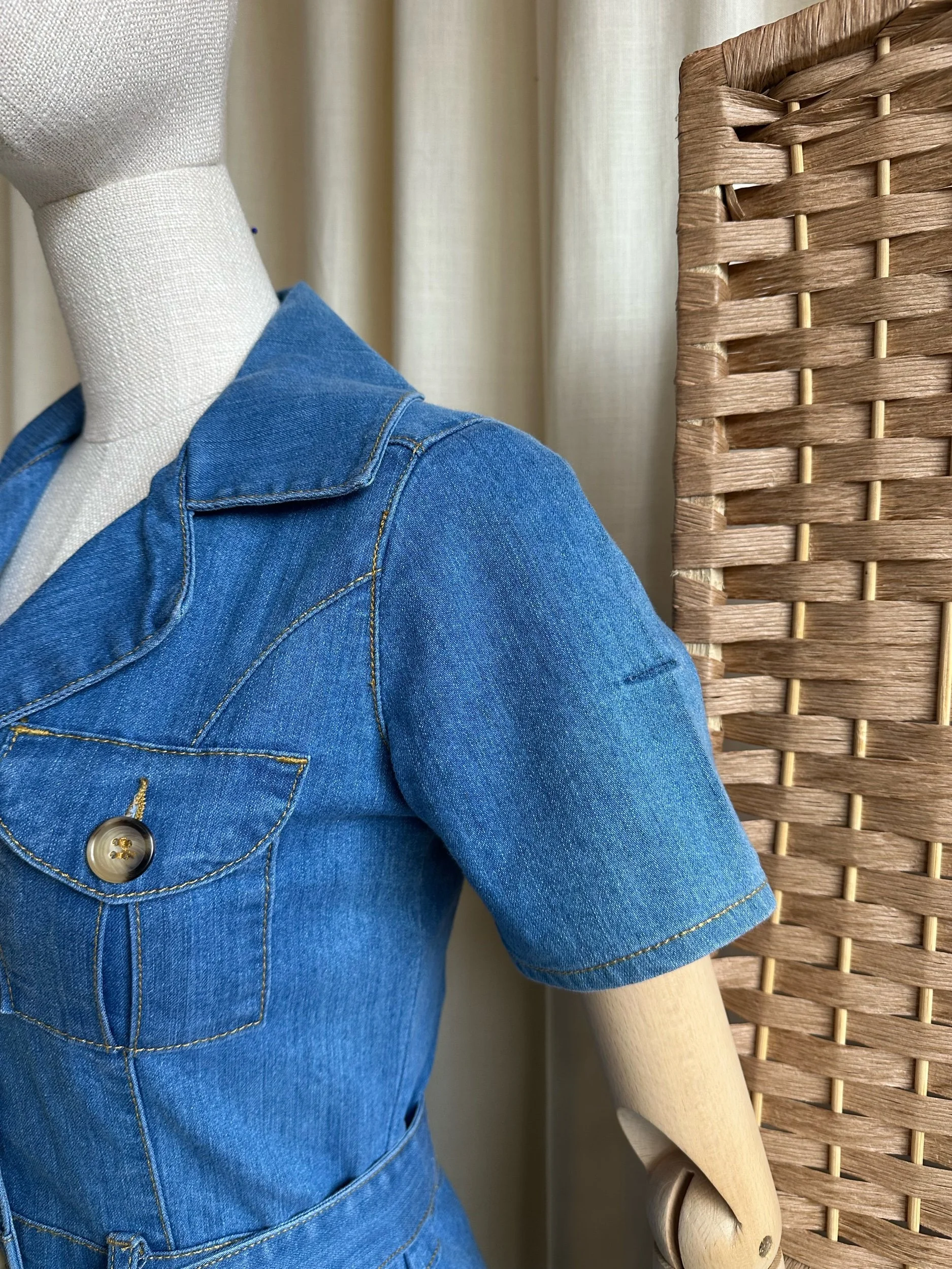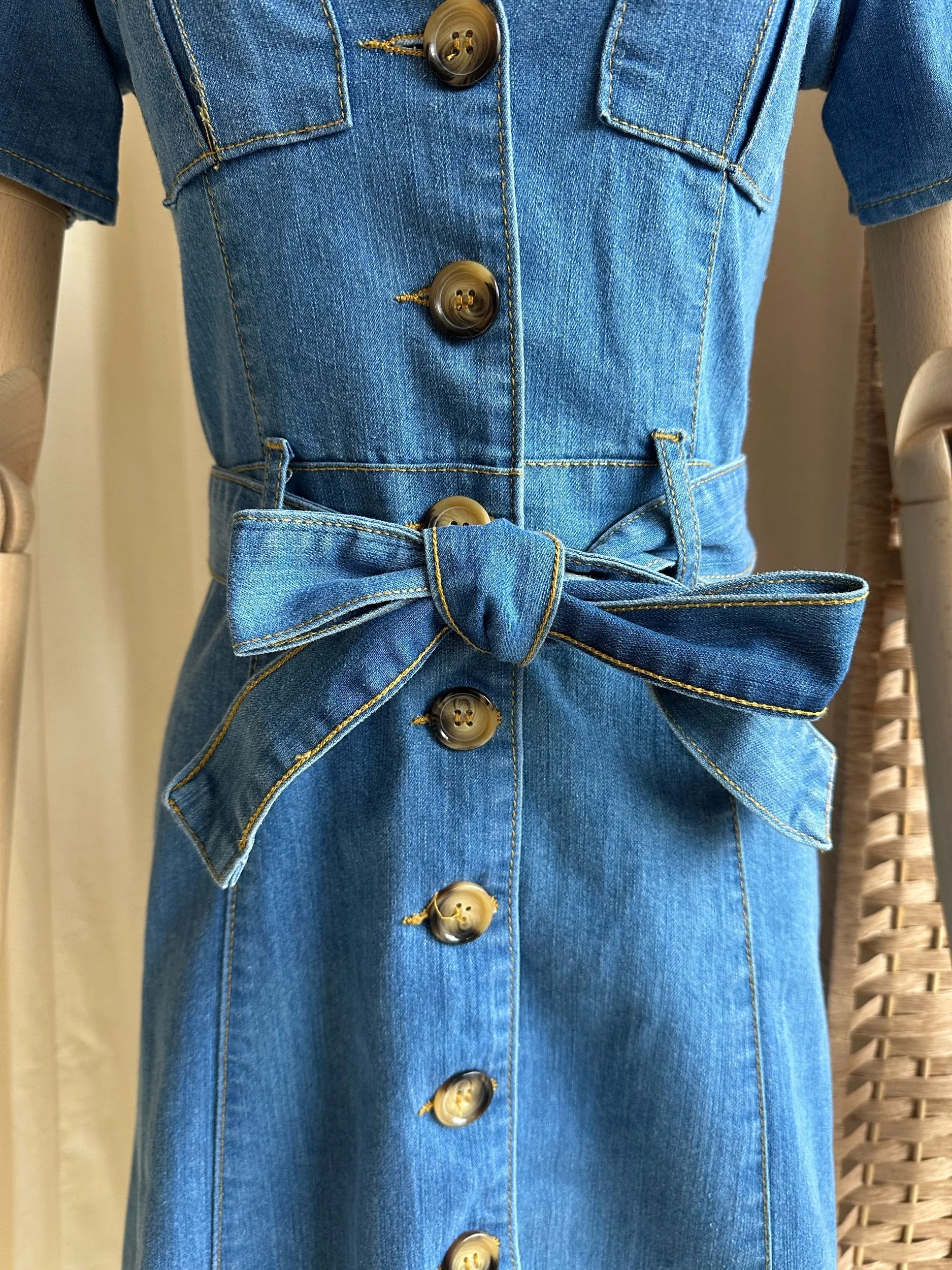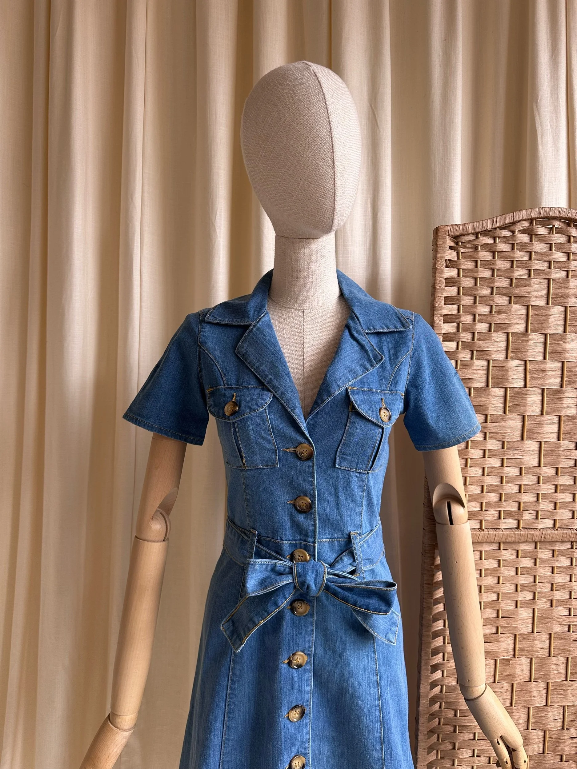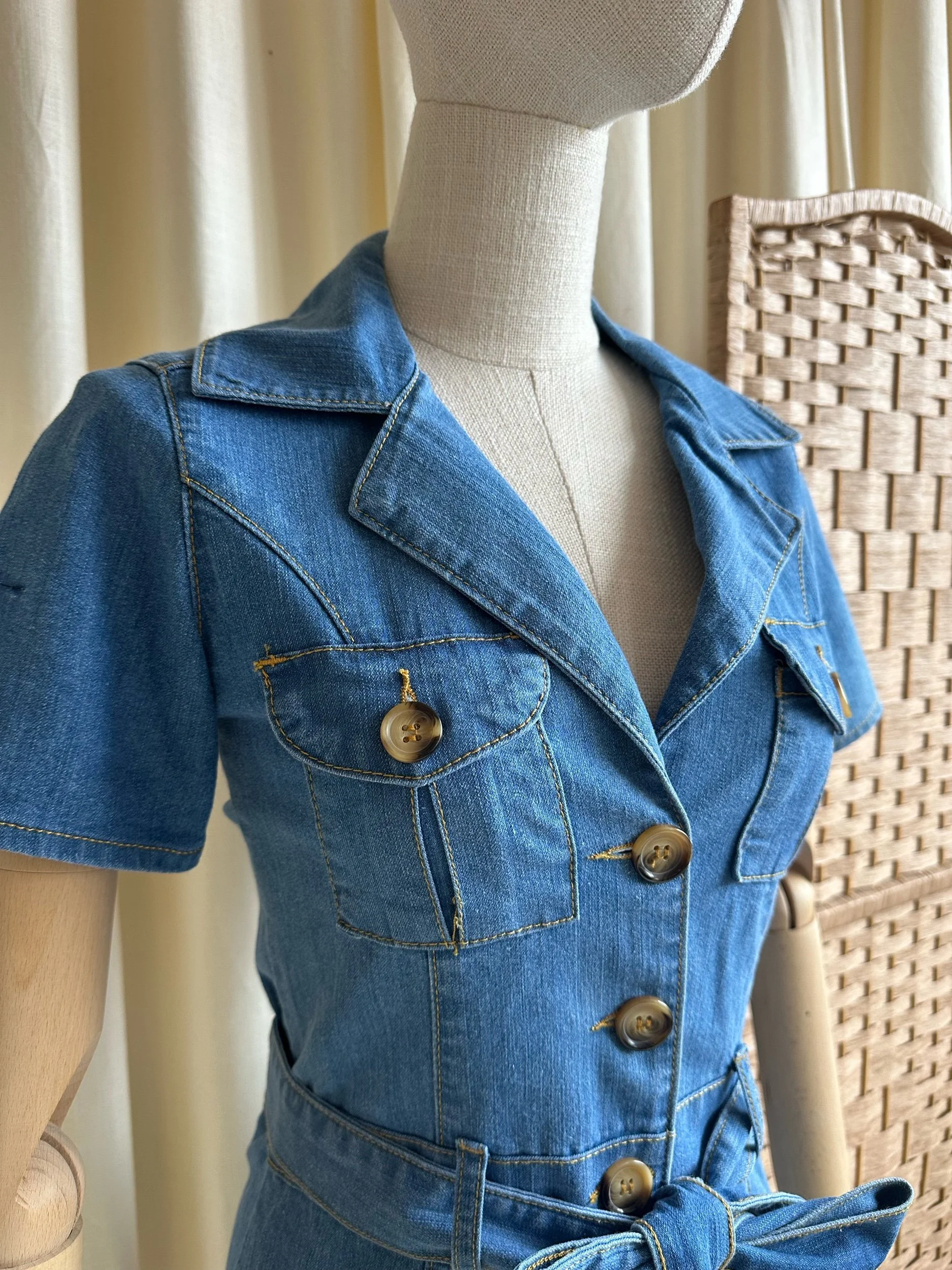Meet Andi, a super cool 1970s stretch denim shirt dress. In a loose washed denim with an oversized notched collar, button down front, two front pockets and a waist tie belt. The top is very much fitted and the skirt is A line, falling to around the knee. There are no noticeable signs of wear, it looks like there was once something stitched to both arms as you can see the marks. A timeless vintage piece perfect for spring/sunmer.