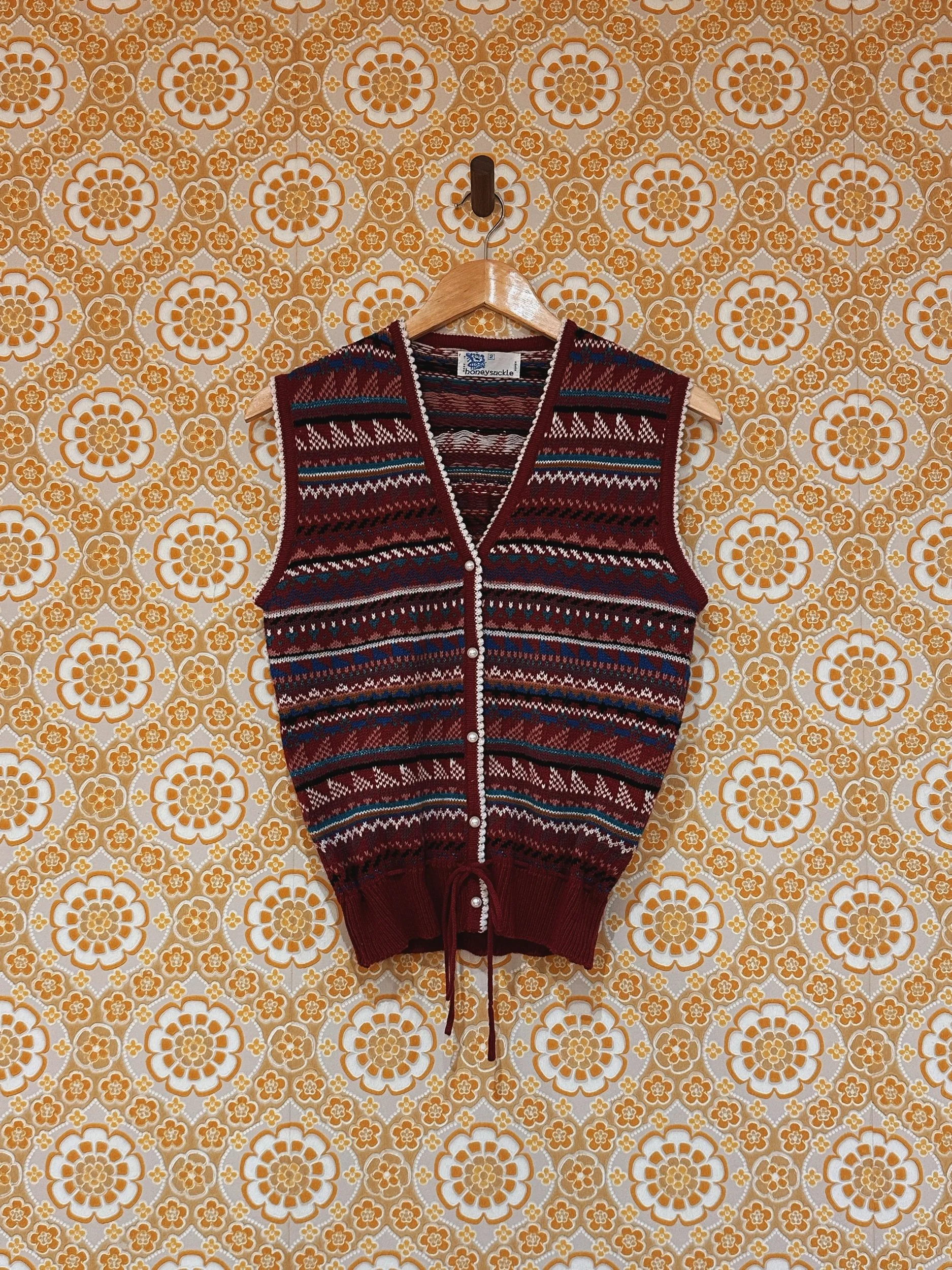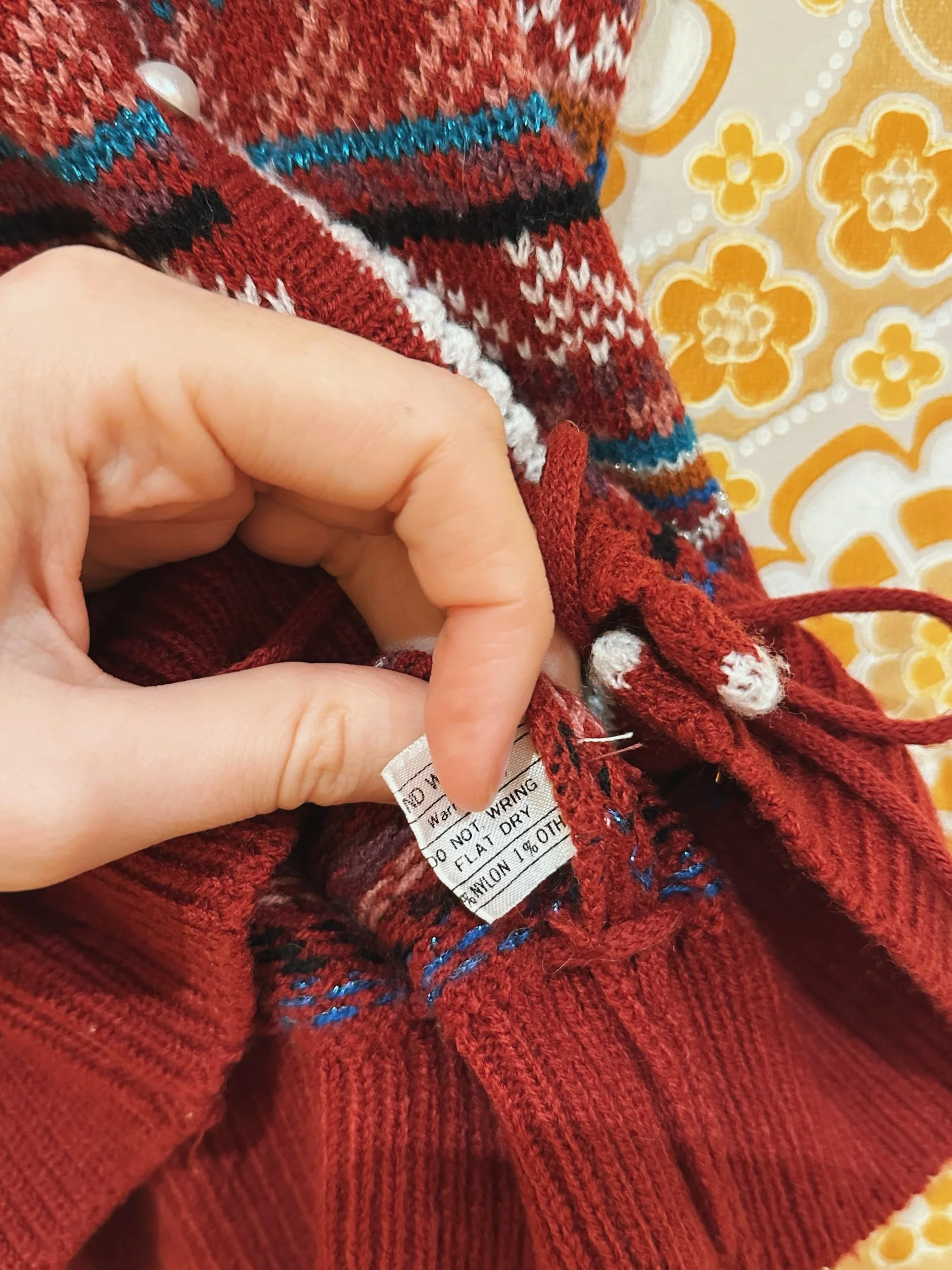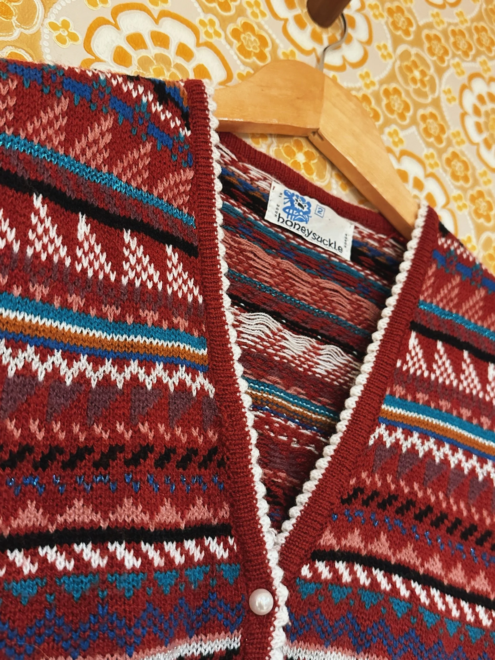 Meet Bonnie, an incredible 1970s/early 80s knitted waistcoat by the iconic “Honeysuckle” label. In a burgundy, blue and cream Fair Isle style pattern, featuring metallic lurex thread. Made from an Acrylic mix yarn. With a faux pearl button down front and drawstring waist, giving the shape a peplum style. Wear over a t-shirt and jeans for an easy, effortless festive look. With no noticeable signs of wear.