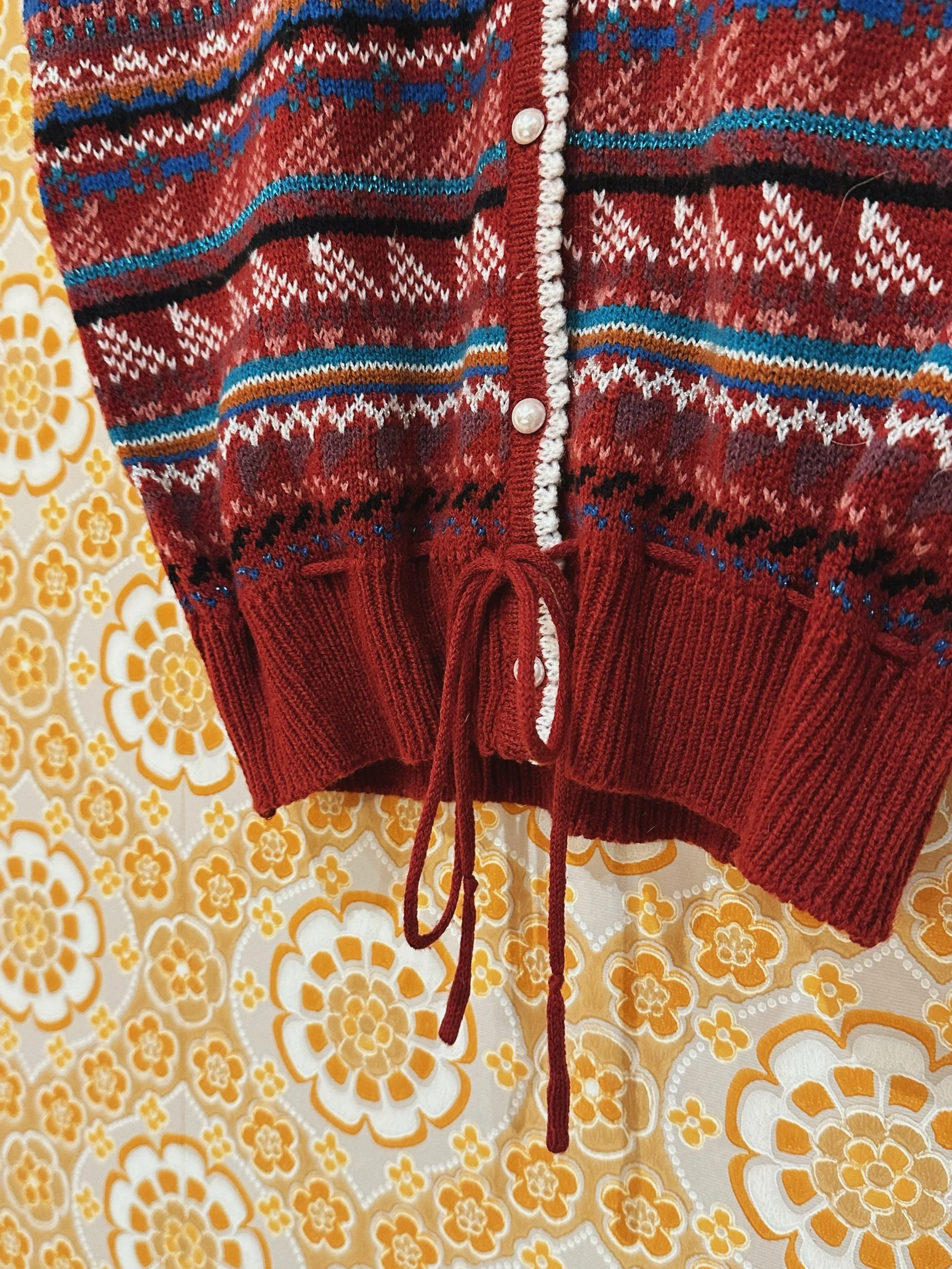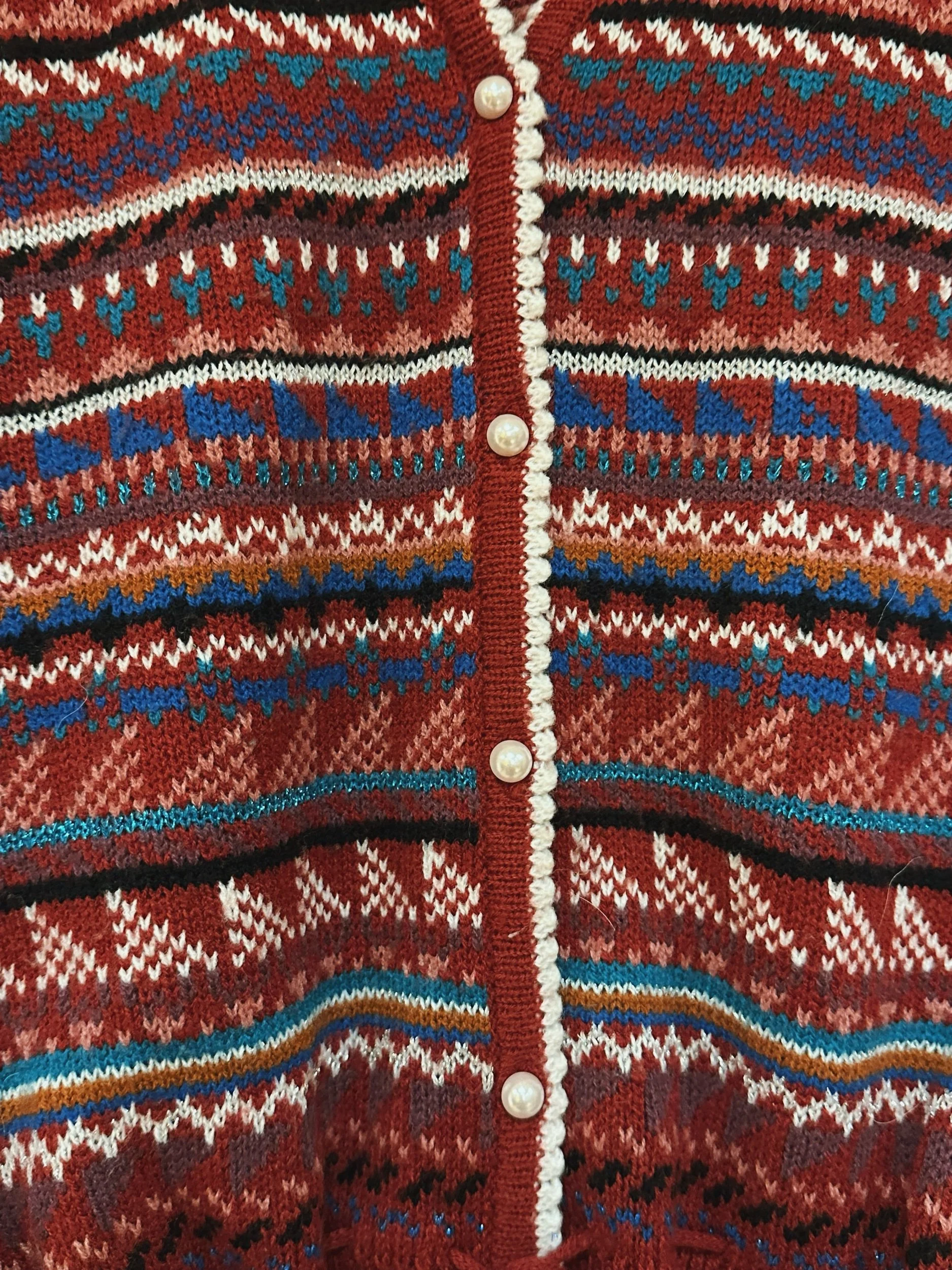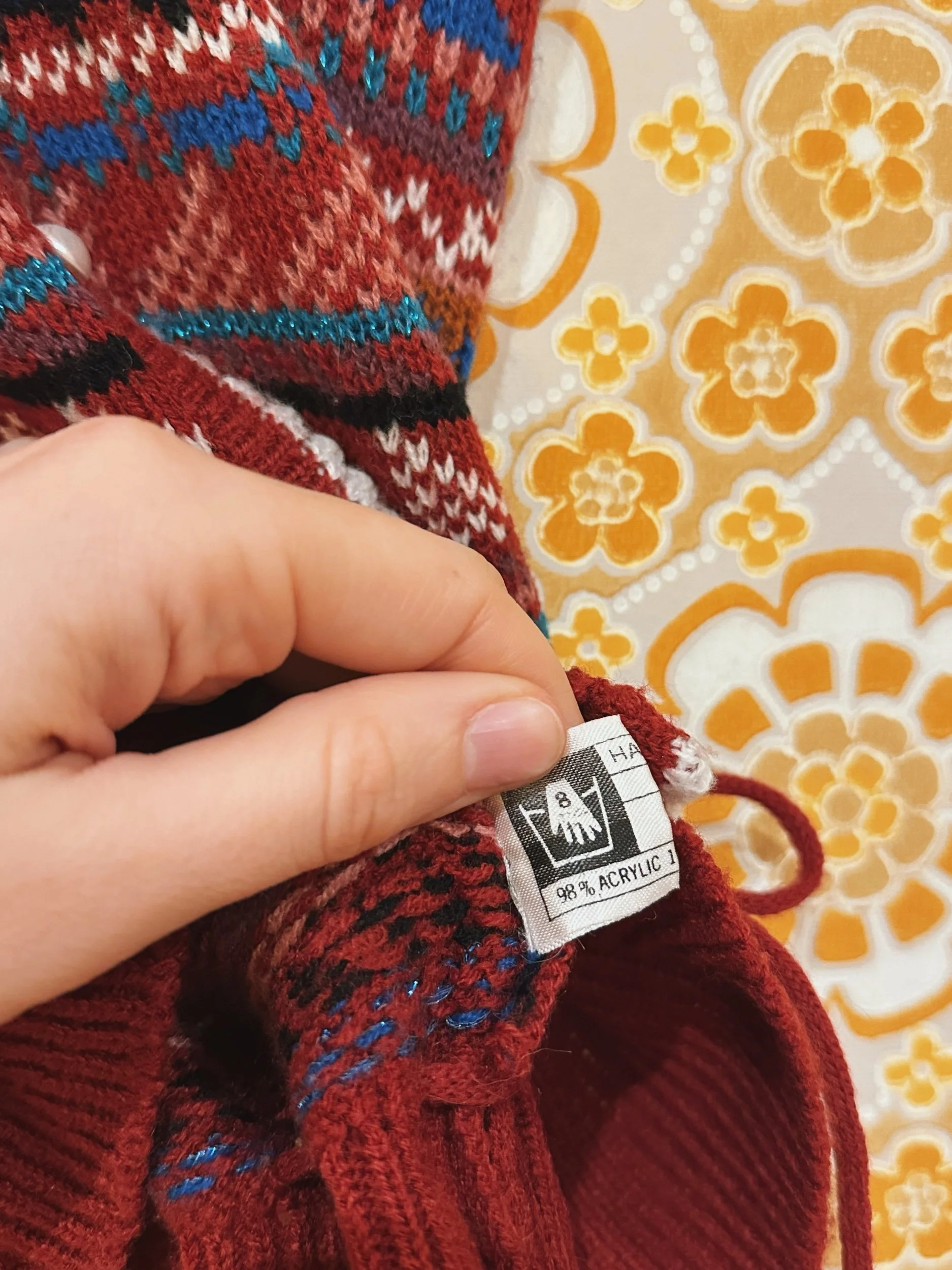 Meet Bonnie, an incredible 1970s/early 80s knitted waistcoat by the iconic “Honeysuckle” label. In a burgundy, blue and cream Fair Isle style pattern, featuring metallic lurex thread. Made from an Acrylic mix yarn. With a faux pearl button down front and drawstring waist, giving the shape a peplum style. Wear over a t-shirt and jeans for an easy, effortless festive look. With no noticeable signs of wear.