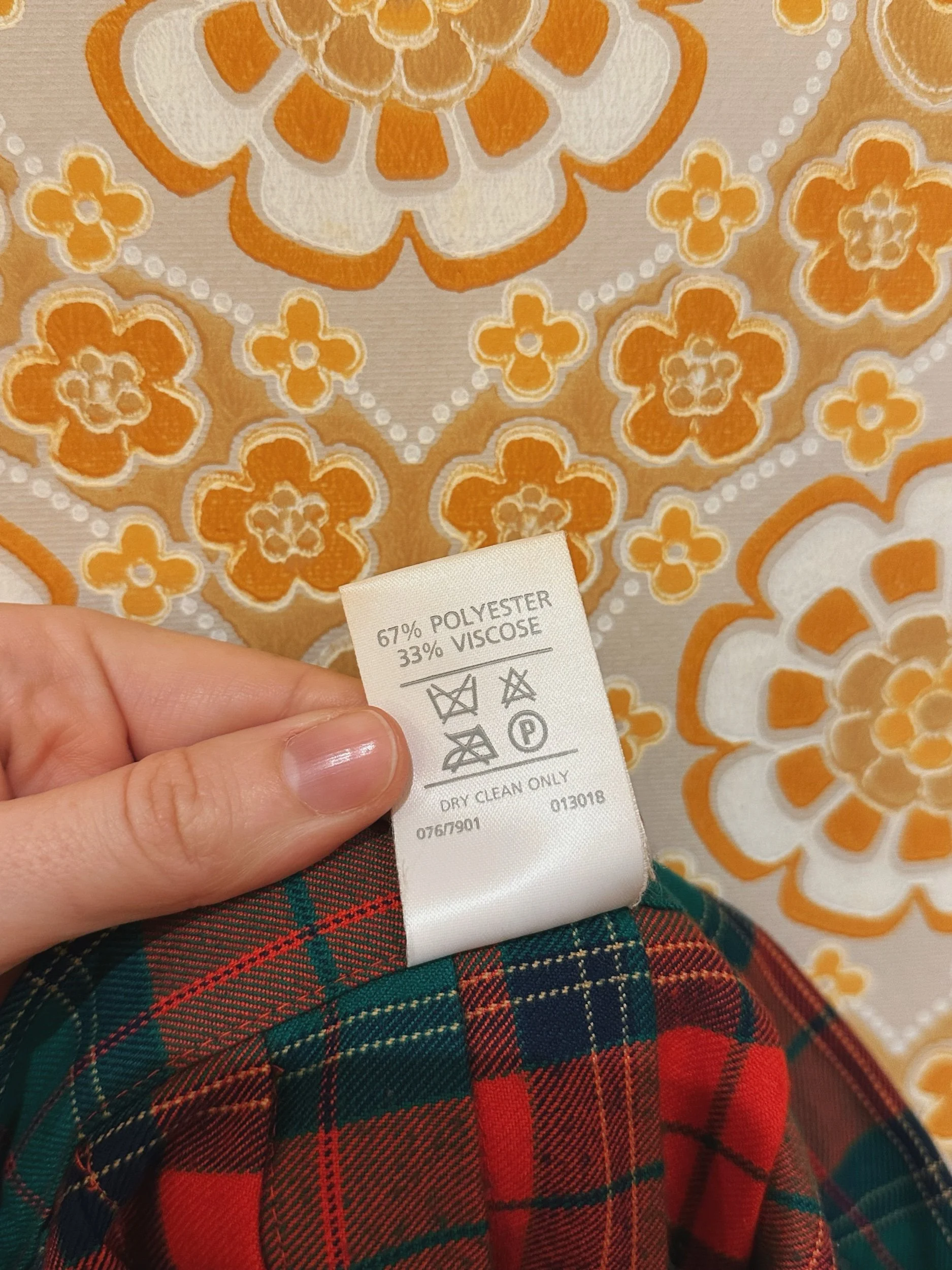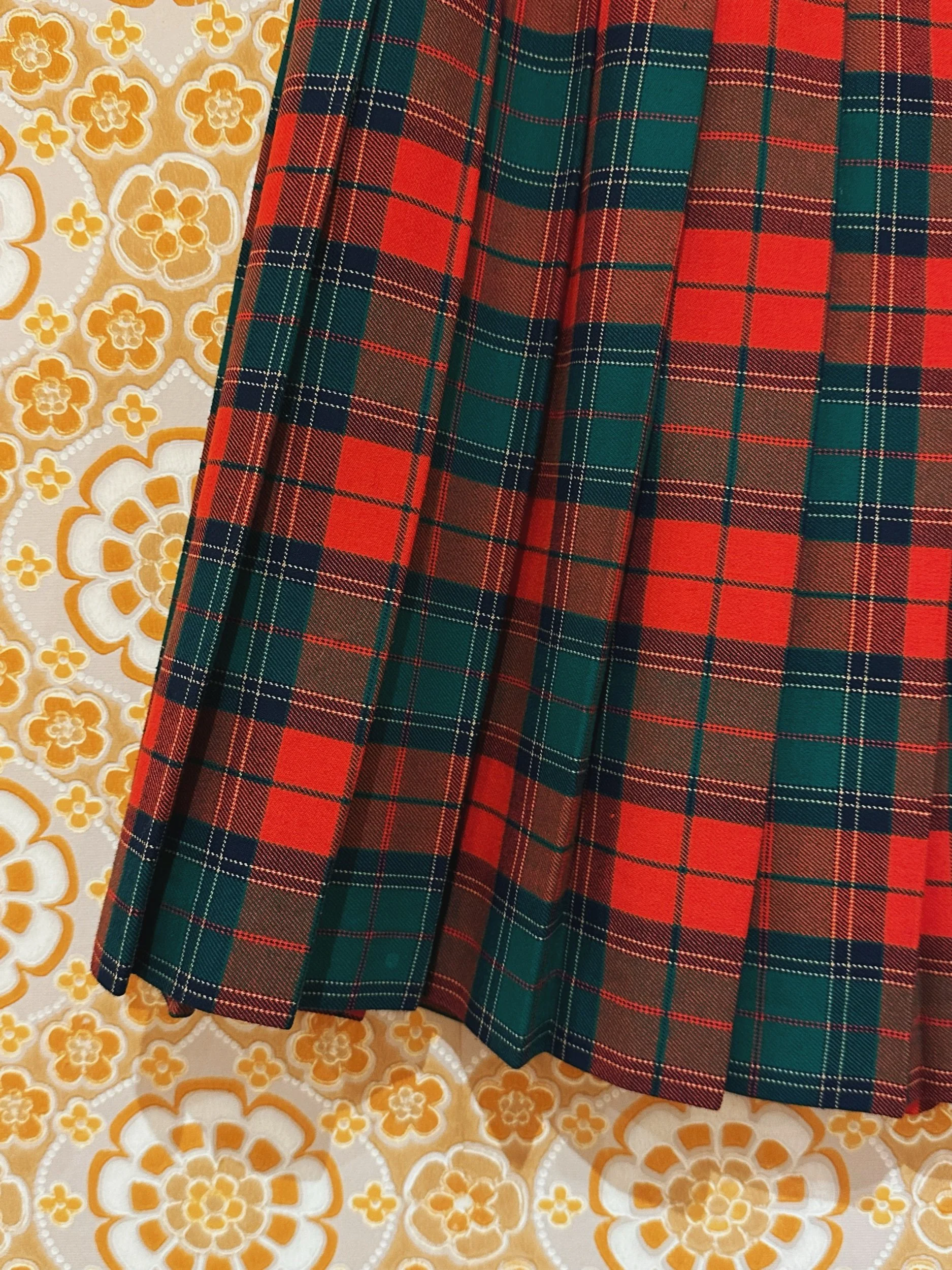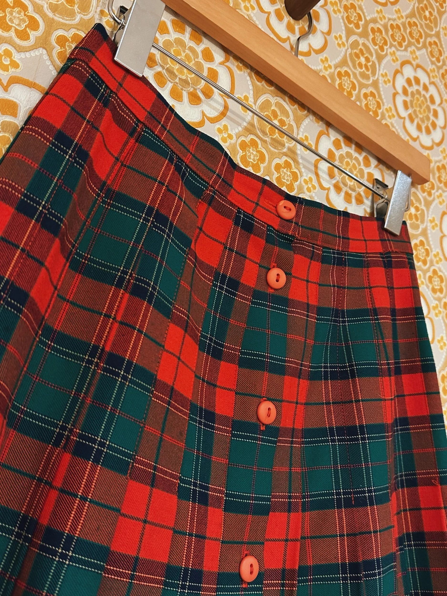 Say hello to Brianna, a super cool pleated skirt in a traditional red and green tartan check pattern. From the 1980s by “Asda” (Yes Asda, before George). Made from a Polyester and Viscose mix. with a button down front and fully pleated all the way round. The shape is A line and the knee is mini to knee length (depending on your height). With no noticeable signs of wear.