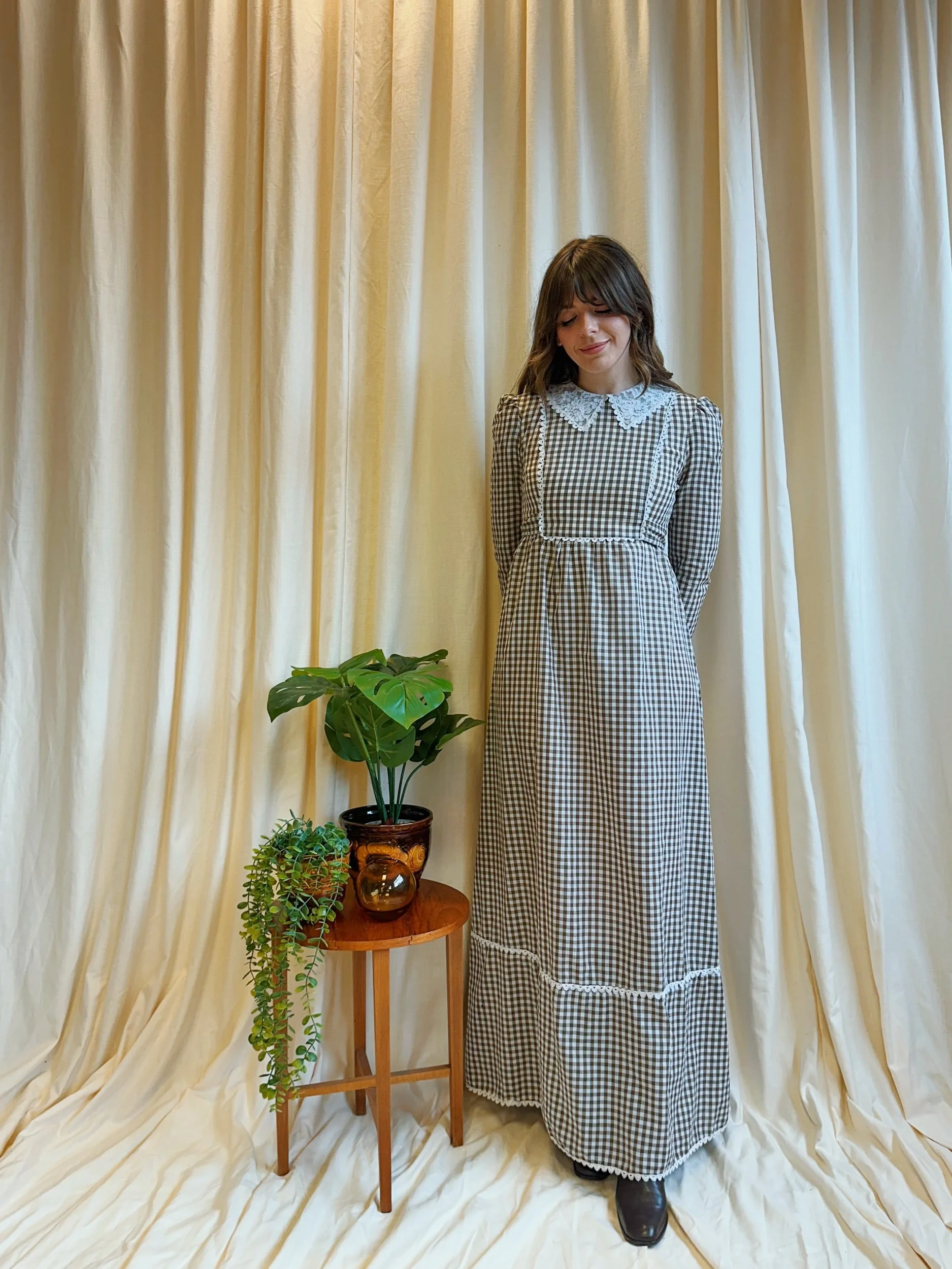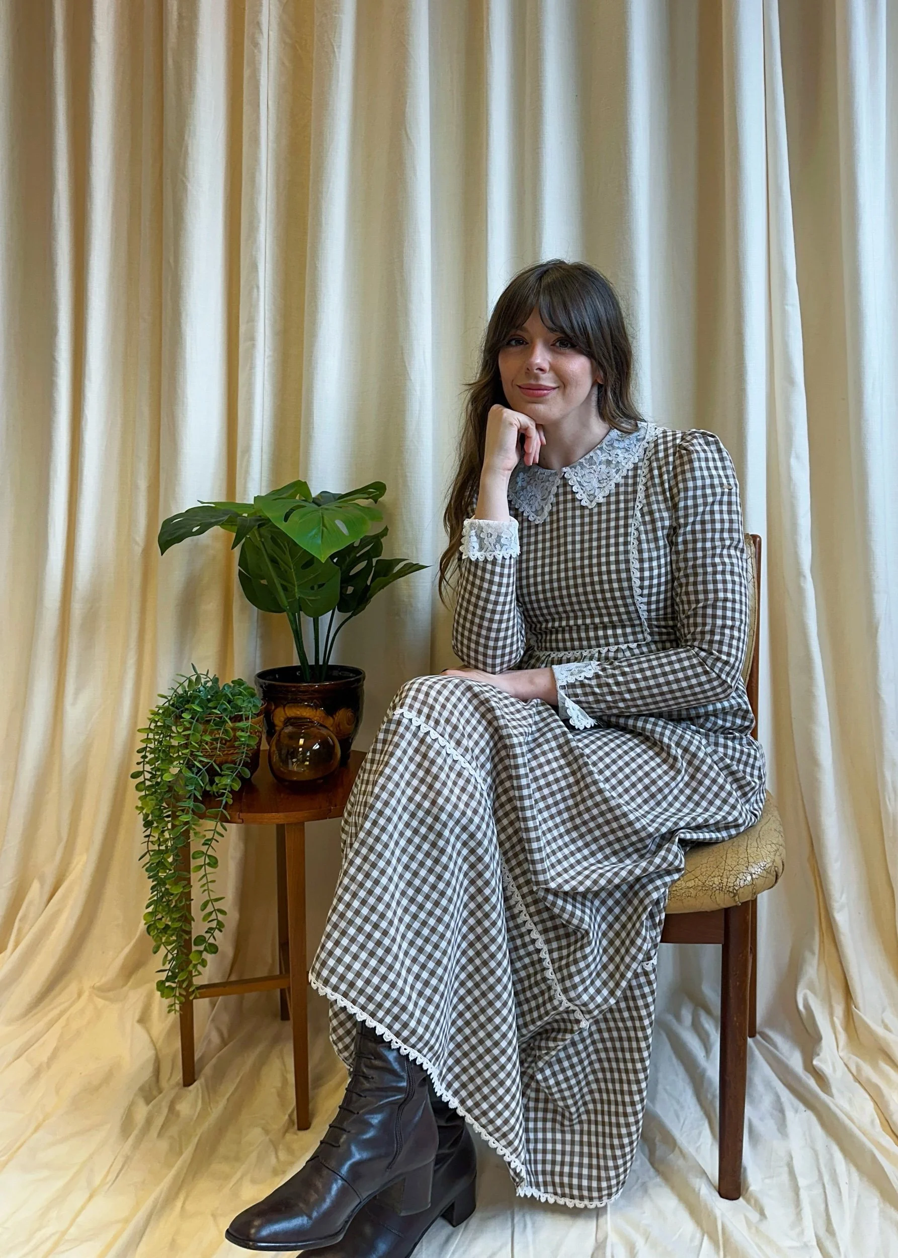 Meet Charlotte, a beautiful gingham check 1970s maxi dress by British label “Kadix”. In what feels like a lightweight cotton, in colours of off white and brown. A truly exceptional vintage piece for any fan of cottagecore or Edwardian revival. Featuring a delicate lace Peter Pan collar, lace turn up cuffs, crochet trim on the front bib and a tie waist. The skirt is maxi in length and A line in shape. There are no noticeable signs of wear aside from a small repair on the left arm. The perfect vintage piece to elevate your spring/summer wardrobe