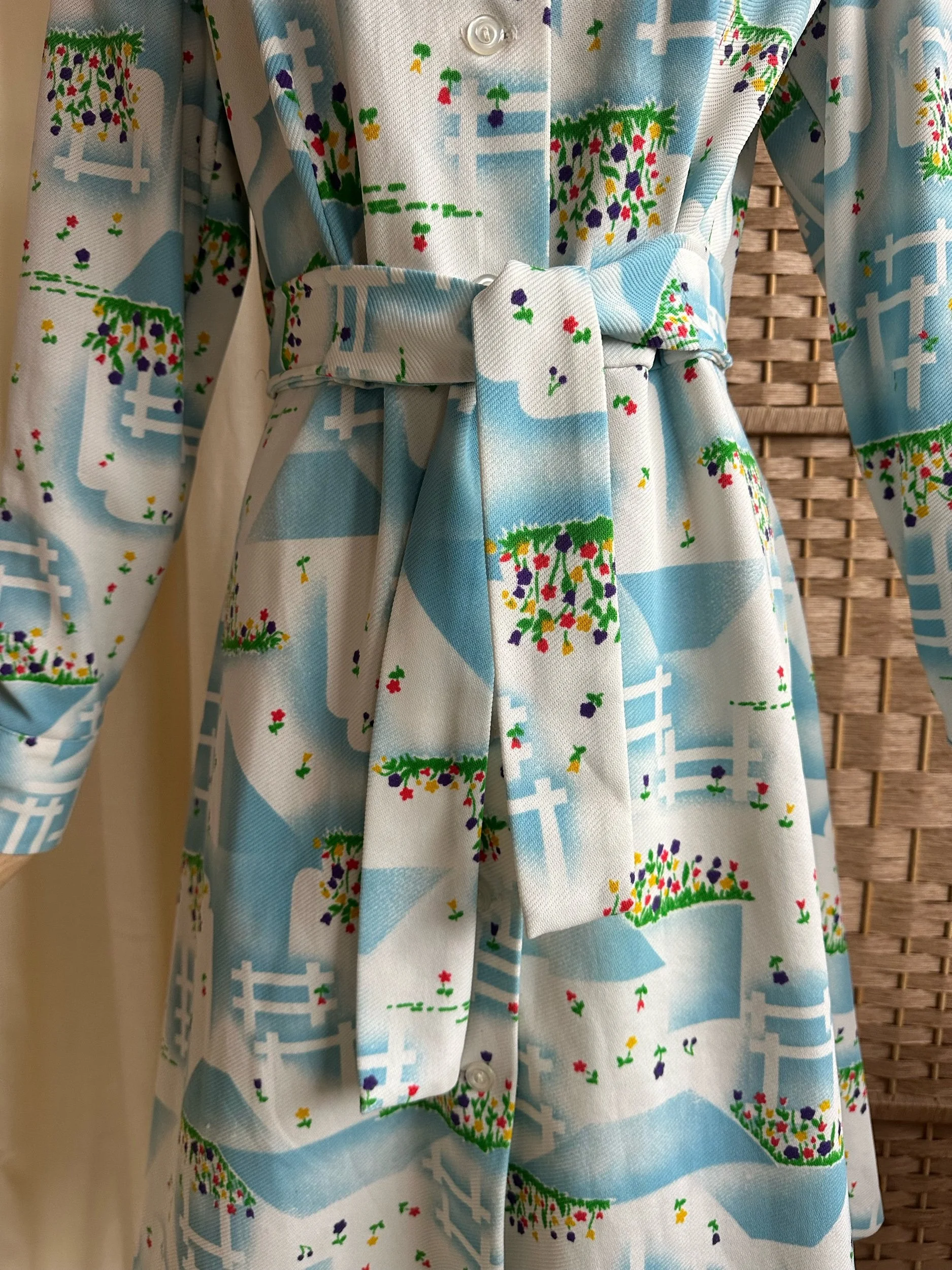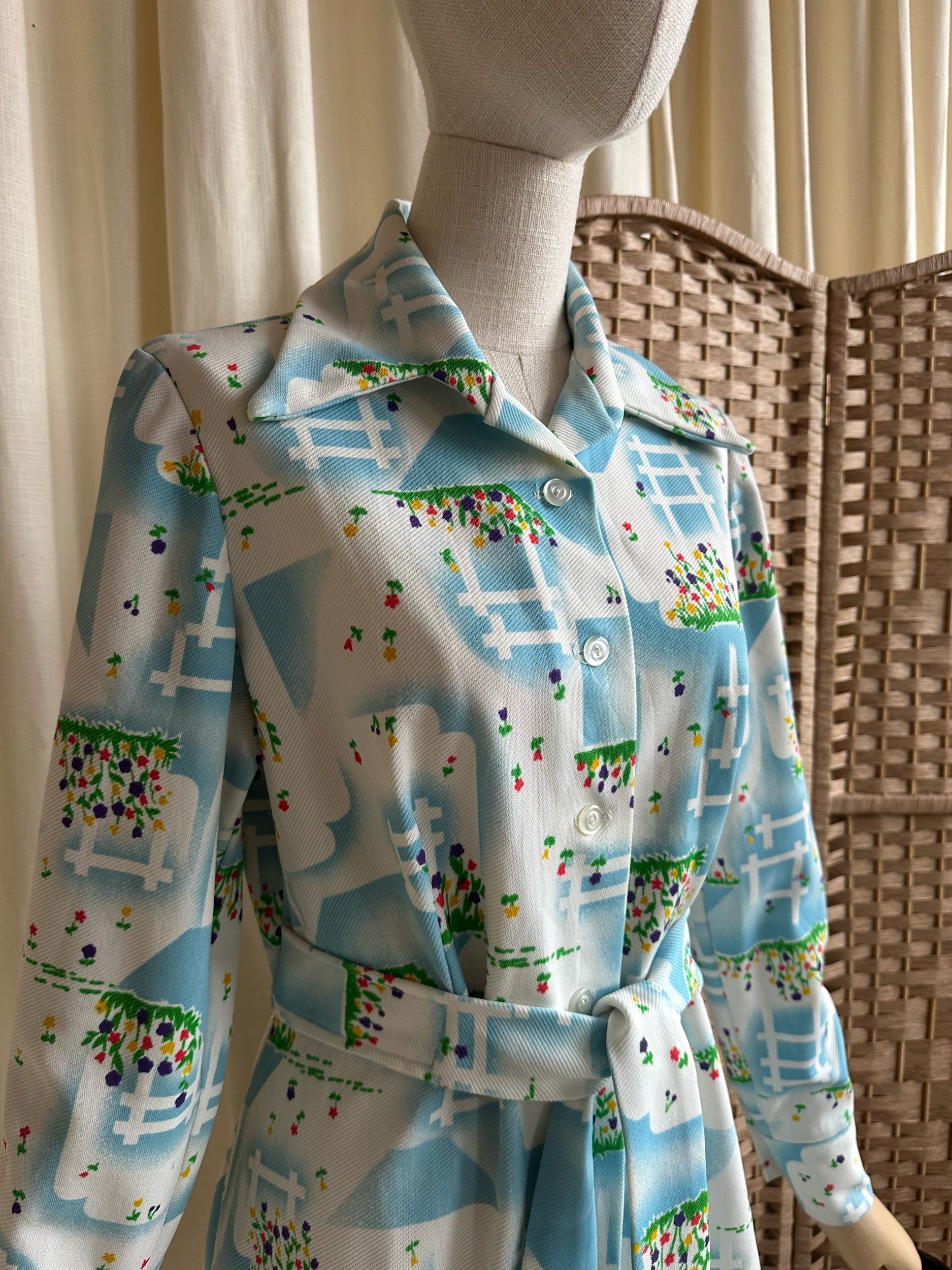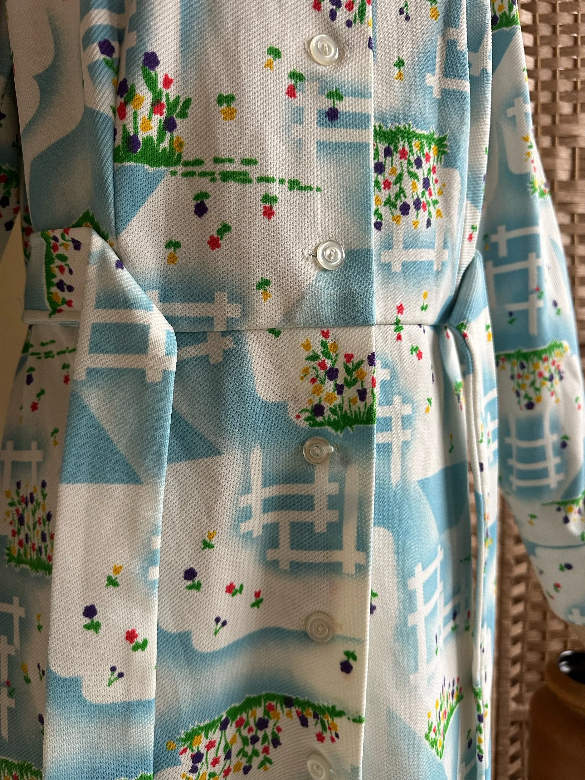 Meet the delightful Tulip, a 1970s tea dress in the most incredible novelty print featuring florals and a picket fence. In with feels like a poly/Crimplene fabric with an oversized notched collar, button down front and tie waist. This shirt dress style is slightly fitted on top with an A line skirt which falls past the knee. In great condition, a small pull and mark on the front skirt and a pull on the sleeve (see photo) but all are minor.
