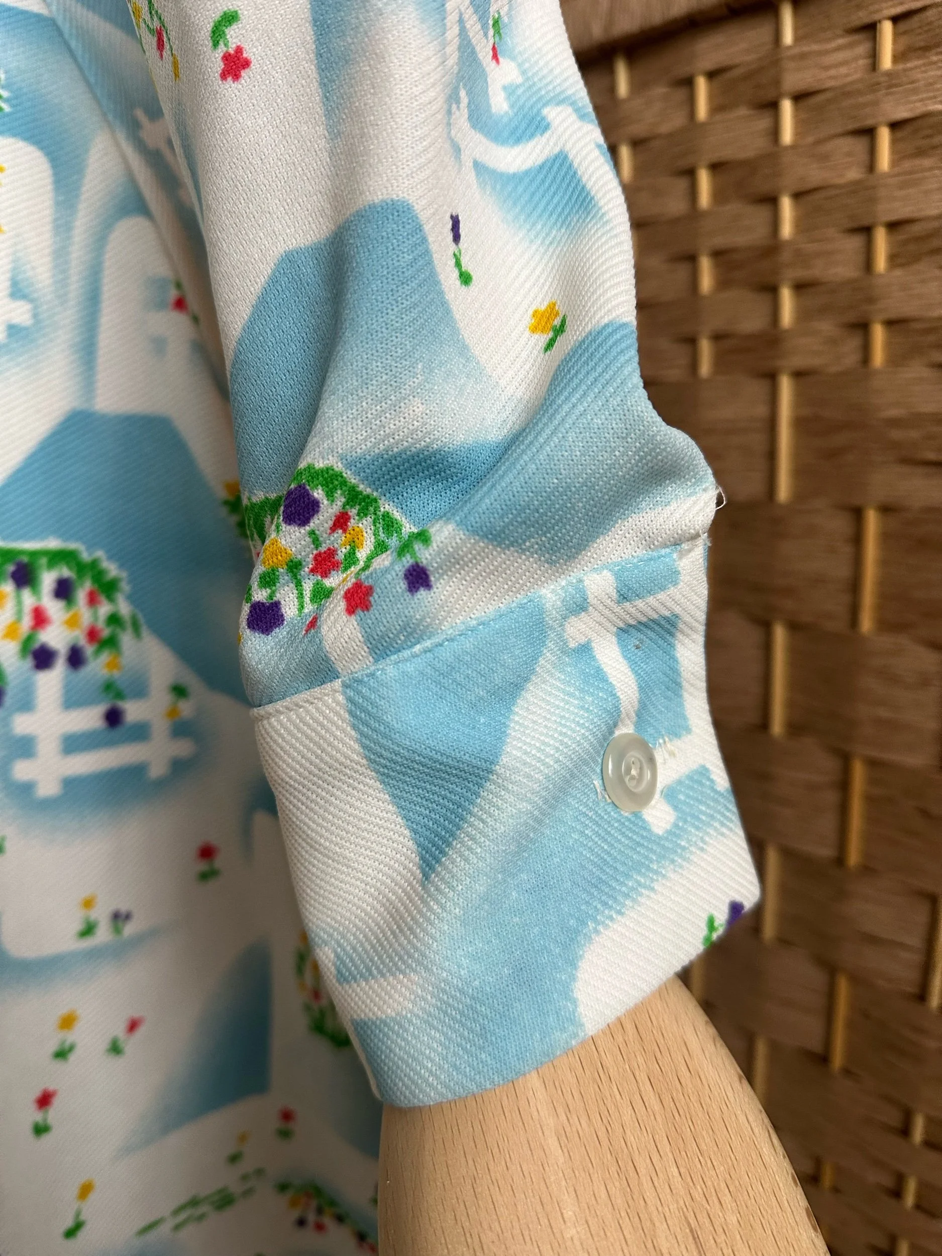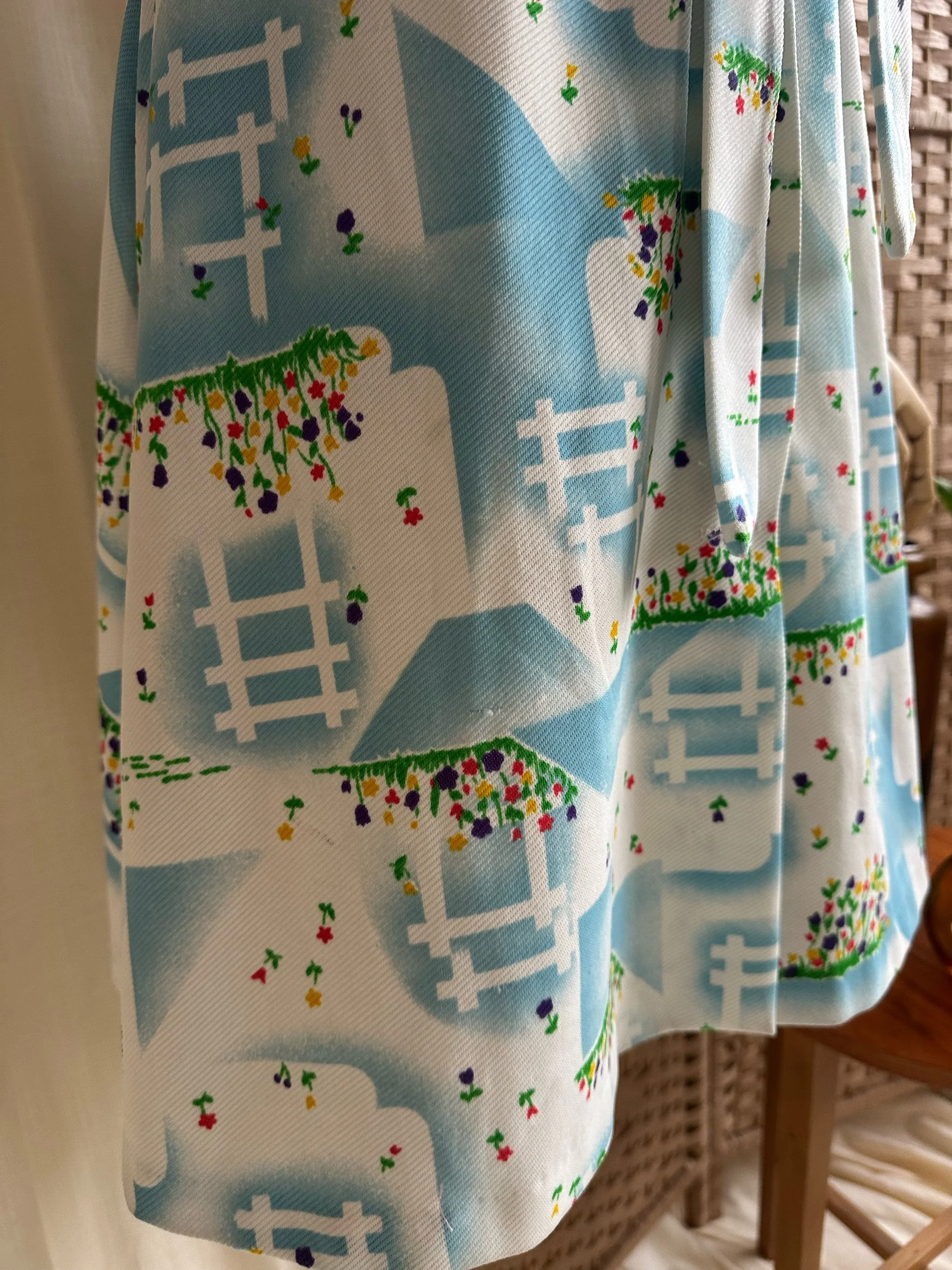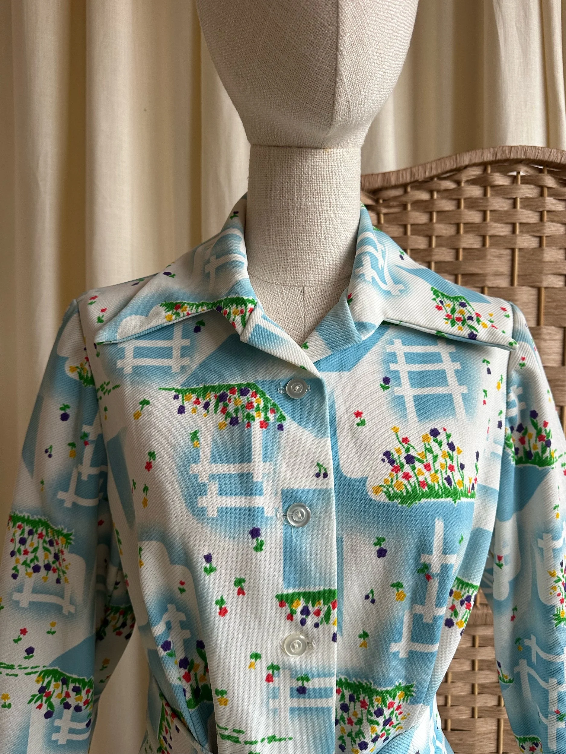 Meet the delightful Tulip, a 1970s tea dress in the most incredible novelty print featuring florals and a picket fence. In with feels like a poly/Crimplene fabric with an oversized notched collar, button down front and tie waist. This shirt dress style is slightly fitted on top with an A line skirt which falls past the knee. In great condition, a small pull and mark on the front skirt and a pull on the sleeve (see photo) but all are minor.