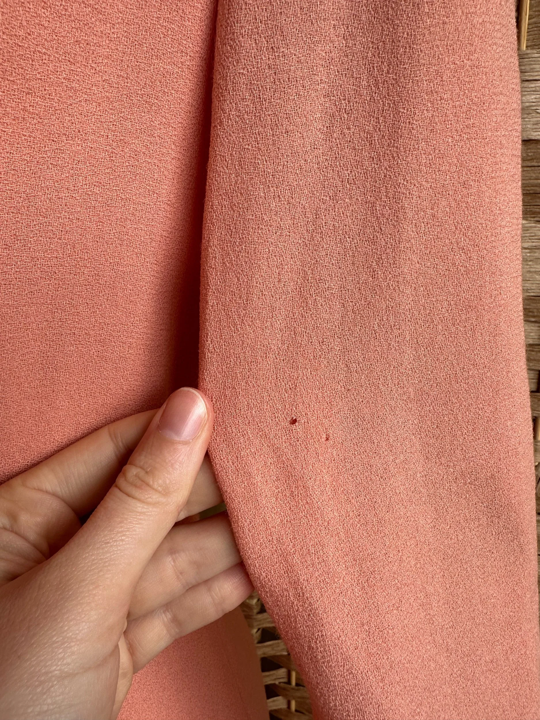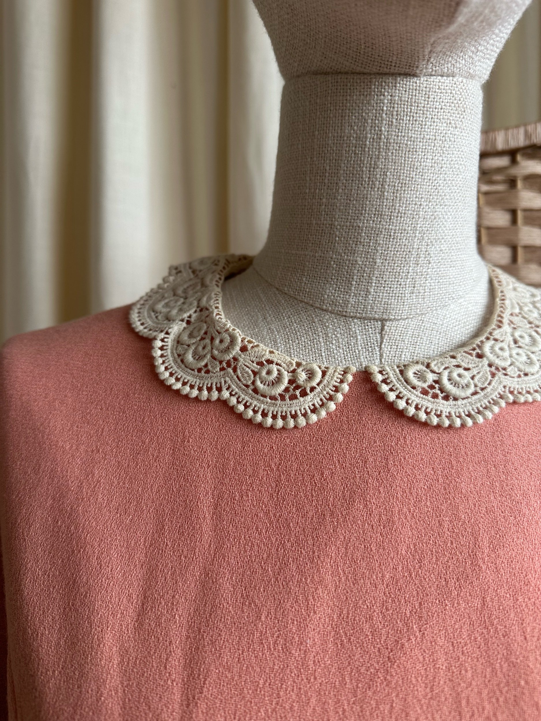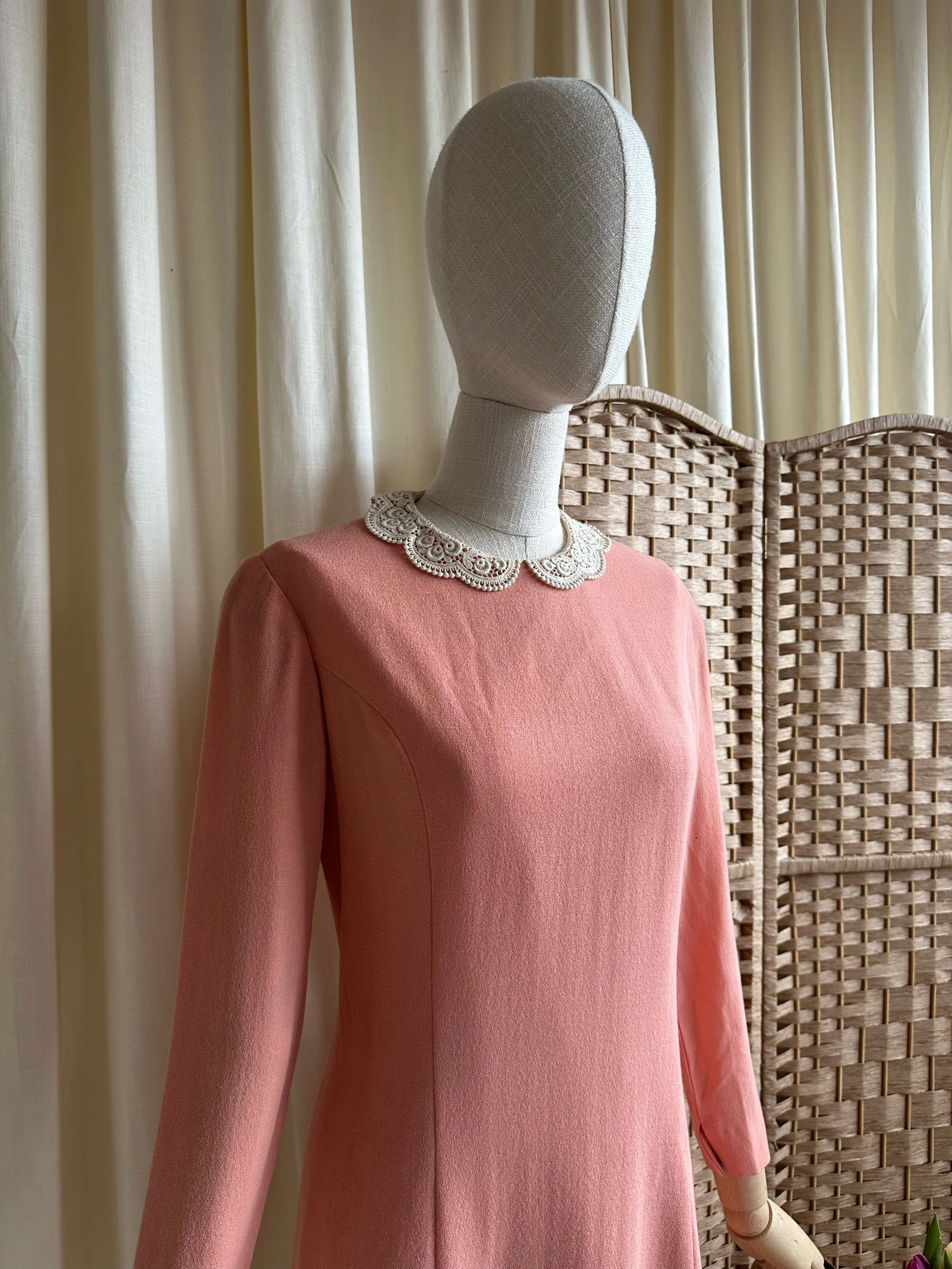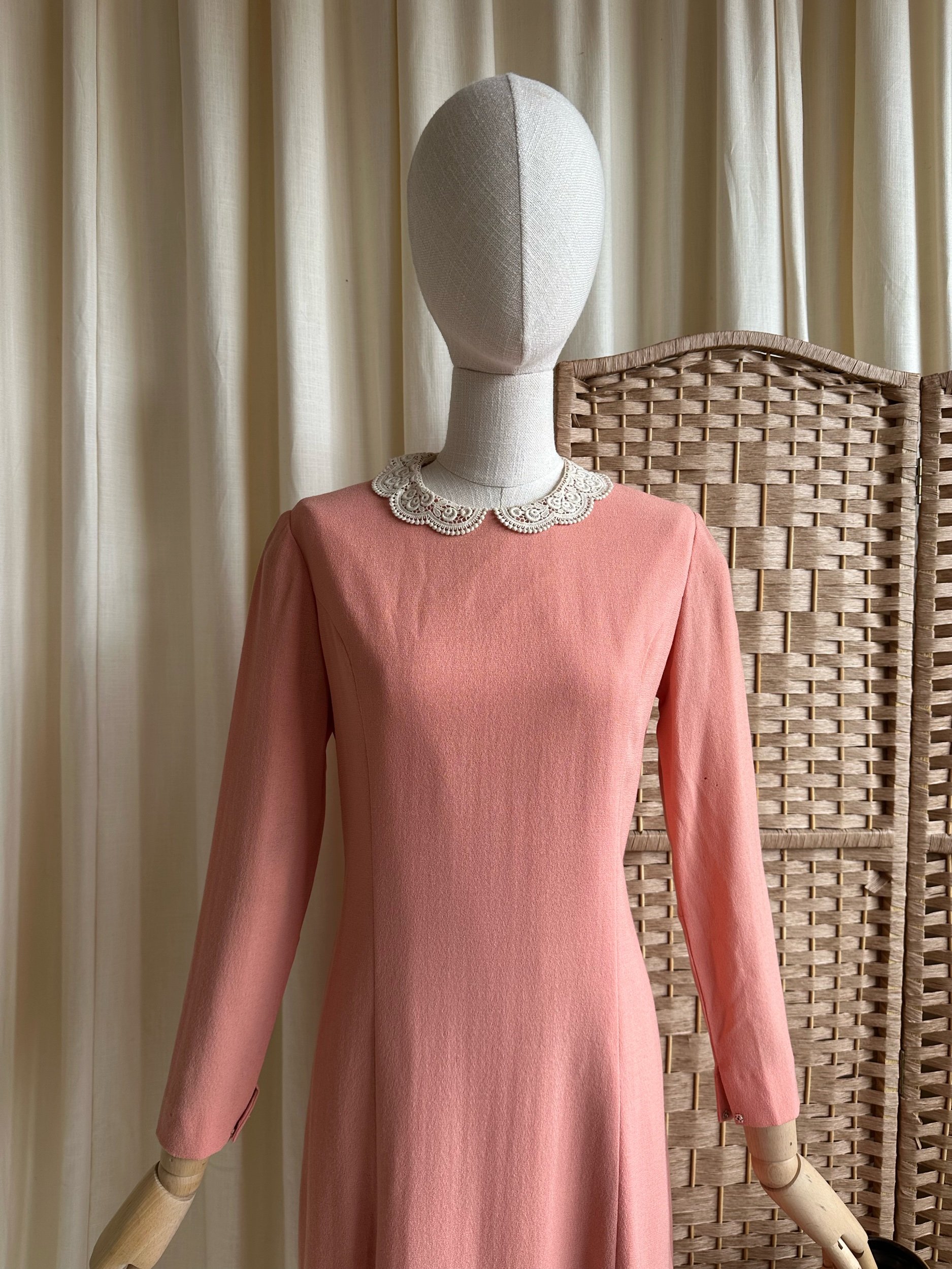 Meet Amelia, a delightful 1960s shift dress in a coral pink hue. In what feels like a crepe fabric, fully lined with a cream crochet lace Peter Pan collar. With princess seams running down the front to give shaping around the bust and waist. The full length sleeves feature popper fastenings on the cuffs. A simple timeless vintage piece, perfect for spring. There are a few small holes on the skirt and left arm (see photos), they’re only small and not hugely noticeable. There also some very faint marks on the left shoulder. Loose A line shape in a knee/midi length.