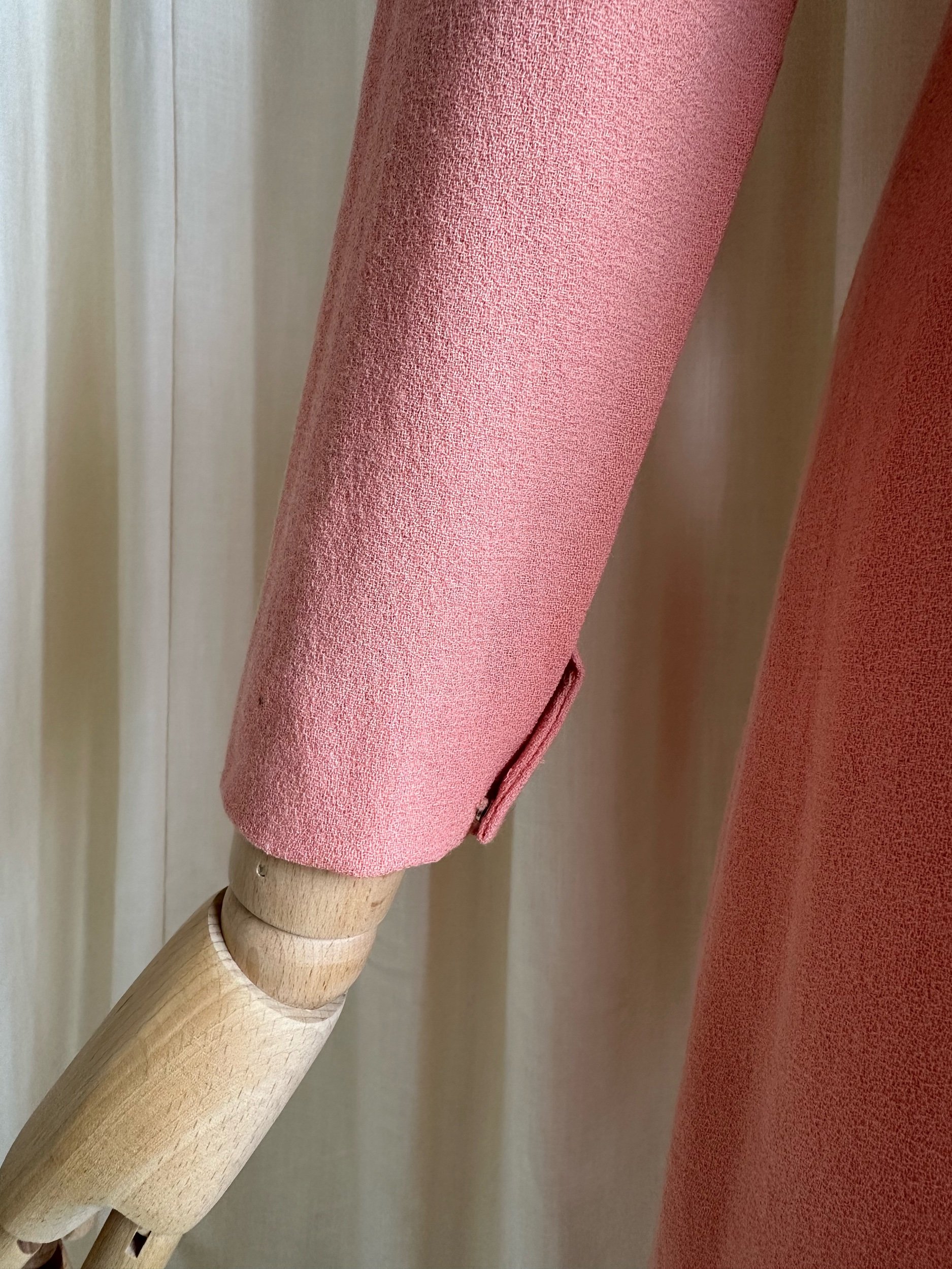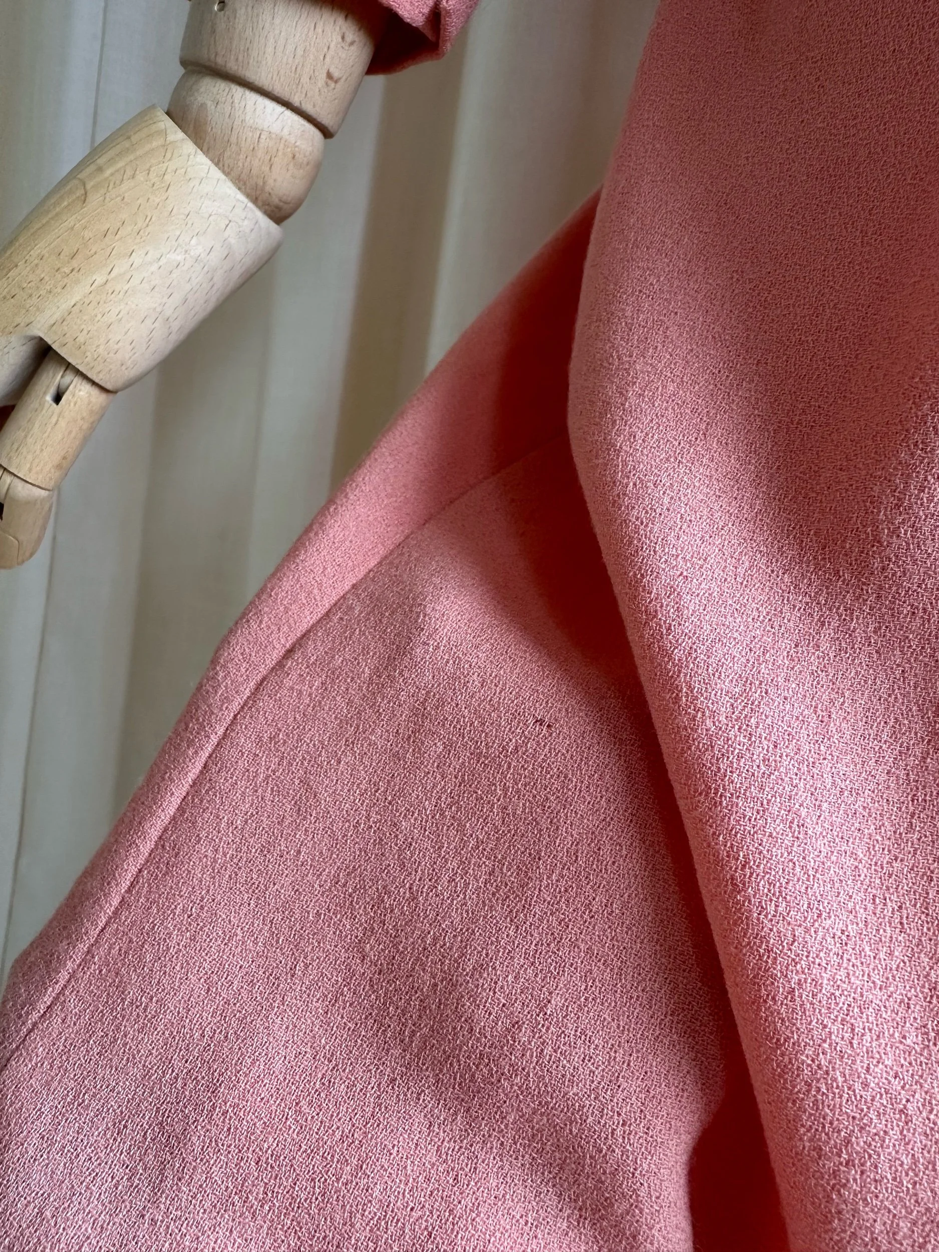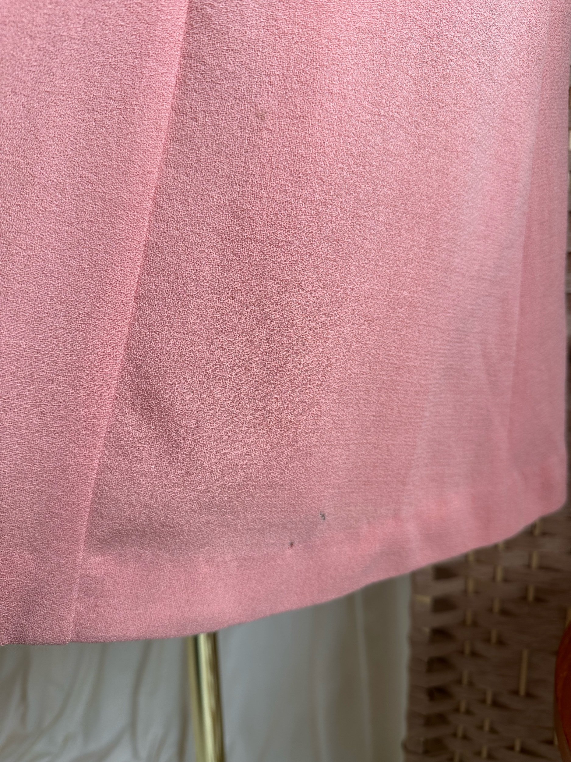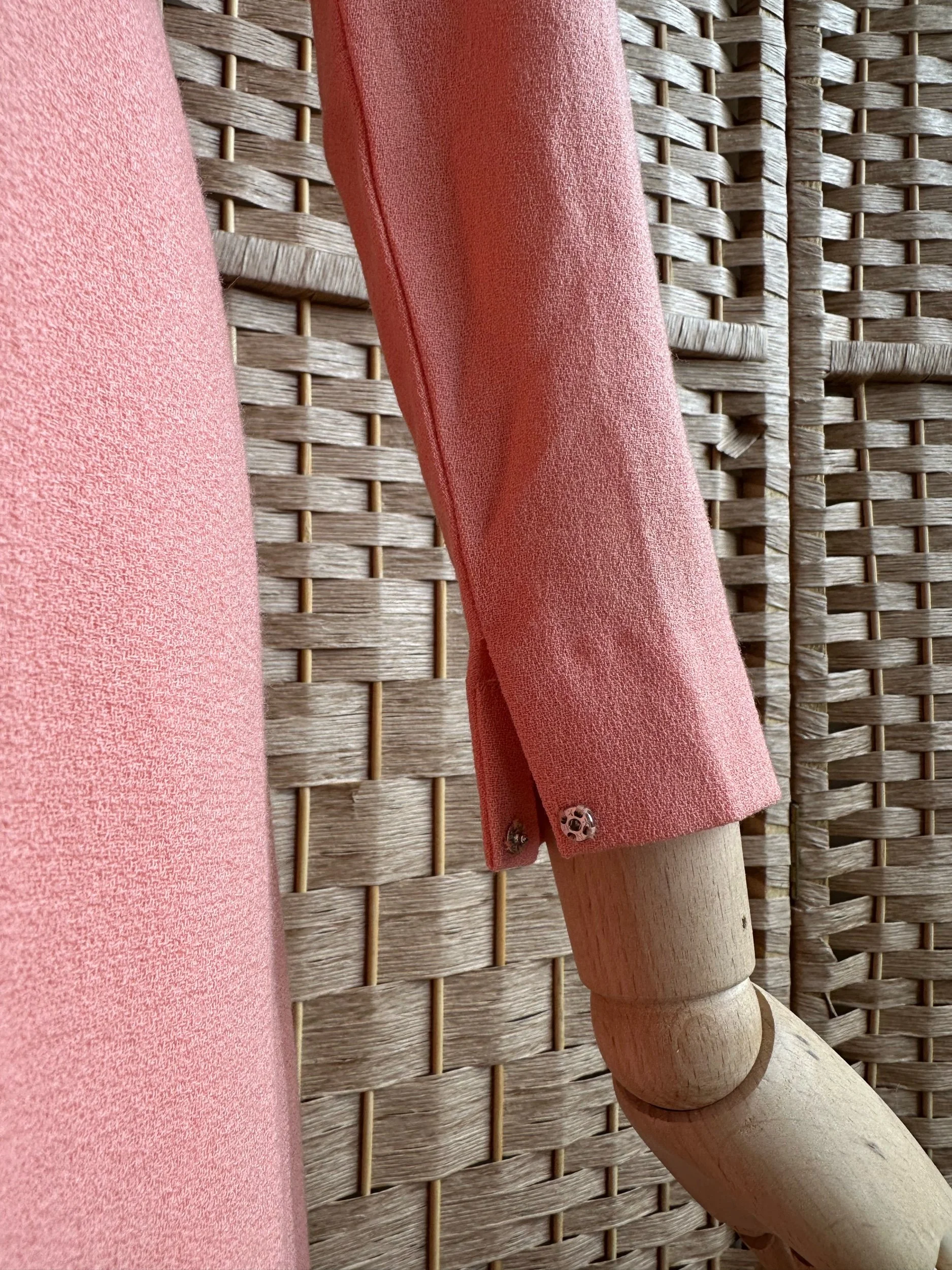 Meet Amelia, a delightful 1960s shift dress in a coral pink hue. In what feels like a crepe fabric, fully lined with a cream crochet lace Peter Pan collar. With princess seams running down the front to give shaping around the bust and waist. The full length sleeves feature popper fastenings on the cuffs. A simple timeless vintage piece, perfect for spring. There are a few small holes on the skirt and left arm (see photos), they’re only small and not hugely noticeable. There also some very faint marks on the left shoulder. Loose A line shape in a knee/midi length.
