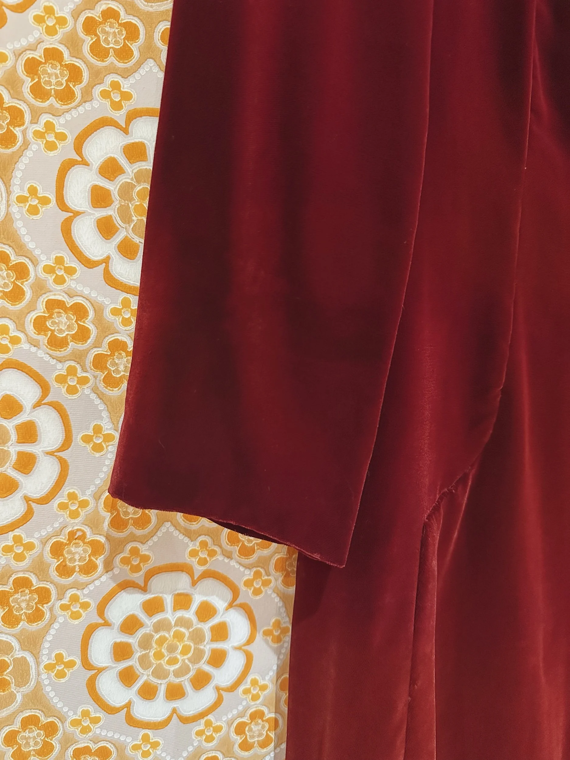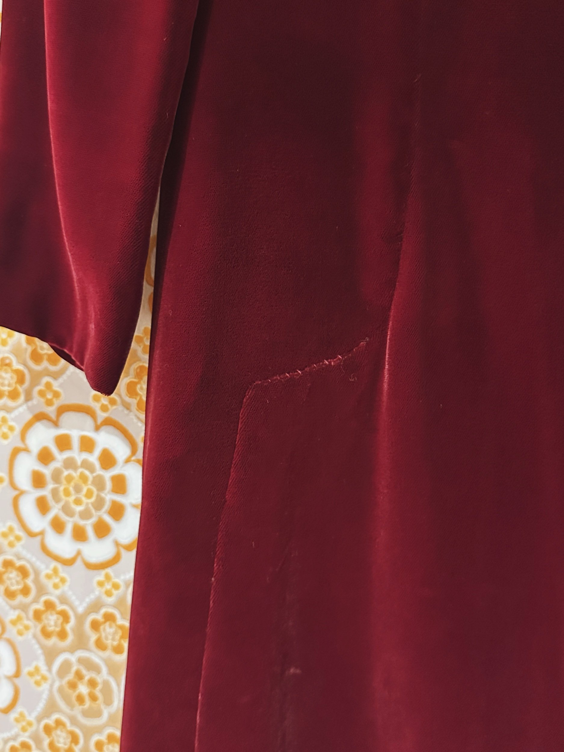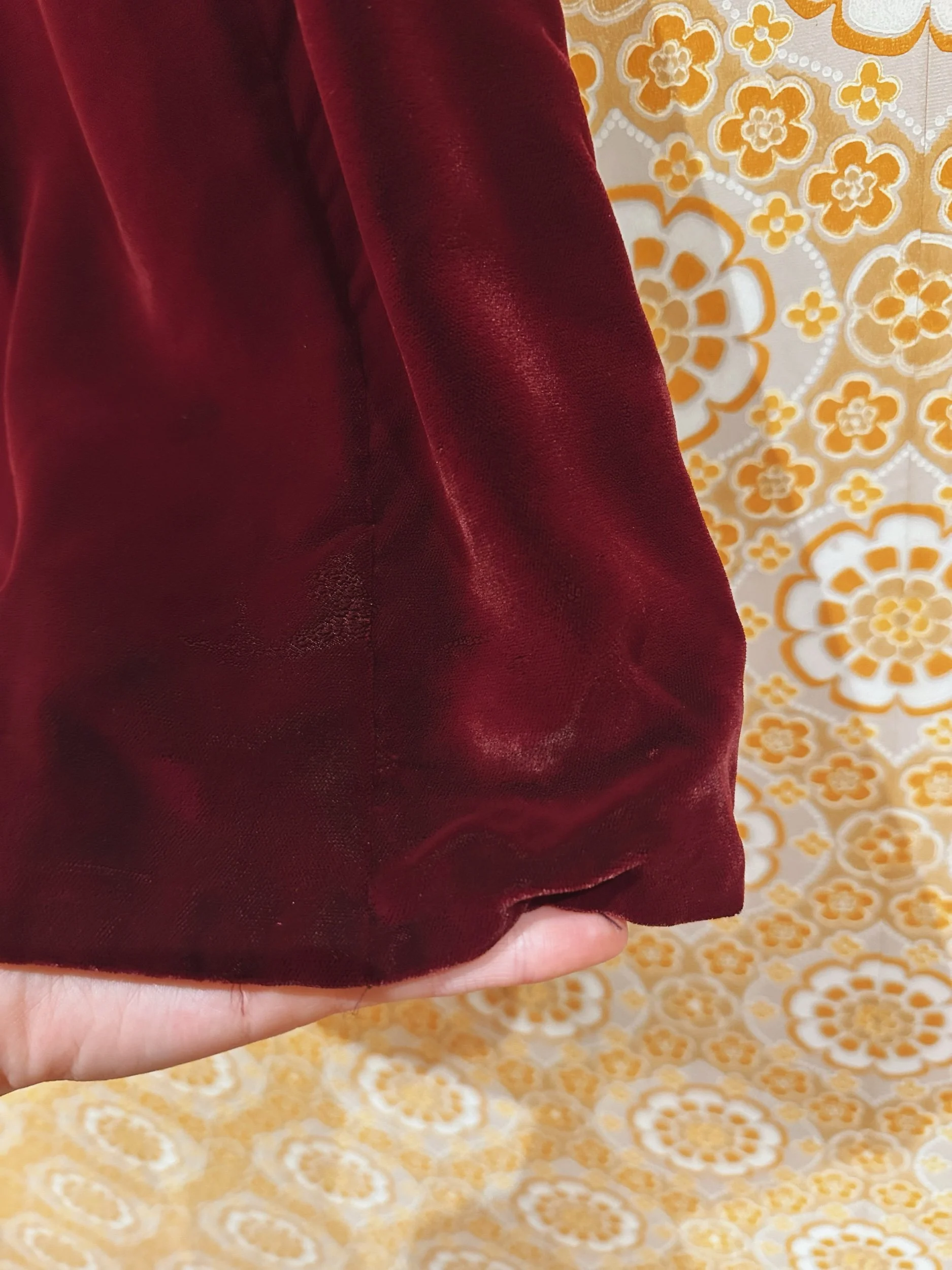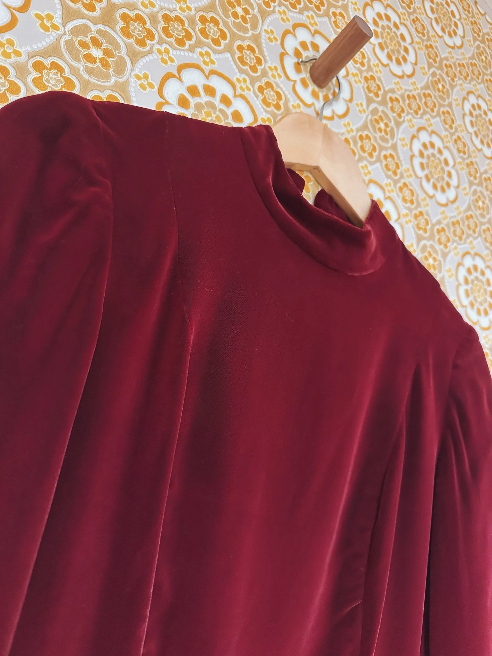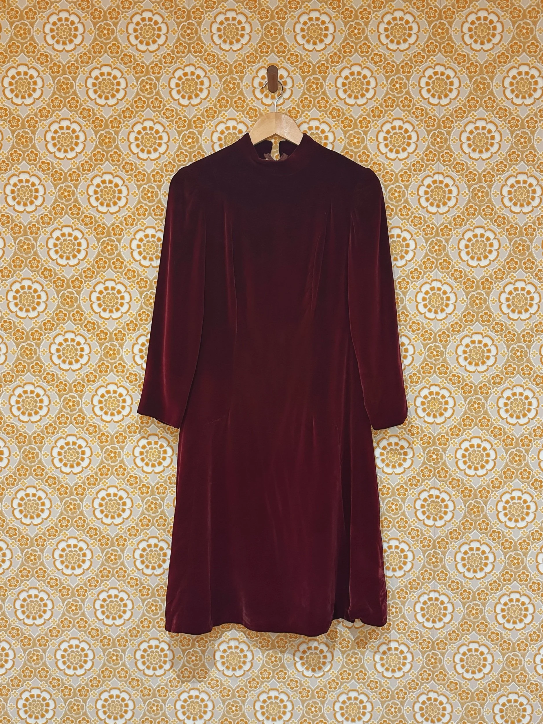 Meet Freya, a super chic velvet midi dress in a deep burgundy colour. Handmade with a high neckline, princess seams and full length sleeves. Fully lined. In a slight A line shape and midi in length, falling at around the calf. Whilst there are no noticeable signs of wear on the outside, the skirt hem has been finished by hand as has the zip at the back.