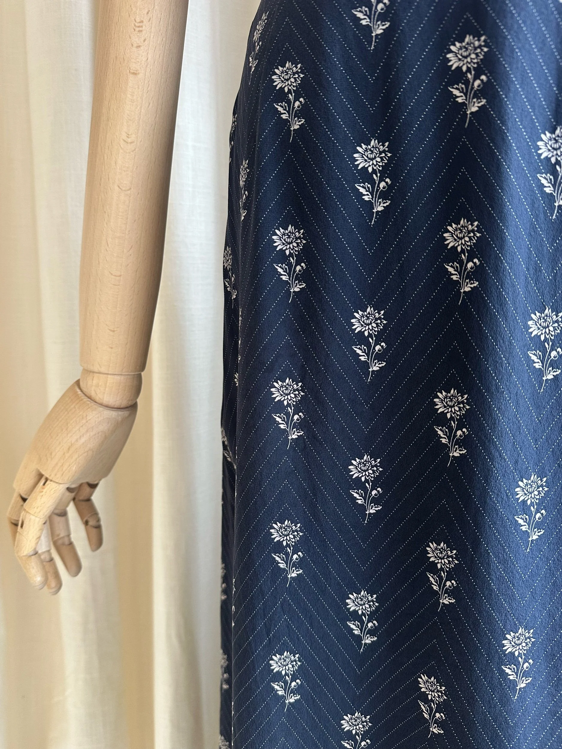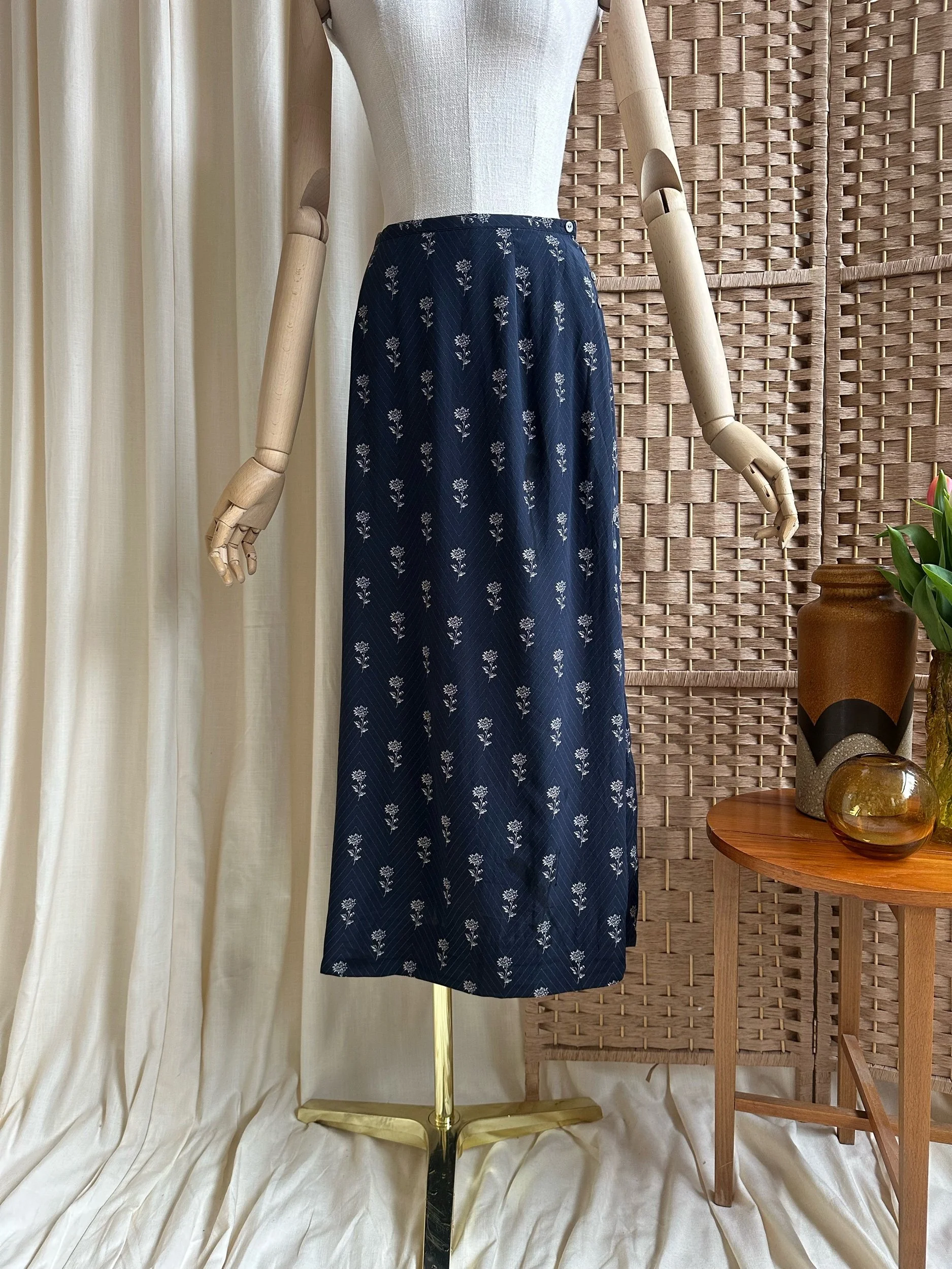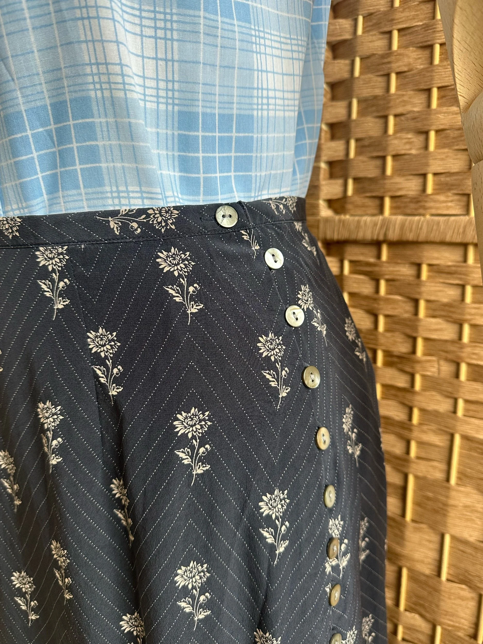 Meet Lianne, a super chic 1990 midi skirt from iconic vintage label “Laura Ashley”. Made from 100% silk, in a navy and cream colourway with a chevron and floral print design. In an A line shape with a button up side and deep slit. A timeless piece with no noticeable signs of wear.