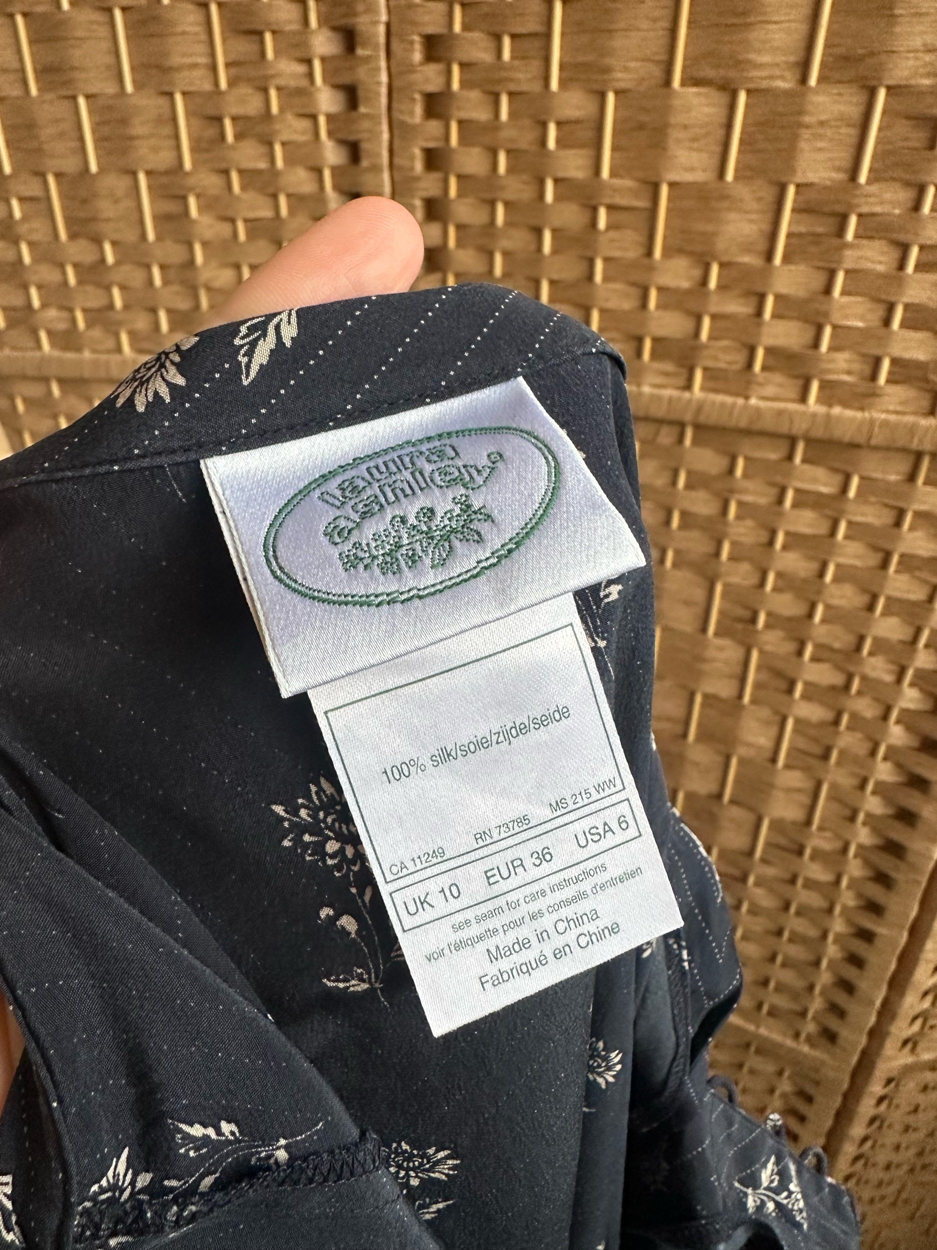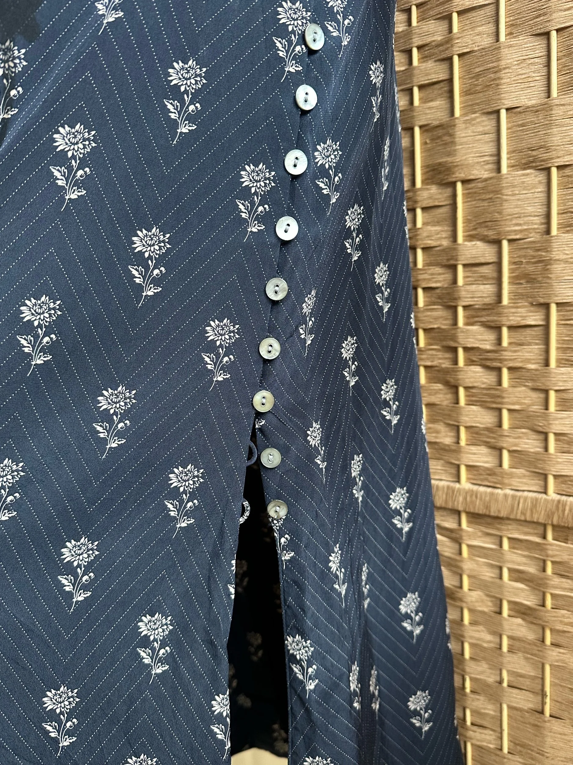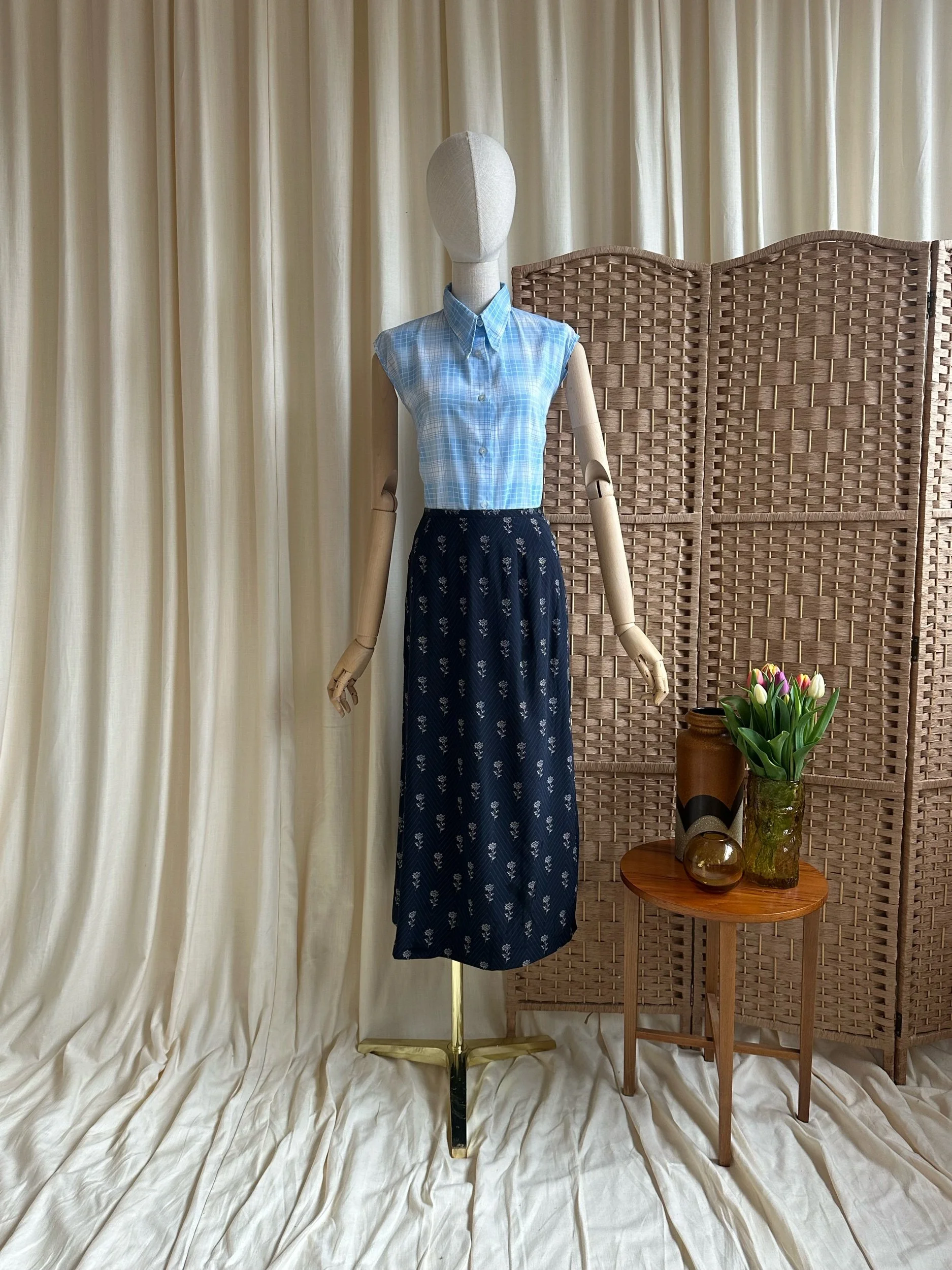 Meet Lianne, a super chic 1990 midi skirt from iconic vintage label “Laura Ashley”. Made from 100% silk, in a navy and cream colourway with a chevron and floral print design. In an A line shape with a button up side and deep slit. A timeless piece with no noticeable signs of wear.