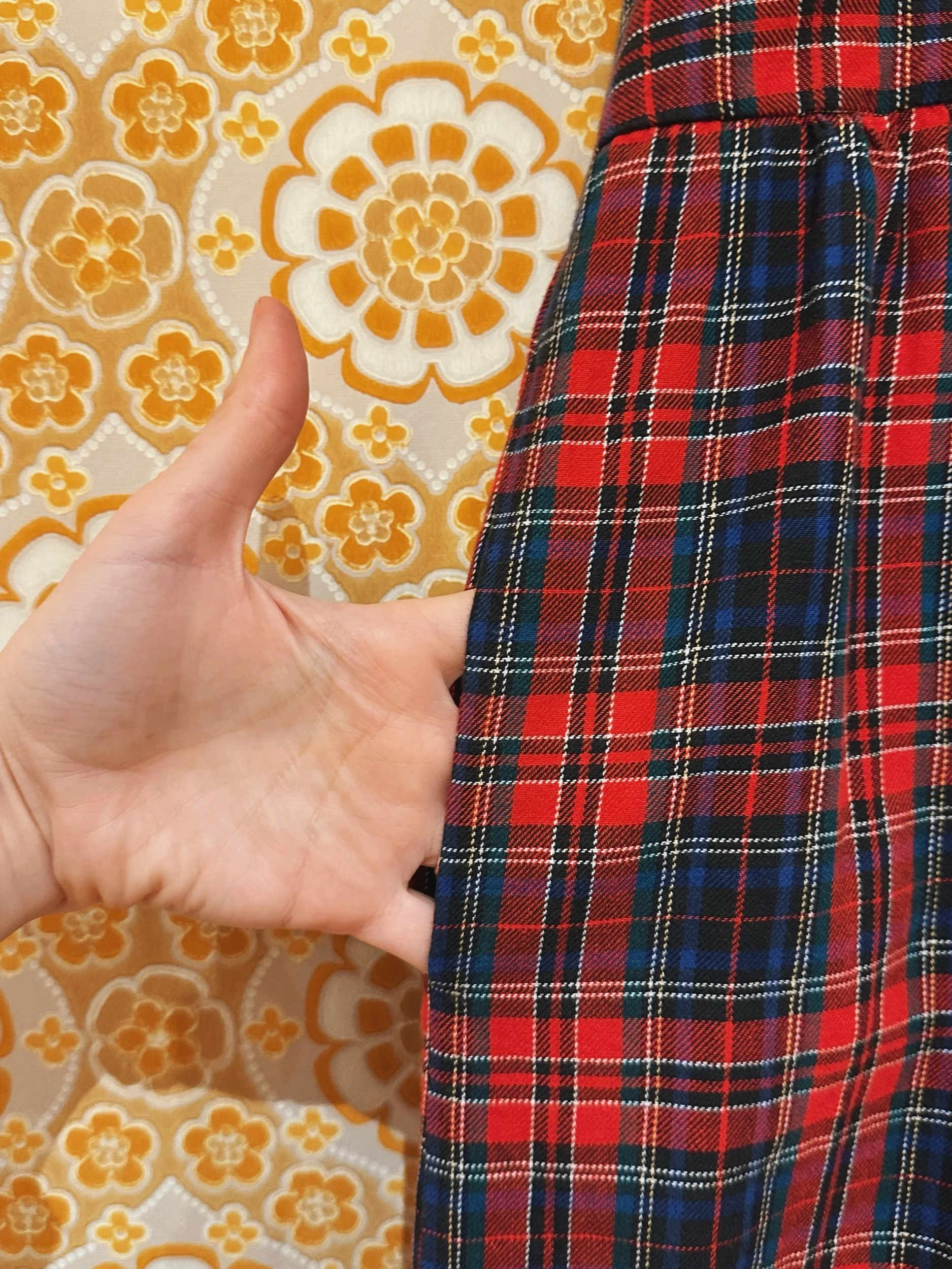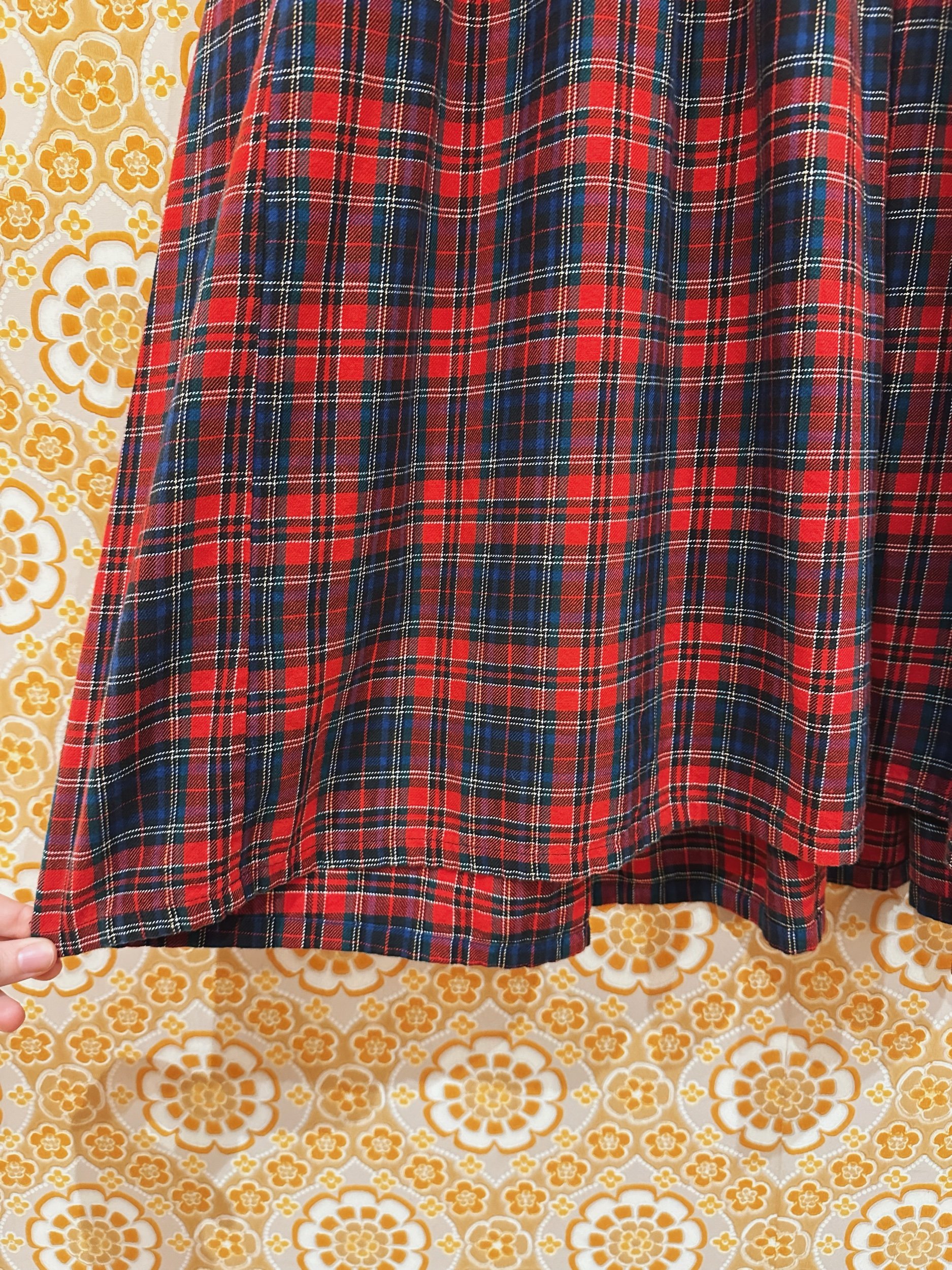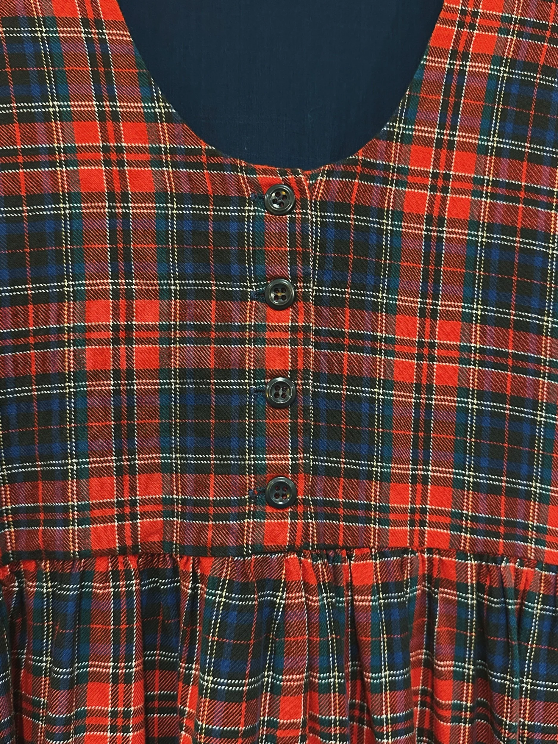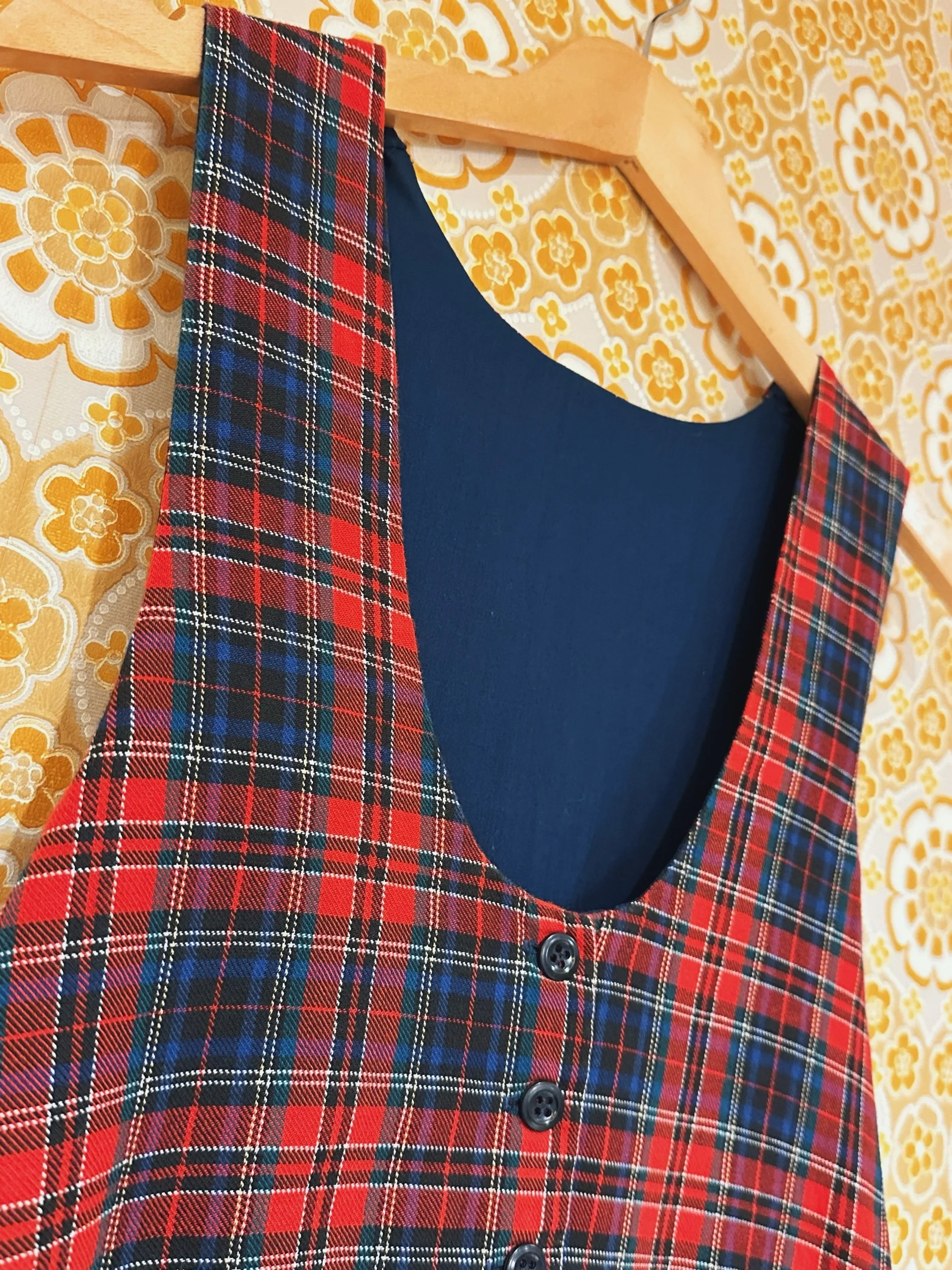 Meet Joy, a delightful 1980s pinafore midi dress in a classic red tartan check. With a scoop neckline, loose fit waist and full skirt which falls to around the calf. With a button down top and concealed pockets in the skirt. This is the ultimate Christmas Day kinda outfit, comfy and festive! With no noticeable signs of wear.