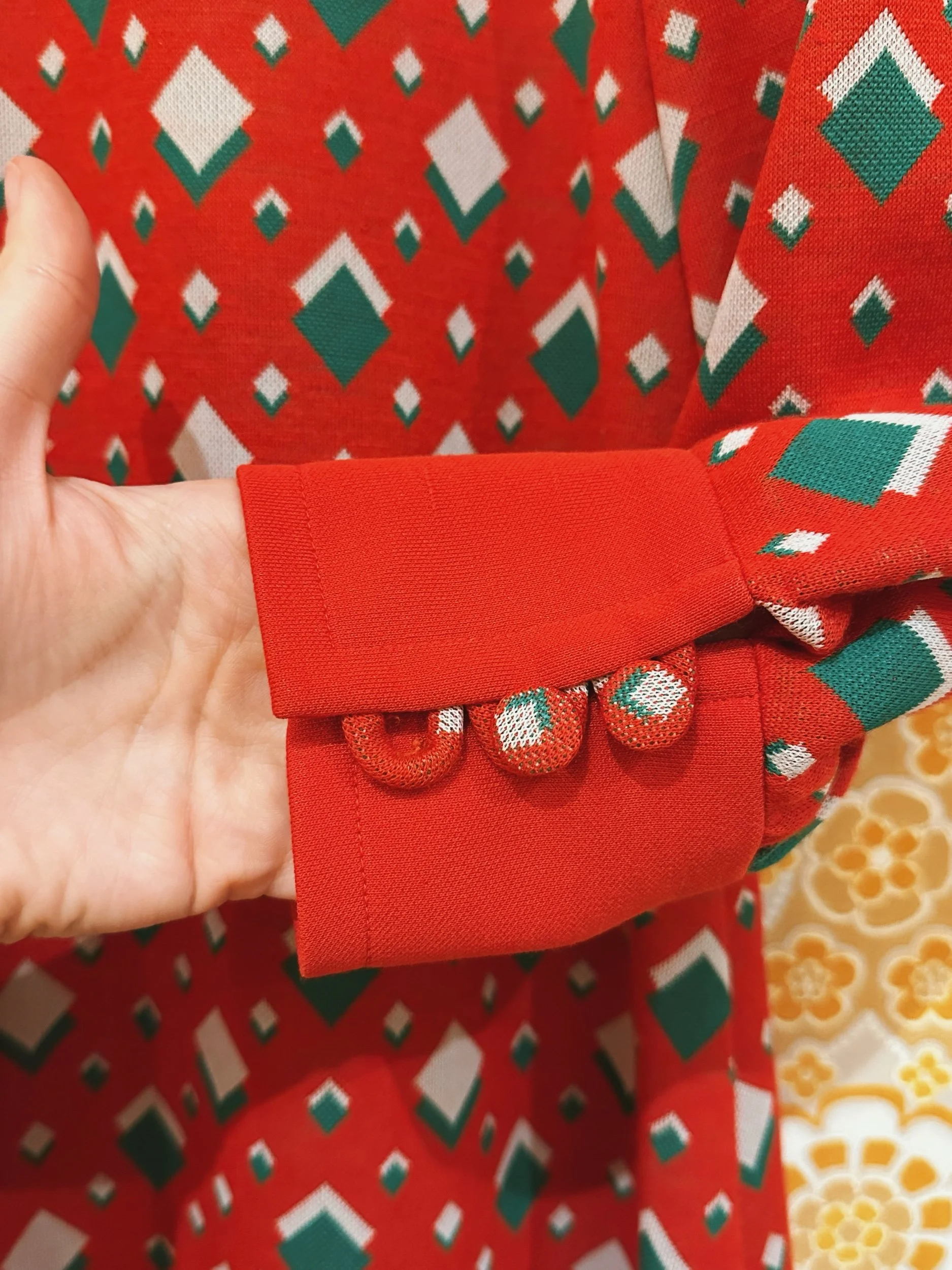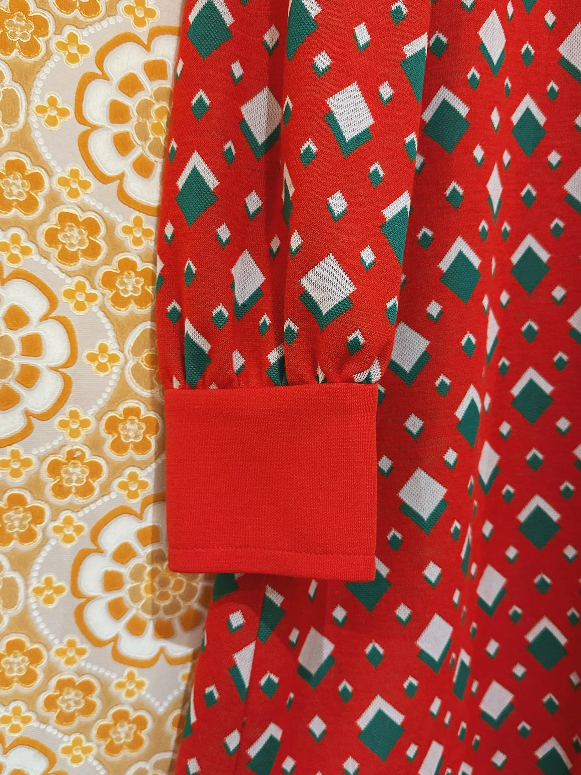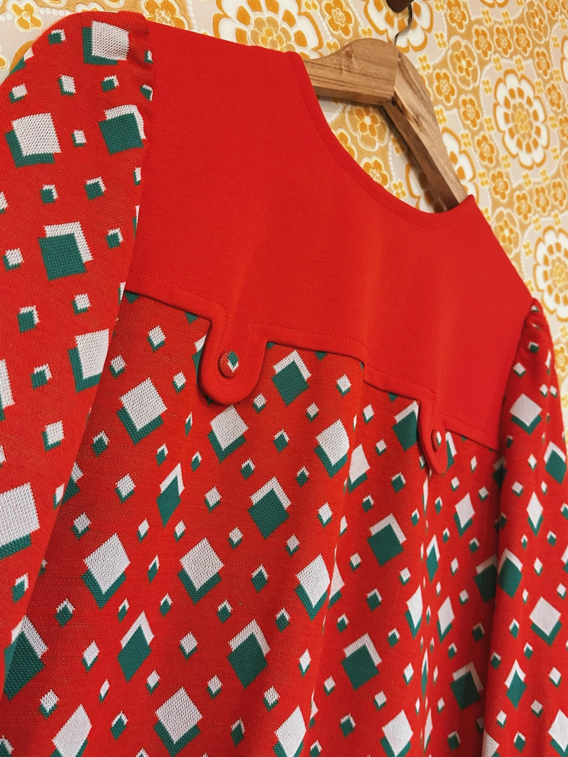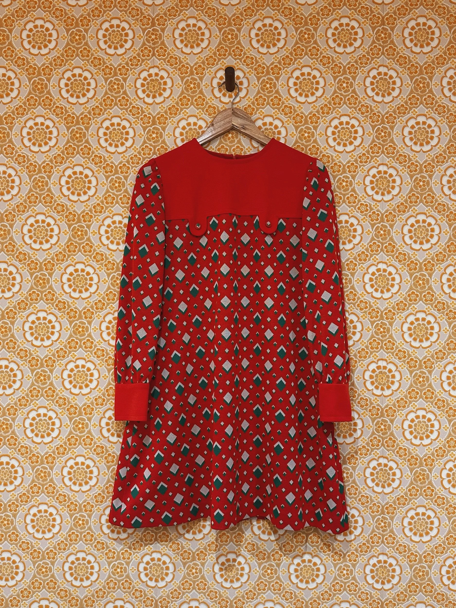 Say hello ho ho to Nicki, a joyful 1960s mini dress in a green and red diamond print. A line in shape with button detailing on the front. With button up cuffs on full length sleeves. Made from 100% polyester fabric. There are no noticeable signs of wear apart from both cuffs have a button missing, I haven’t replaced these as the buttons are covered to match the pattern and I don’t feel it’s hugely noticeable (see photos).