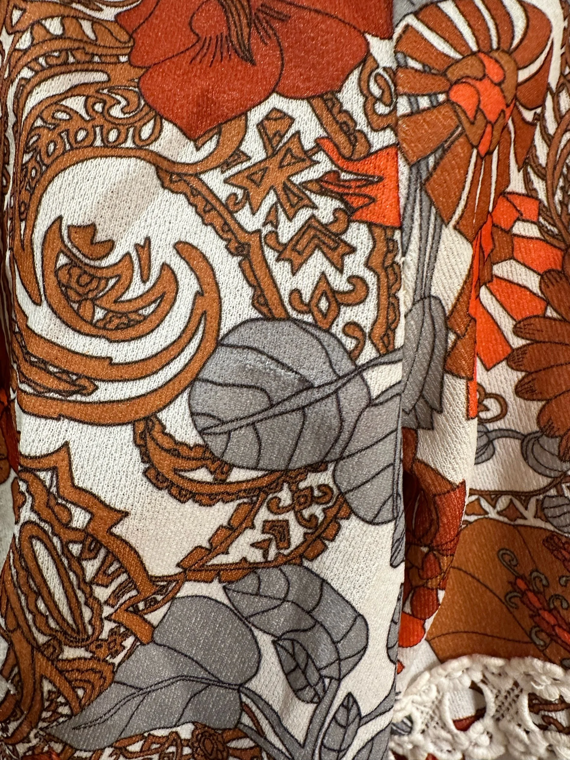 Meet Rusty, the sweetest 1960s mini dress in a decadent retro floral pattern. Made from what feels like a polyester fabric (there are no fabric composition labels) in tones of orange, grey, off white and brown. In an empire line shape with lantern shaped sleeves. Featuring crochet trim across the under bust and on the arms. The skirt is A line and falls above the knee. There are no noticeable signs of wear, a few minor plucks in the fabric but really nothing of note (see photo of most noticeable one).
