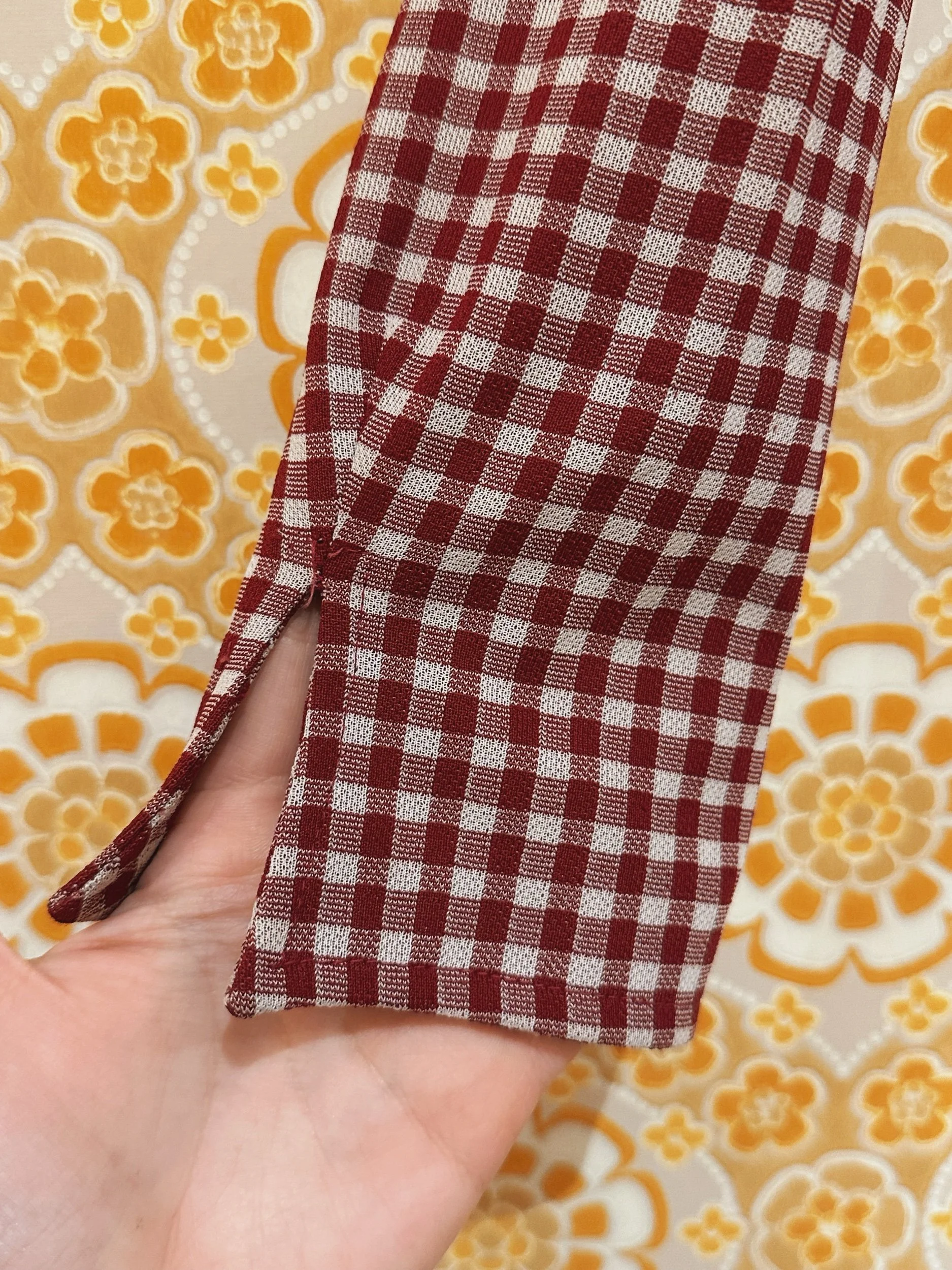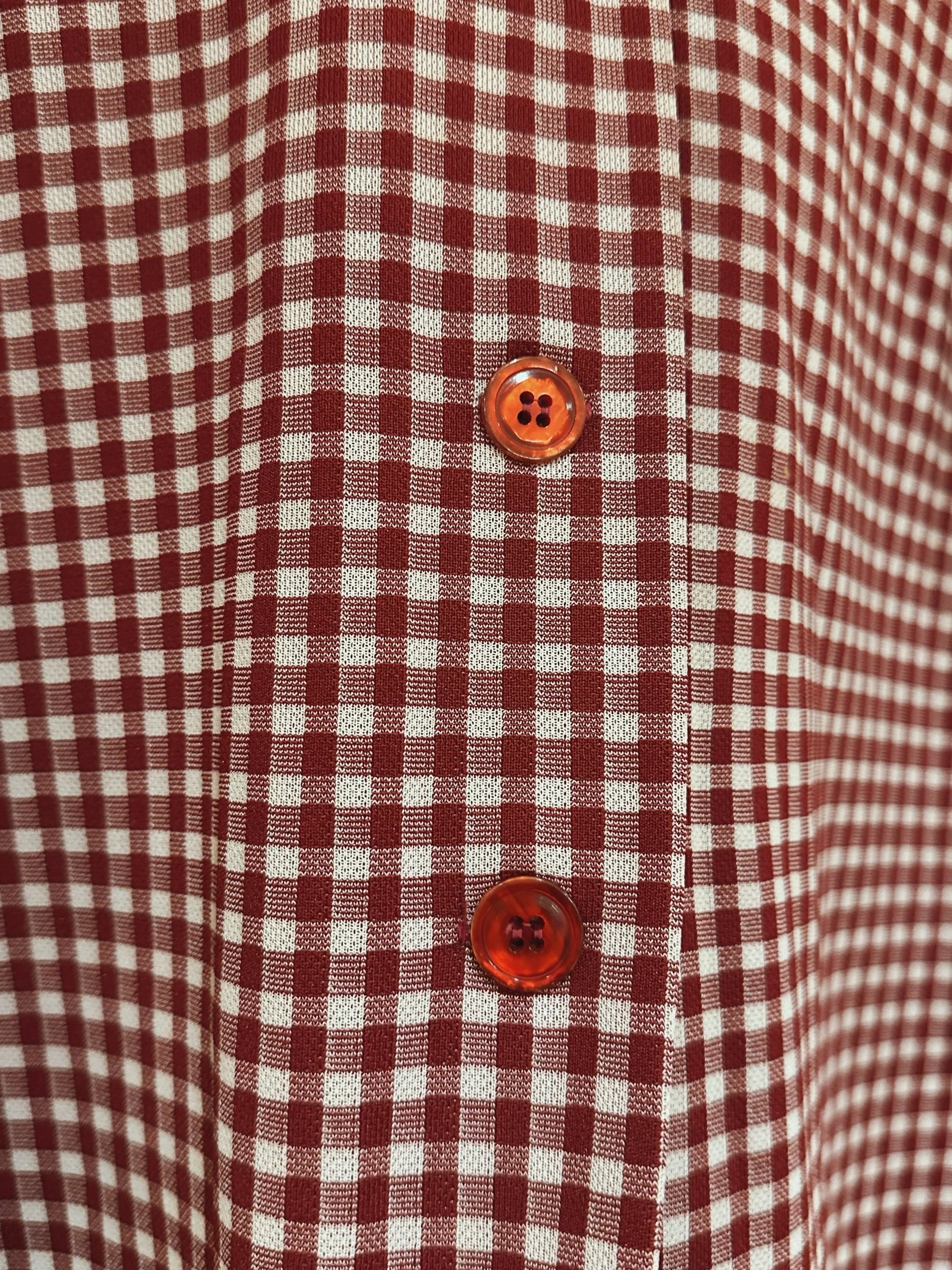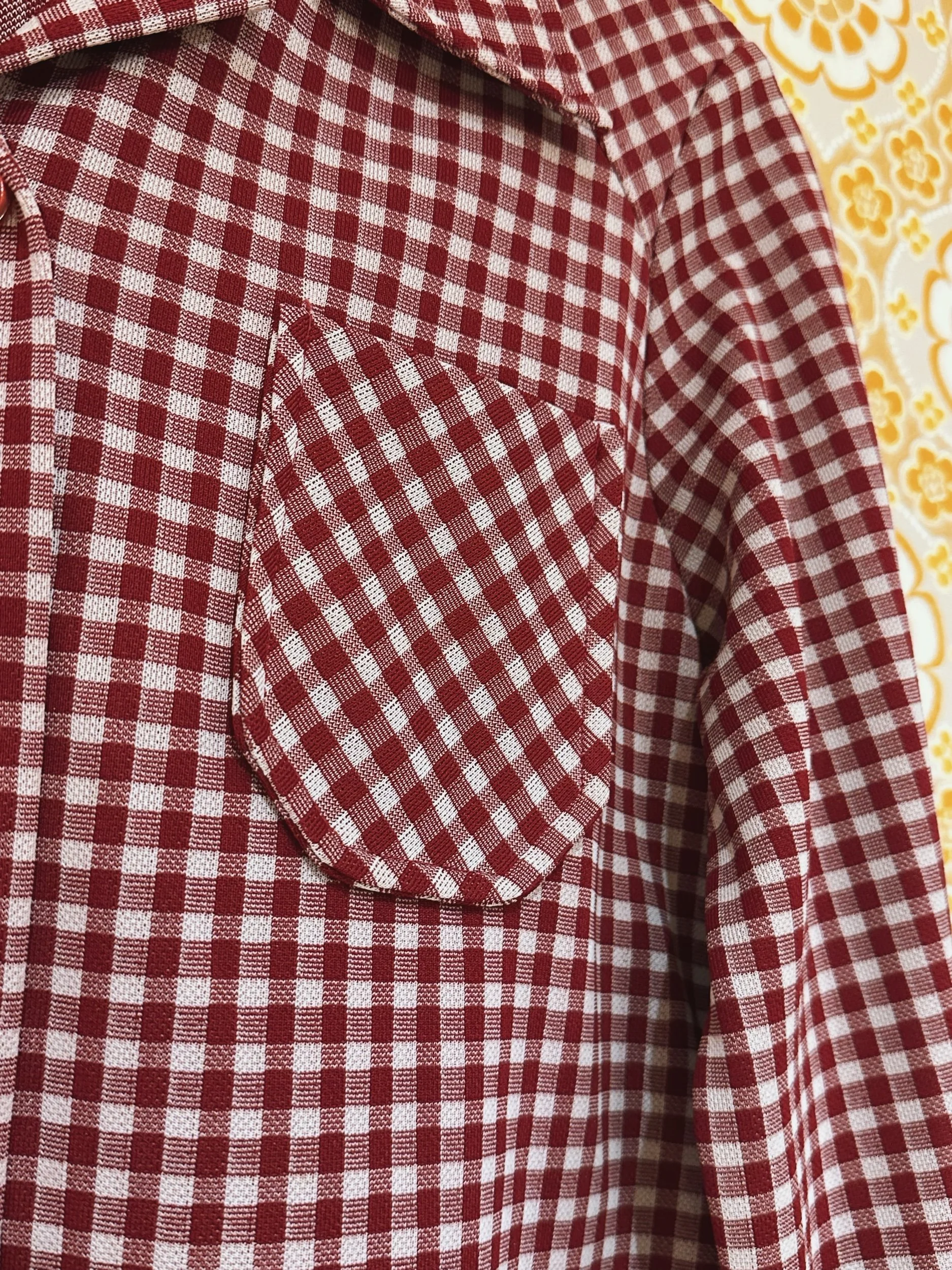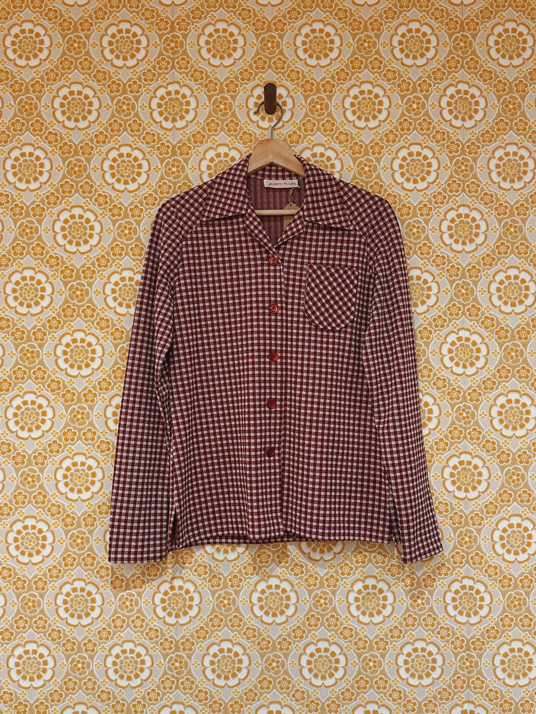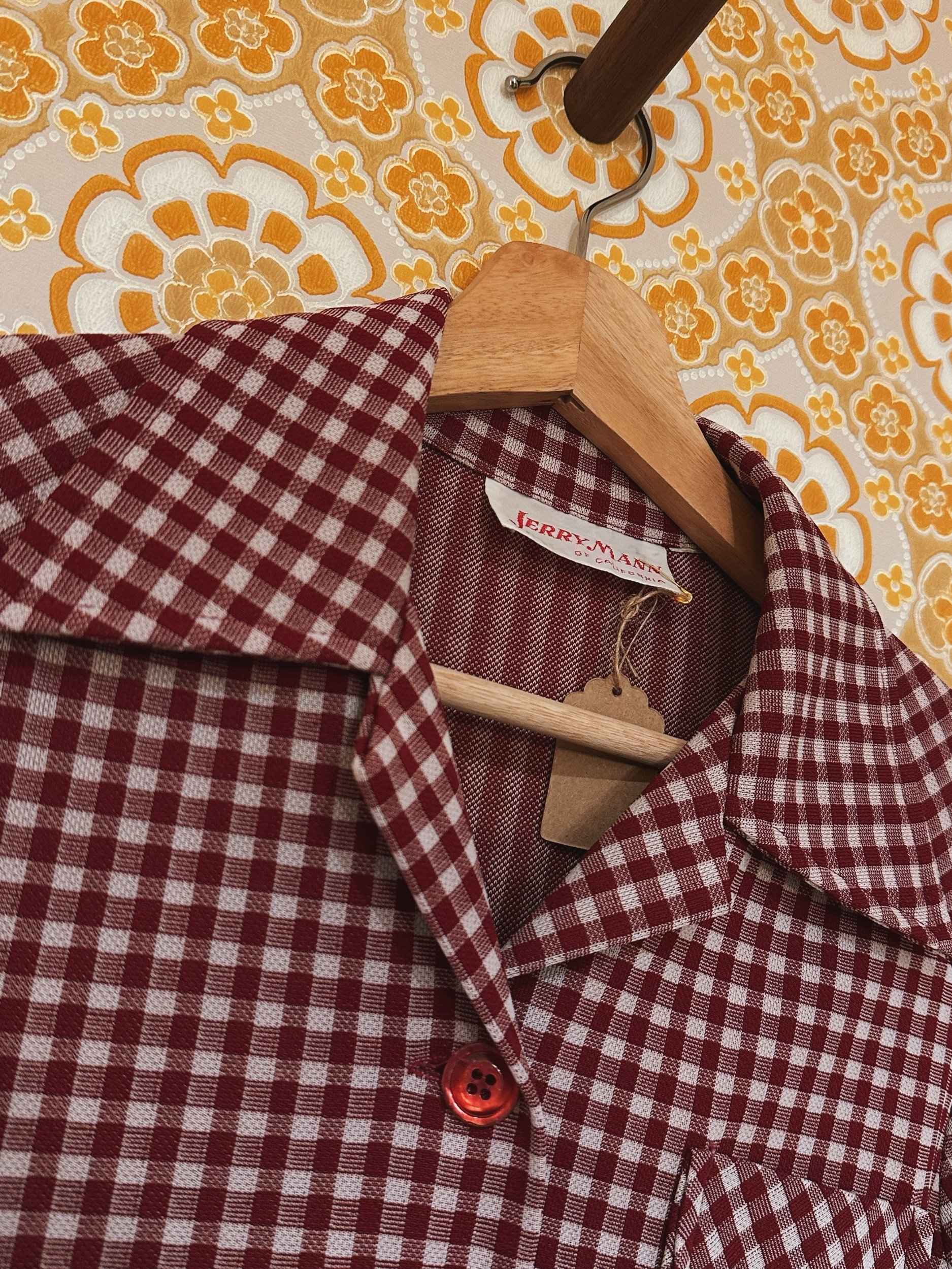 Say hello to Spruce, an effortlessly cool 1970s shirt in a burgundy and off white gingham check. In what feels like a polyester fabric with some slight stretch. The shape is a standard fit with a dagger collar, one front pocket and a button down front. With no noticeable signs of wear.